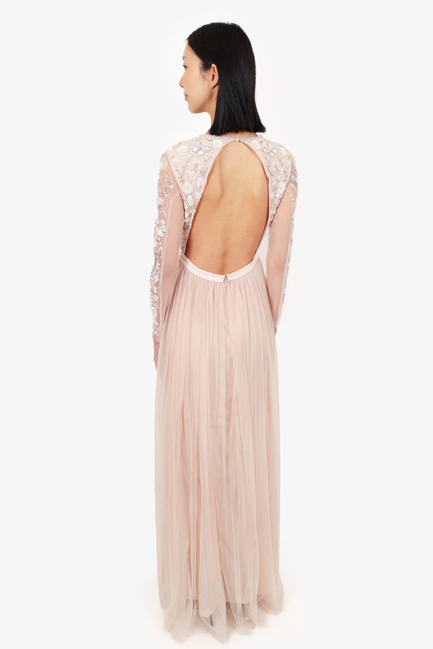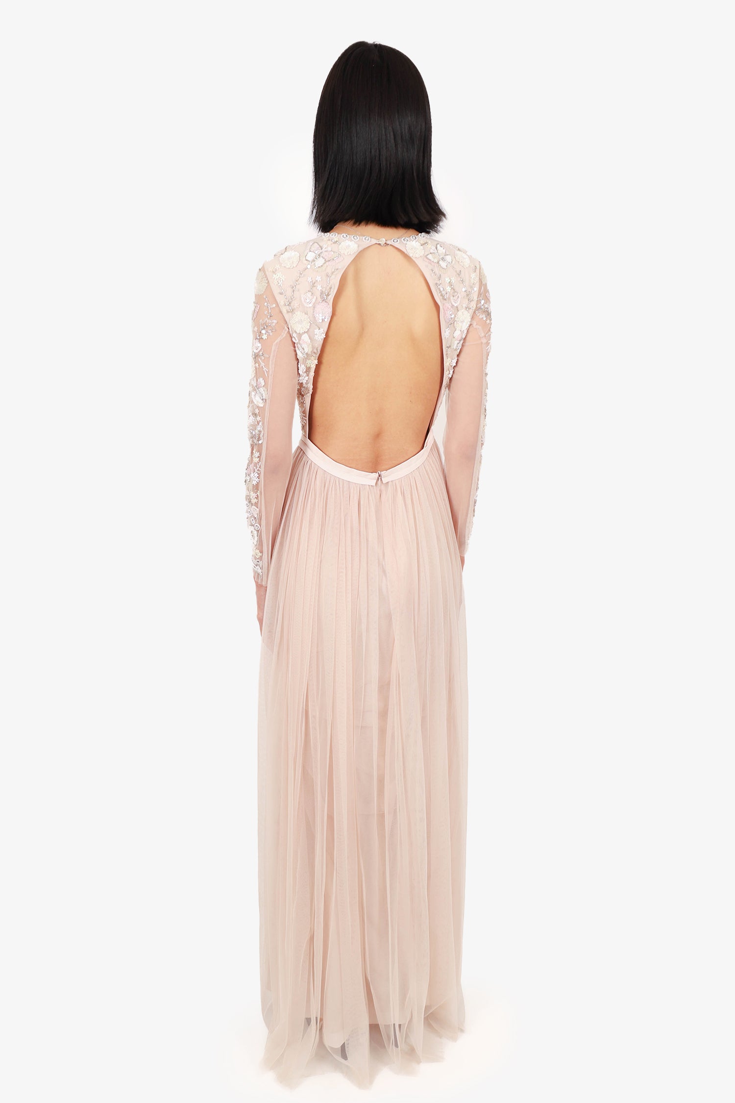 Refresh availabilityNeedle and Thread Pink Beaded Mesh Gown. Round neckline. Open back with rear zip closure. Lined. Tonal stitching.