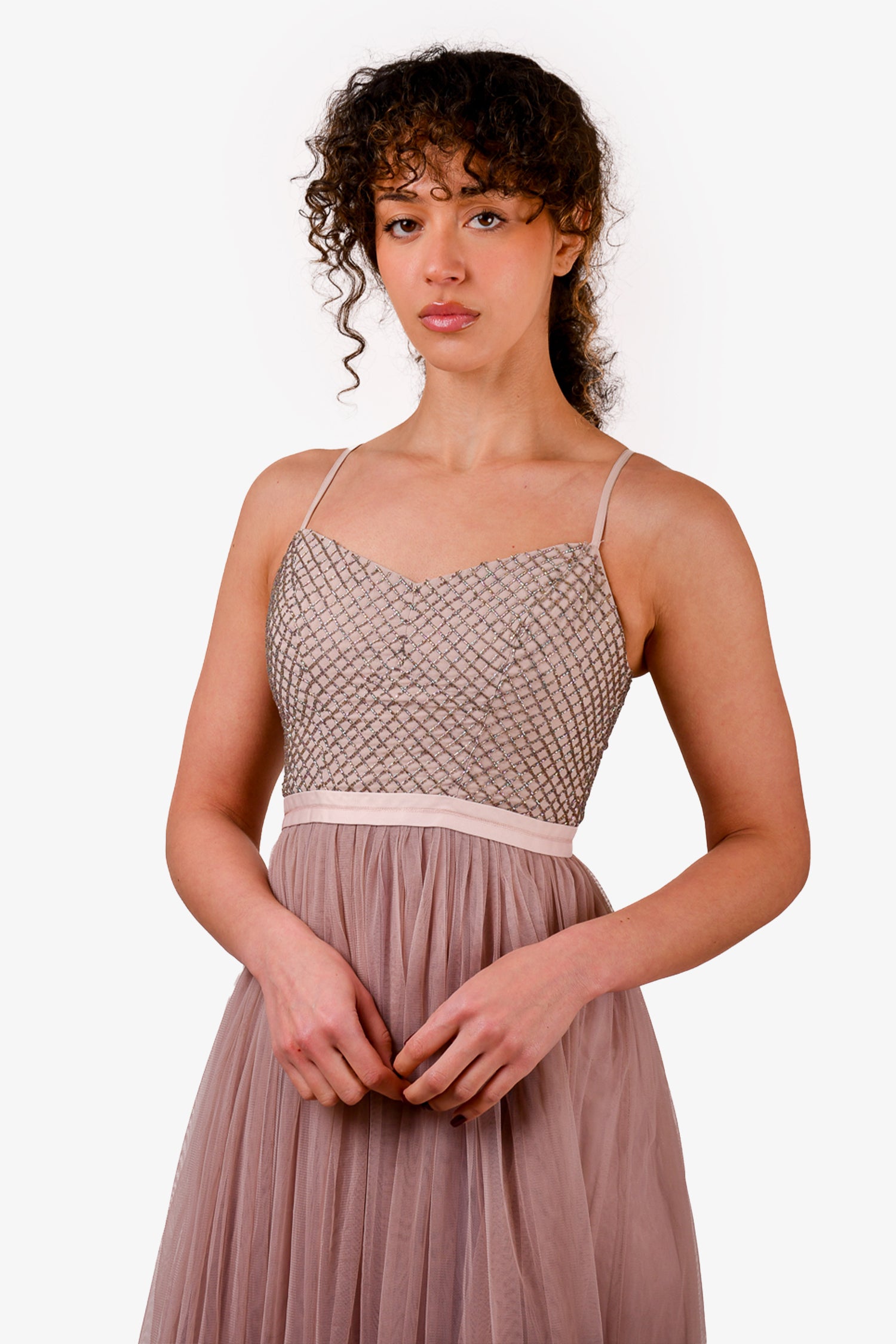 Refresh availabilityNeedle & Thread Taupe Tulle Beaded Midi Dress. Rear zip closure. Lined. Adjustable straps. Tonal stitching.