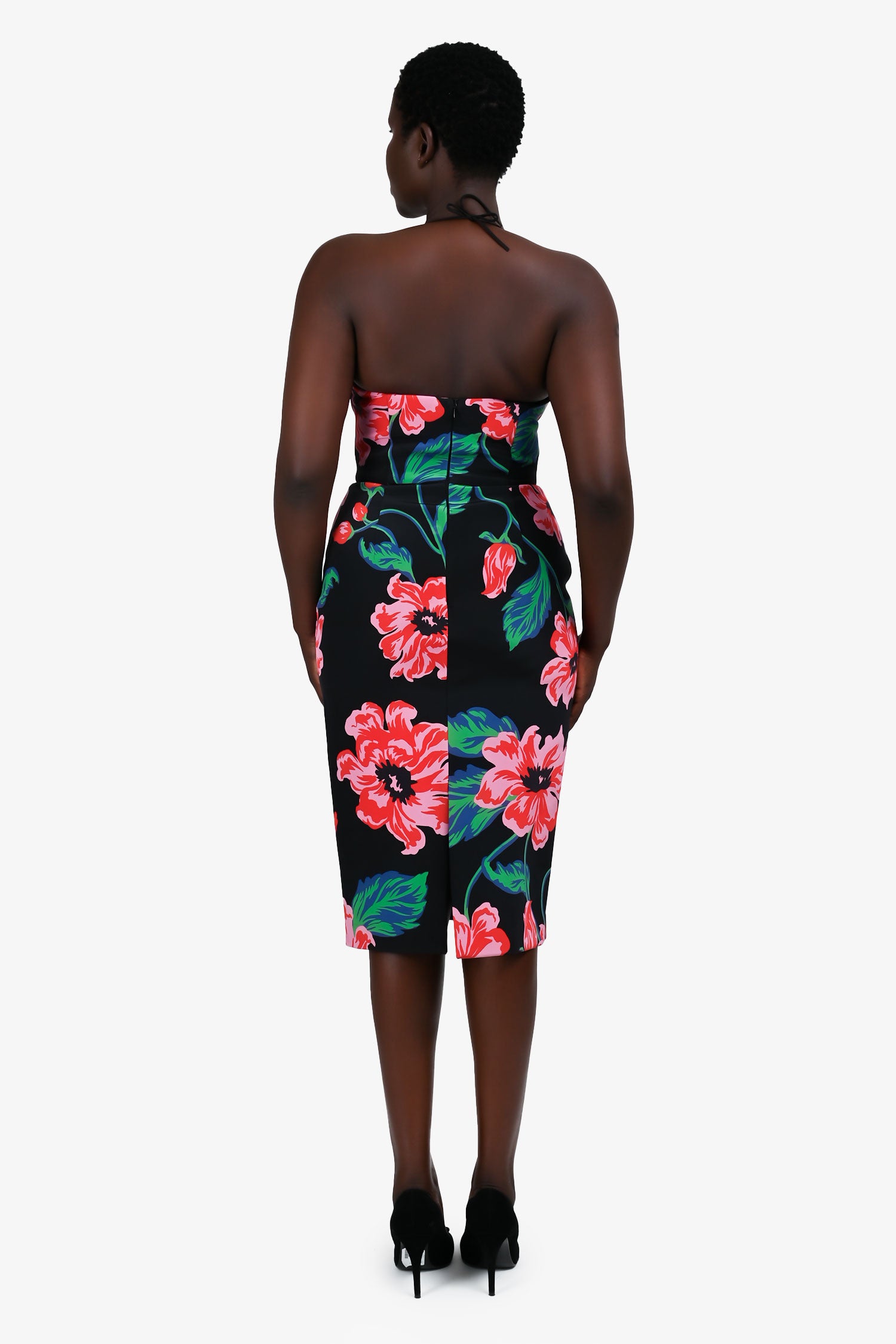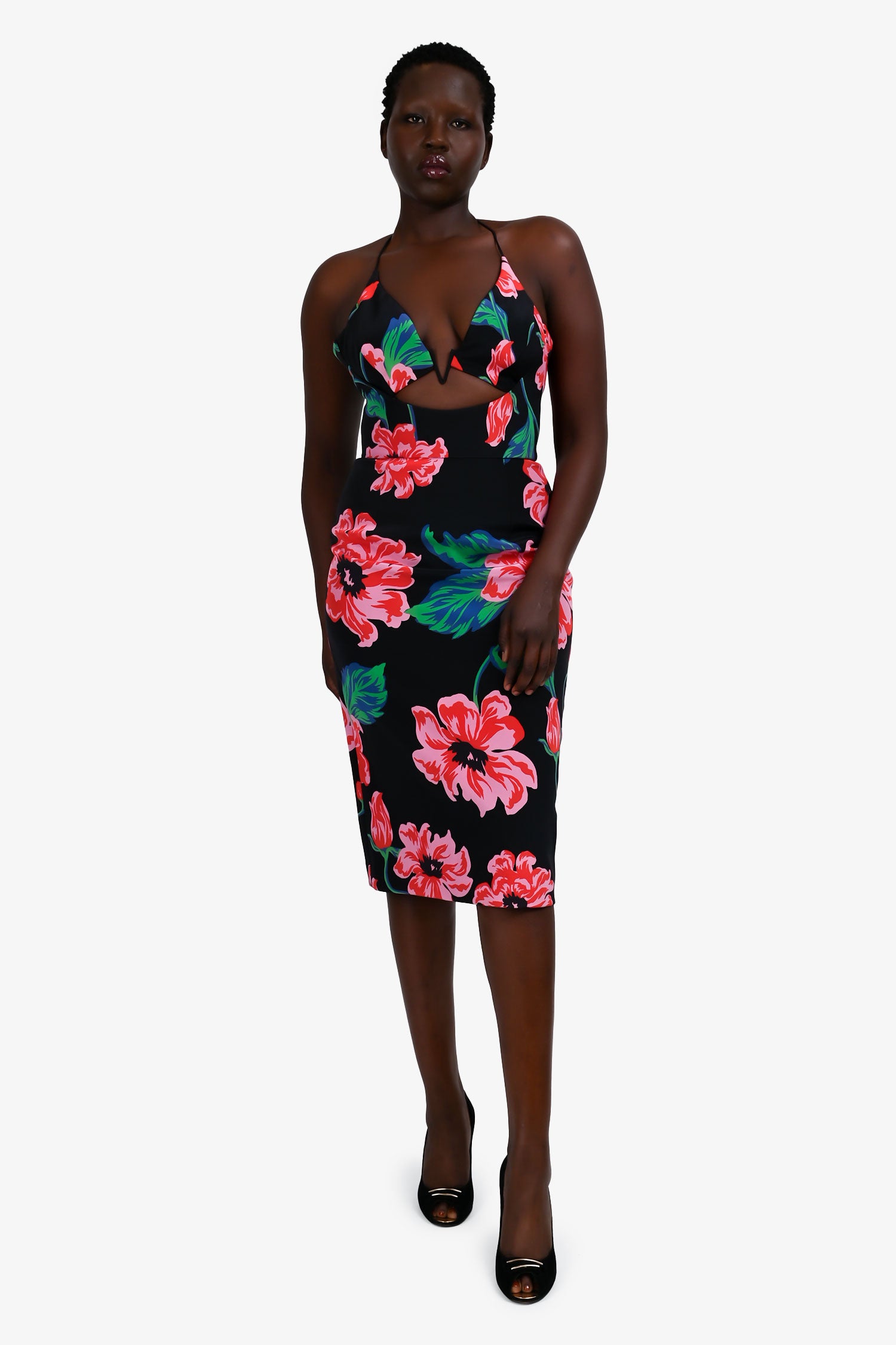 Refresh availabilityNicholas Black Floral Cut-Out Sleeveless Dress. Rear zip and hook closure. Lined. Tie-up halter strap.
