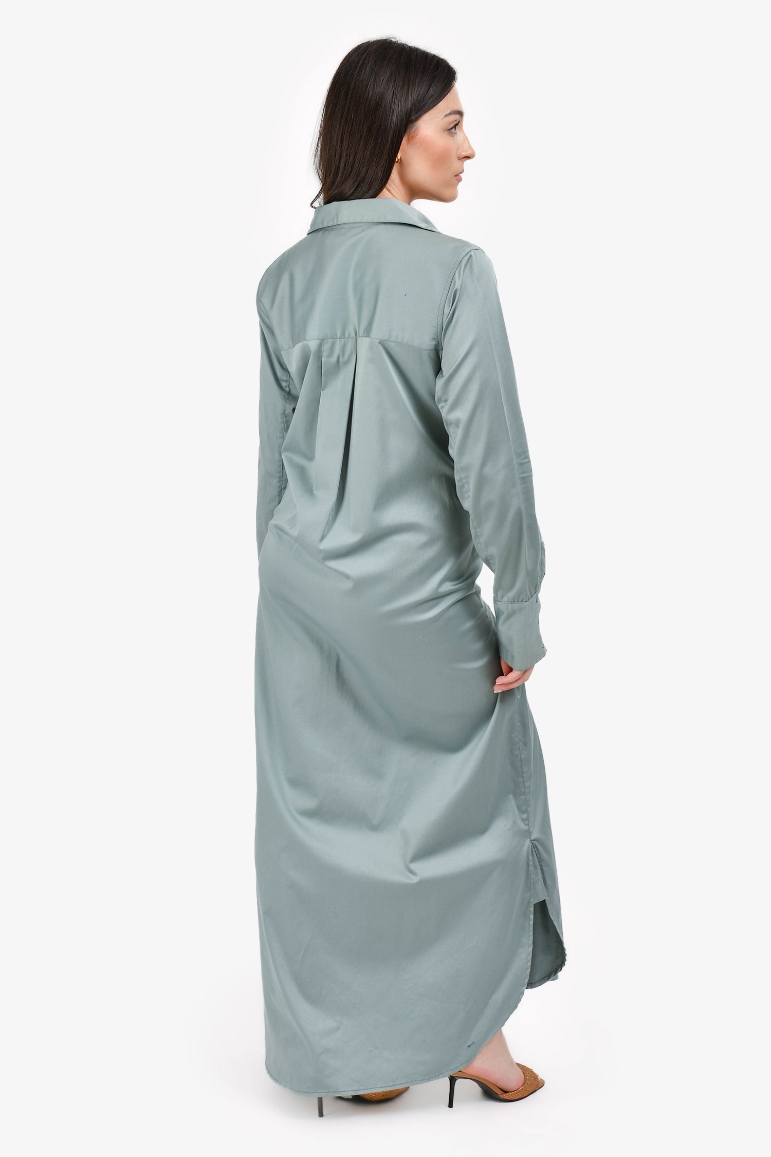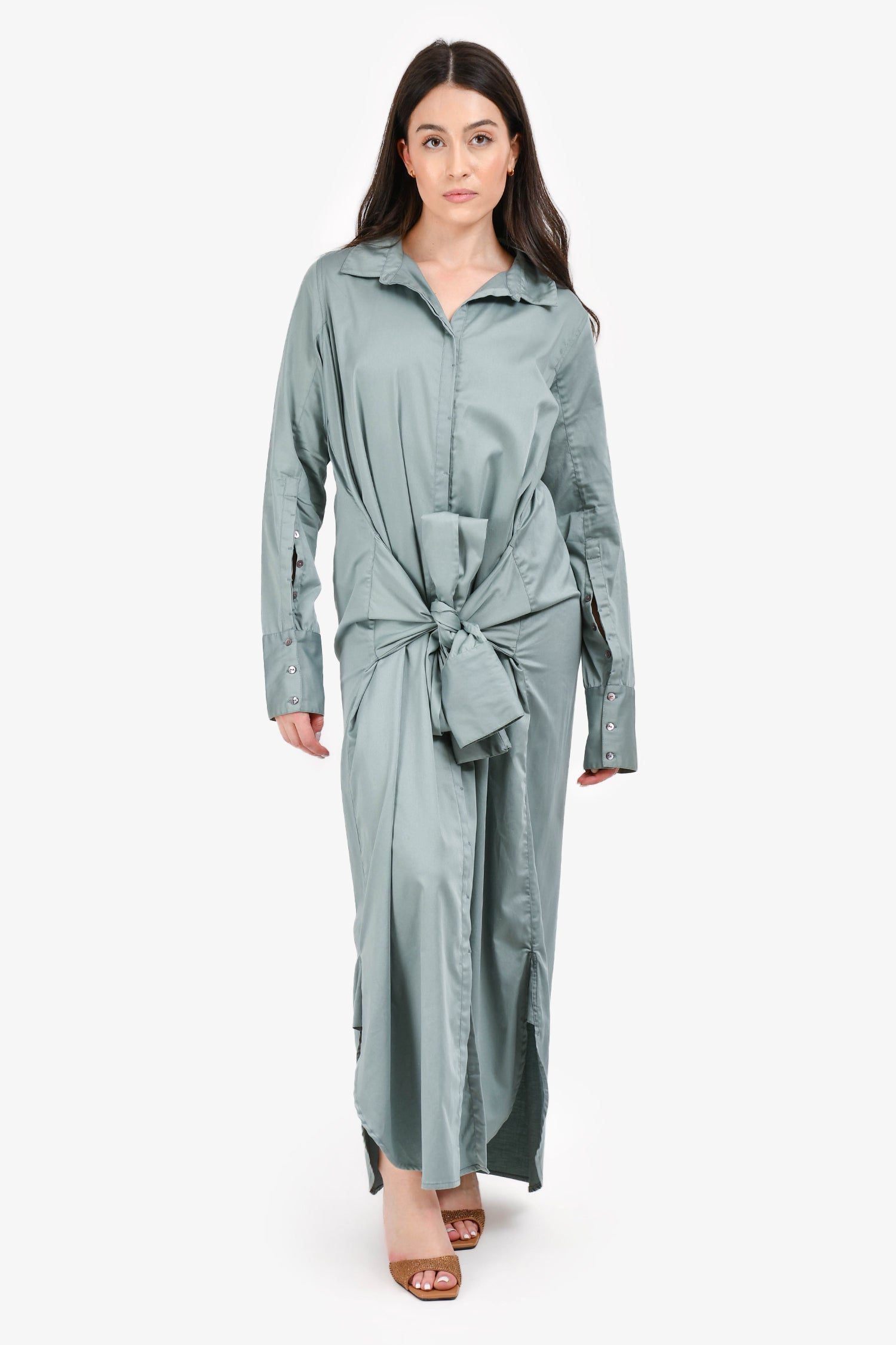 Refresh availabilityNicholas K Blue Button-Up Midi Shirt Dress with Waist Tie. Button-up closure. Collared neckline. Long sleeves. Button cuffs. Waist tie detail. Curved hem. Midi length. Tonal stitching.