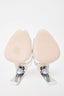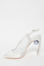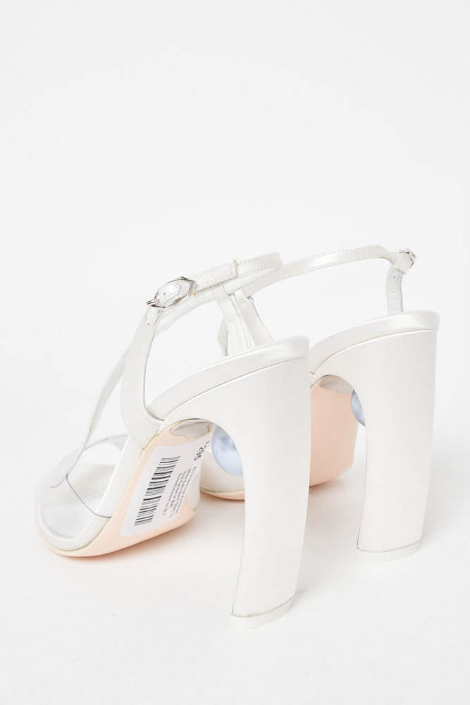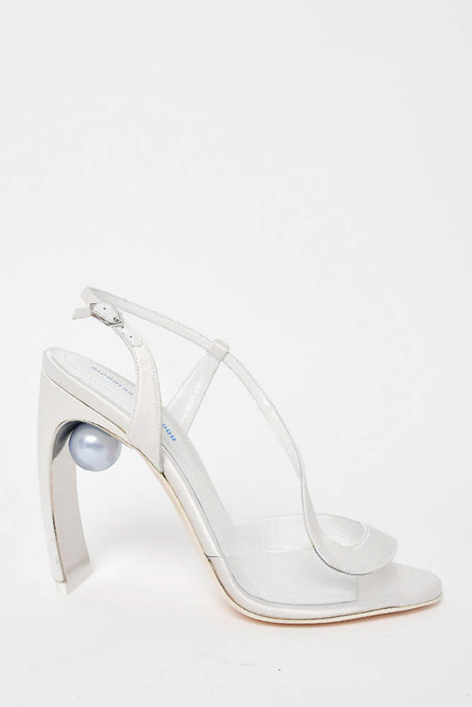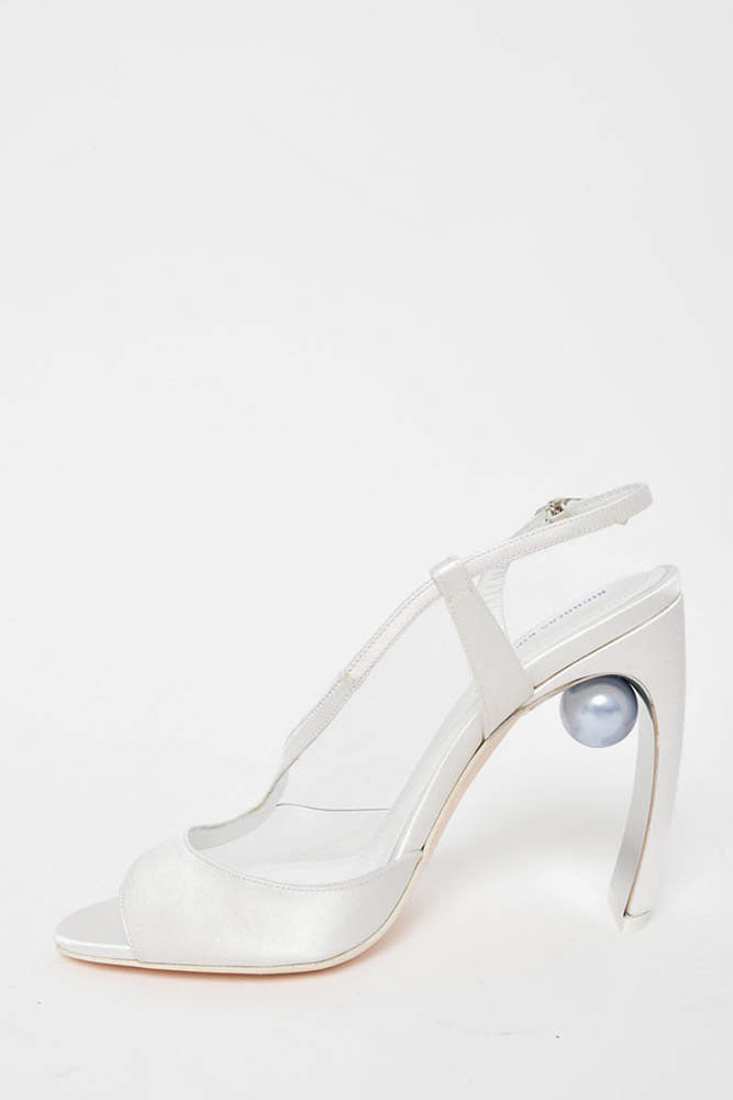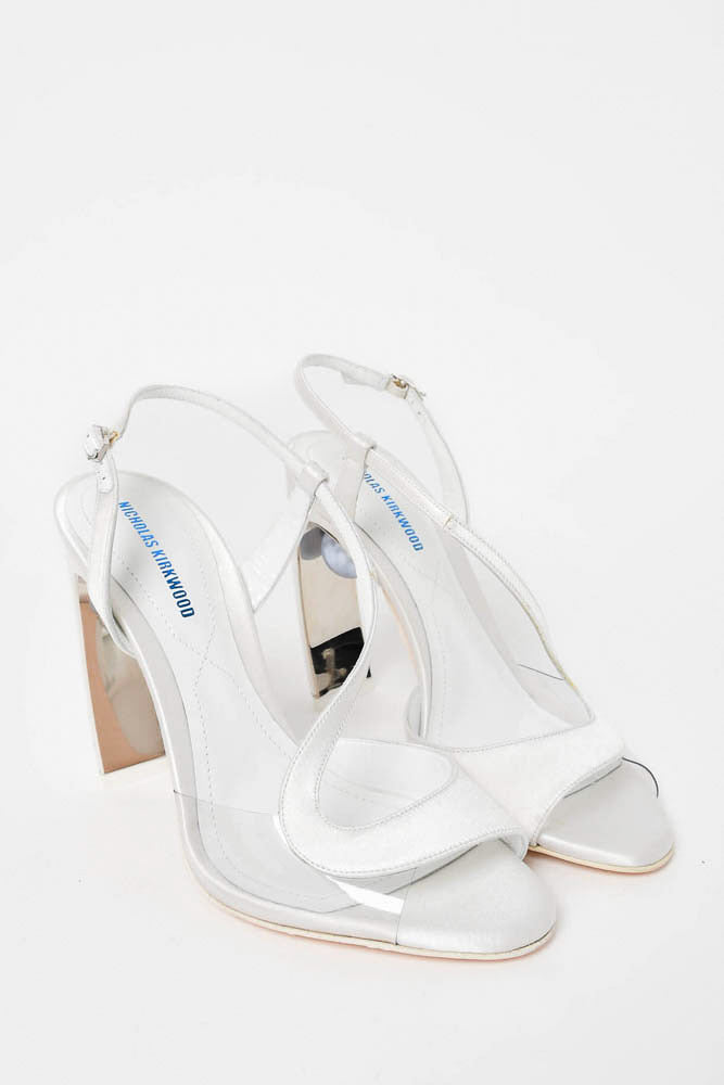 Refresh availabilityNicholas Kirkwood White Satin Swirl Open Toe Heel Sandal with Ball Embellishment. Ankle strap with buckle closure. Mirror detail on heel interior. Pointed toe. Tonal stitching.