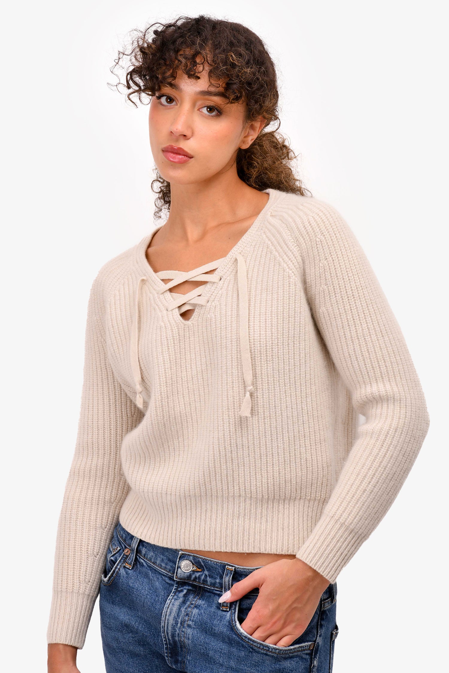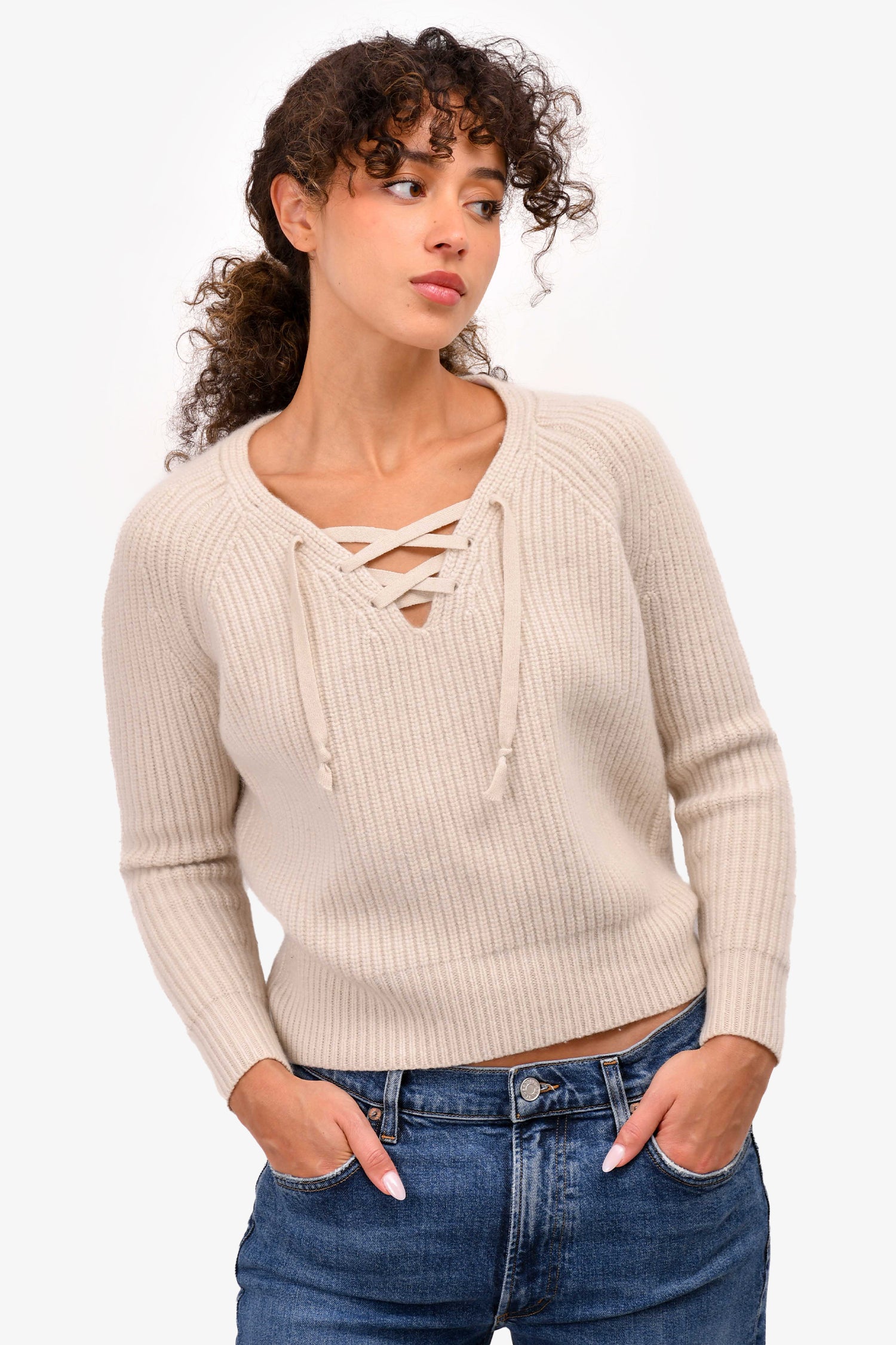 Nili Lotan Light Grey Cashmere Knit 'Alix' Lace-Up Sweater. Ribbed at the collar, hem and sleeves. Tonal stitching.