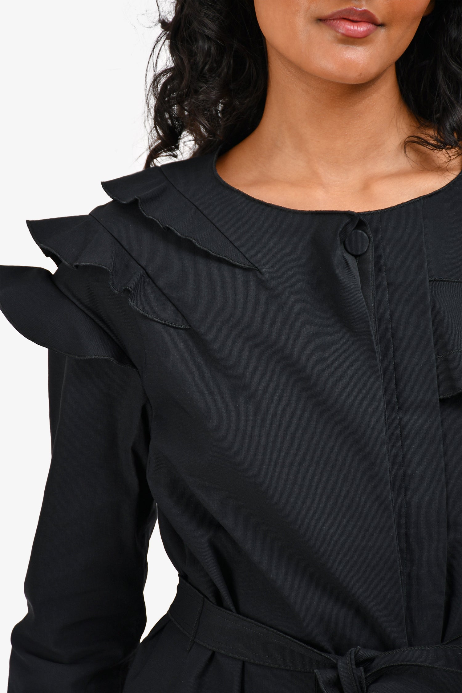 Refresh availabilityNina Ricci Black Ruffle Belted Trench Coat. Front button-down closure. Tie-up waist belt. Ruffles at collar and shoulders. 2 side slip pockets. Unlined. Tonal stitching.