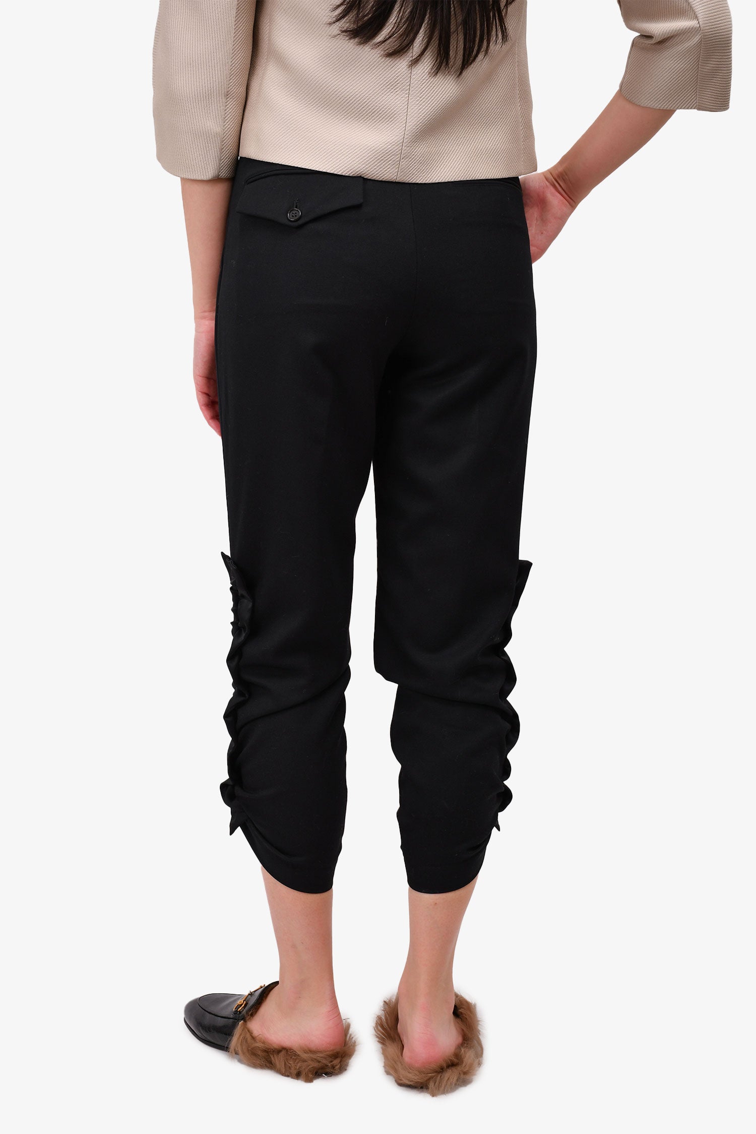 Refresh availabilityNoir Kei Ninomiya Black Wool Trousers With Ruched Satin Cuff. Fly hook zipper closure. Silver-tone hardware. Silk detailing on the side ruching. Two front and back pockets. Tonal stitching.