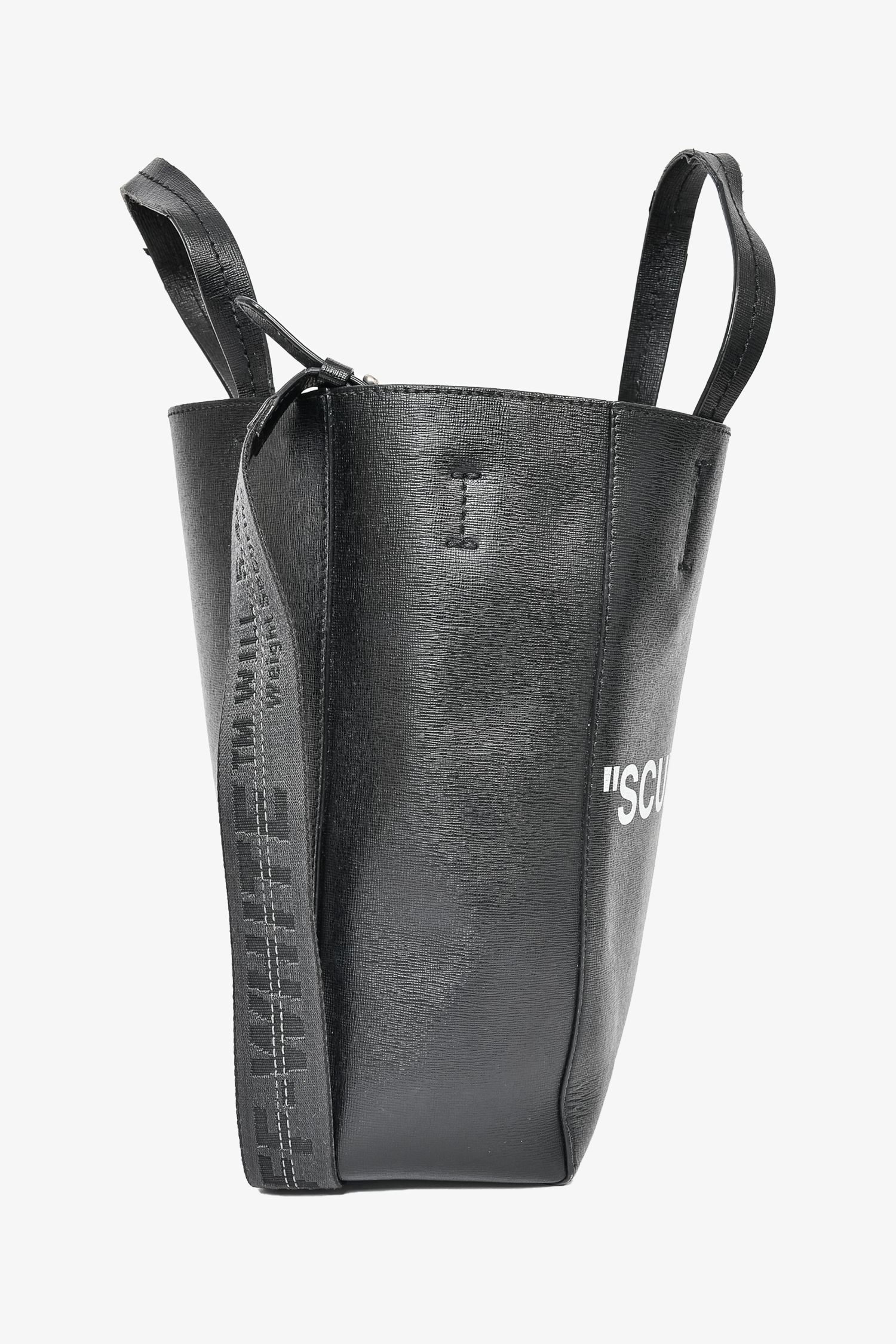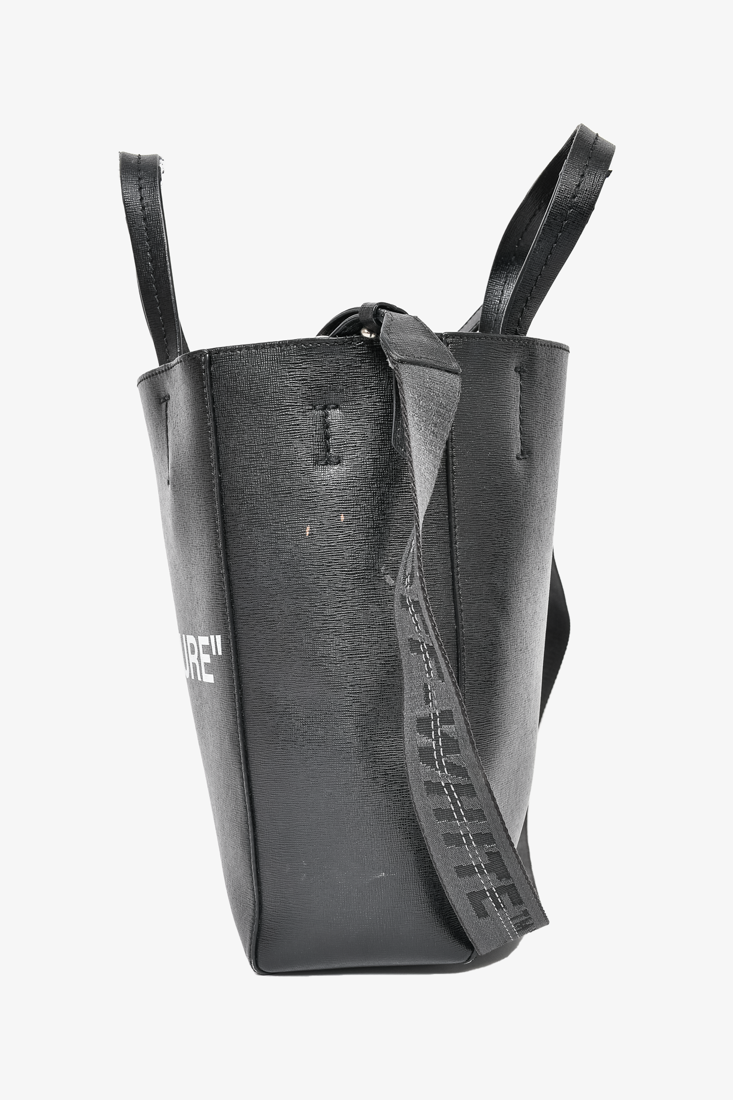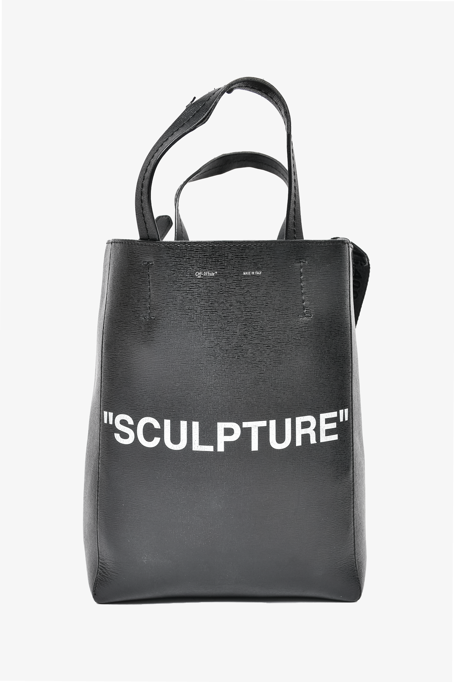 Refresh availabilityOff-White Black Leather 'Sculpture' Crossbody Tote Bag. Twin handles. Adjustable strap. 1 interior wall zip pocket. 1 interior billfold compartment. Silver-toned hardware. Tonal stitching