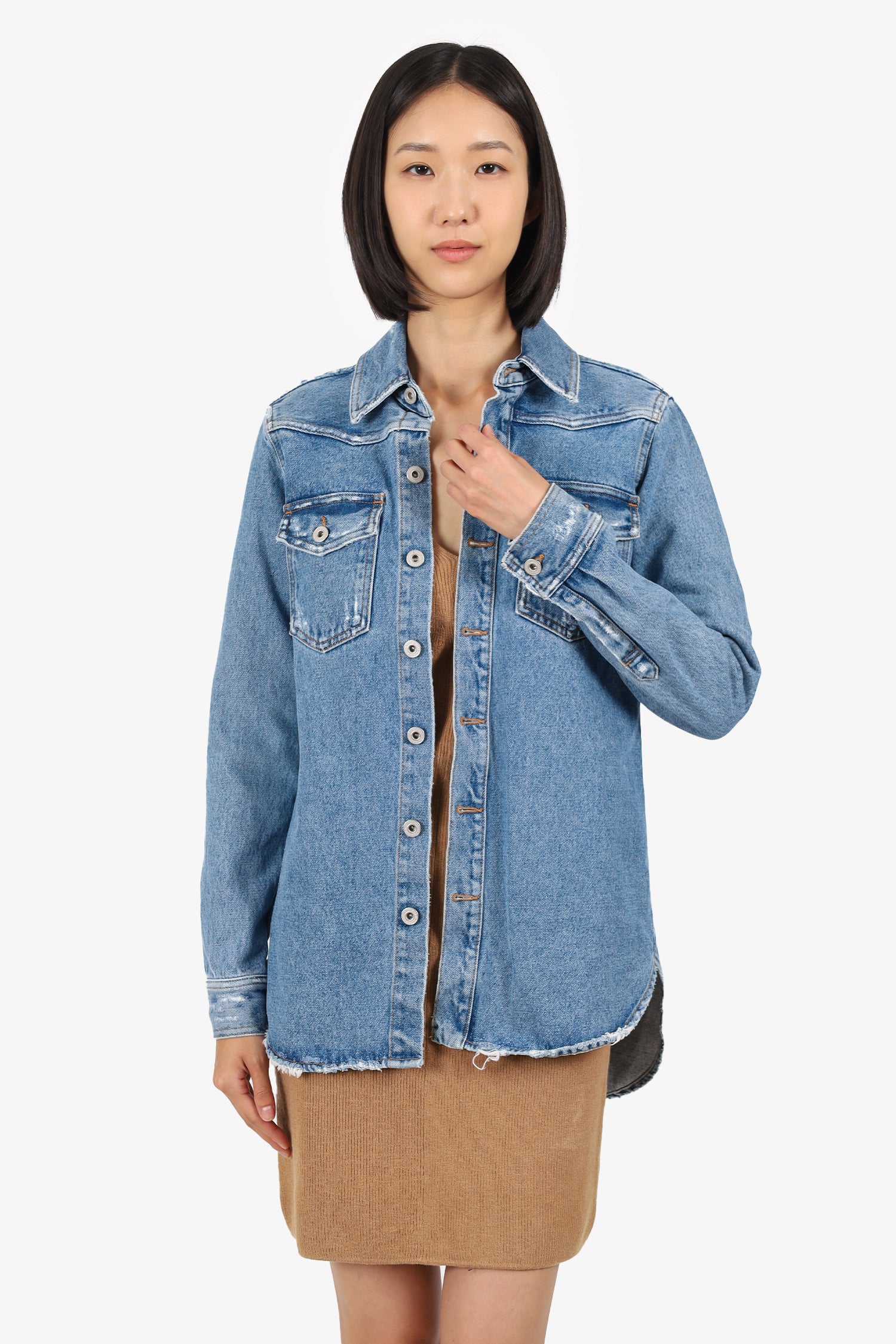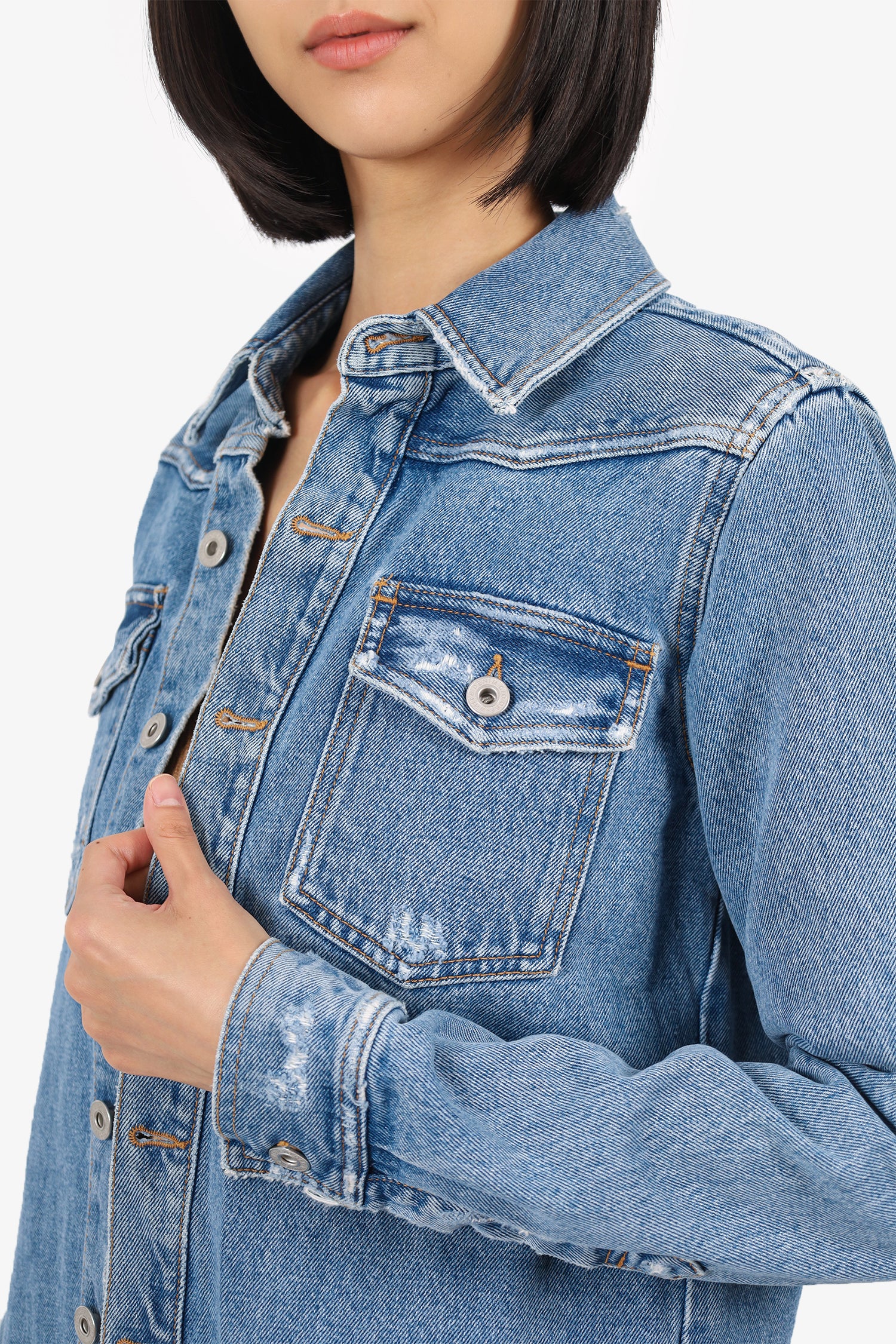 Refresh availabilityOff-White Denim Floral Printed Jacket. Pull-on. Collared-neckline. Front button-up closure. Sleeve cuffs with button-up closure. 2 front exterior flap pockets with button-up closure. Distressing throughout. Rear printed graphic. Silver-tone hardware. Tonal stitching.