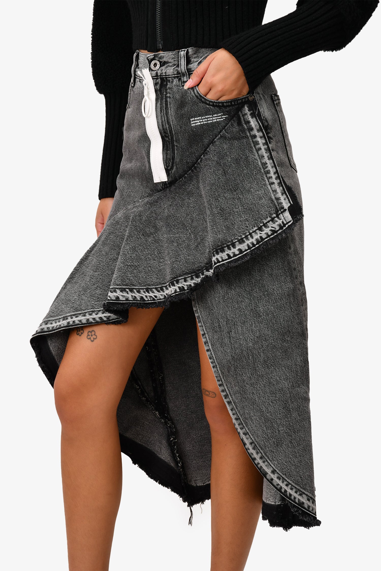Refresh availabilityOff-White Grey Denim Washed Asymmetrical Skirt. Front zip and button closure. Front and rear pockets. Waist belt loops. Unlined.