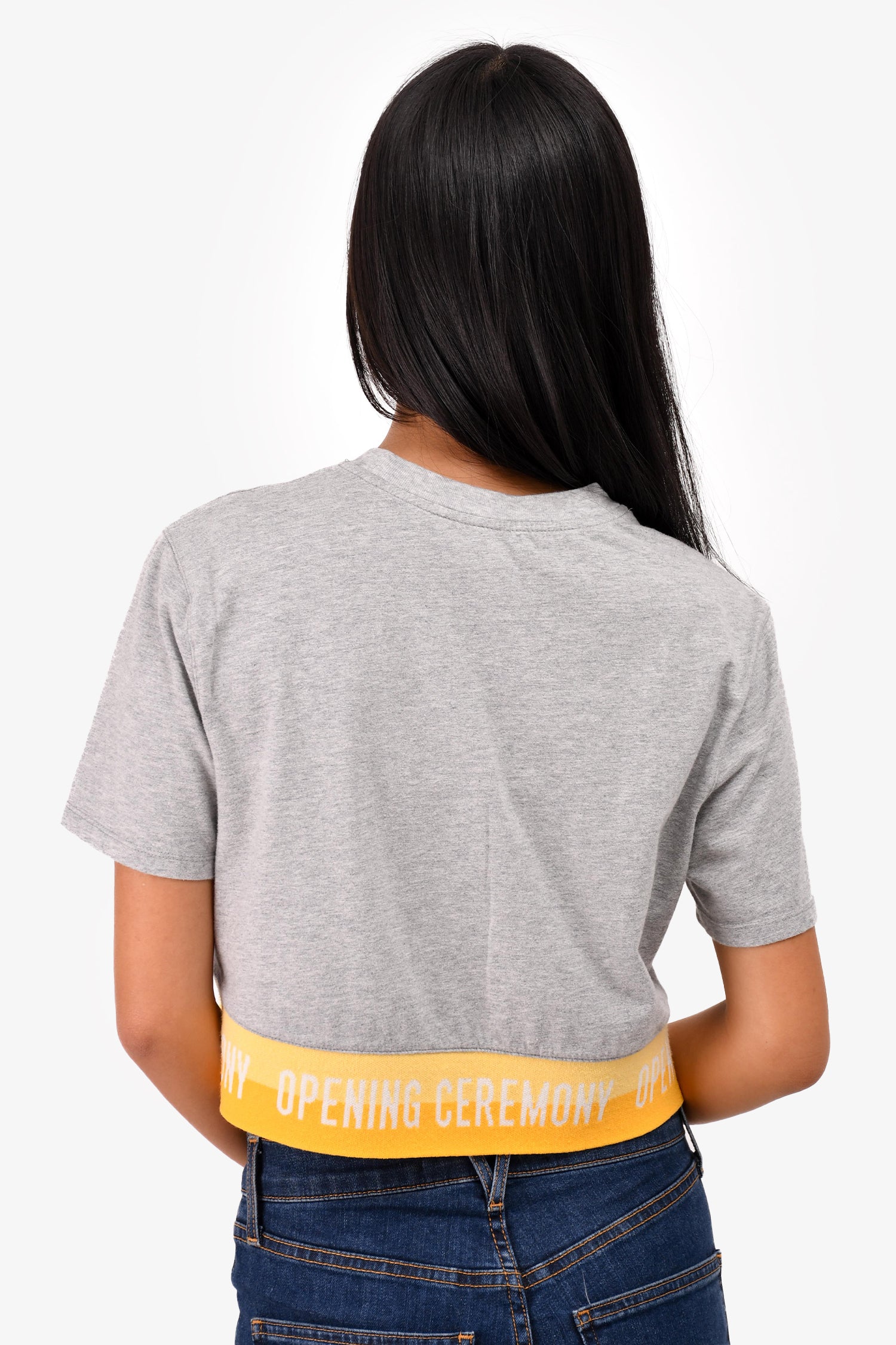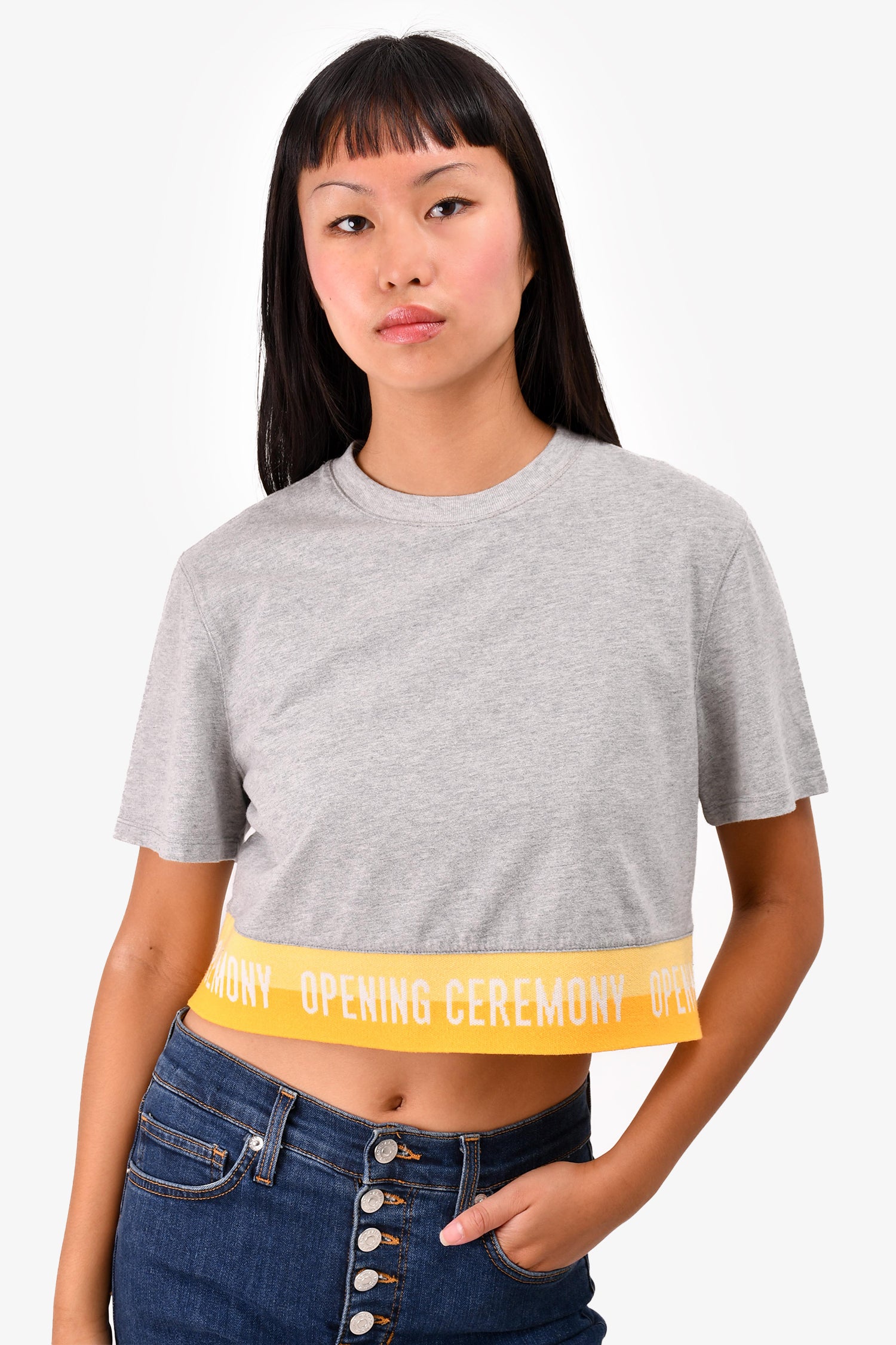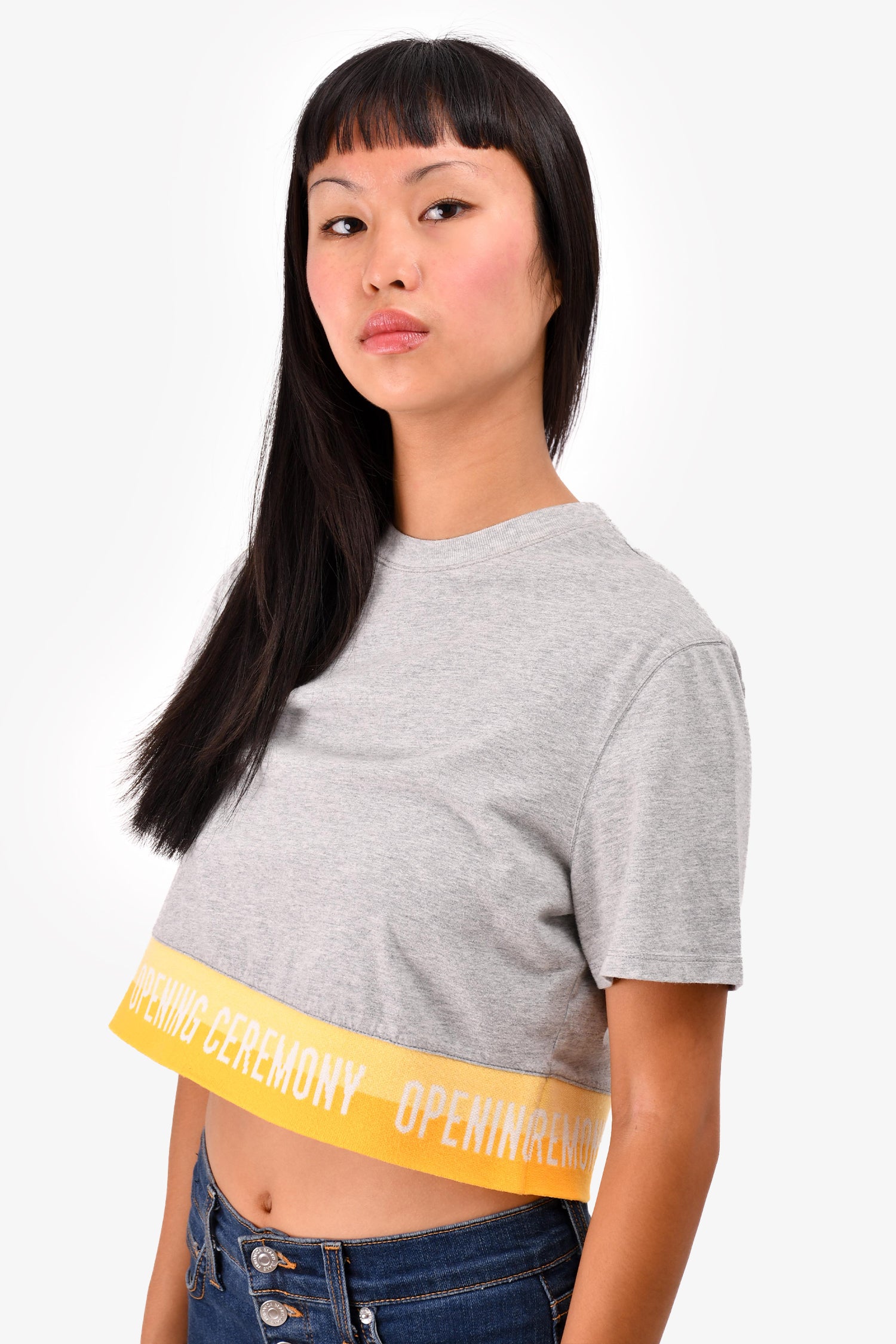 Refresh availabilityOpening Ceremony Grey/Yellow Logo Crop Top. Knitted at the hem with logo. Crew-neckline. Tonal stitching.