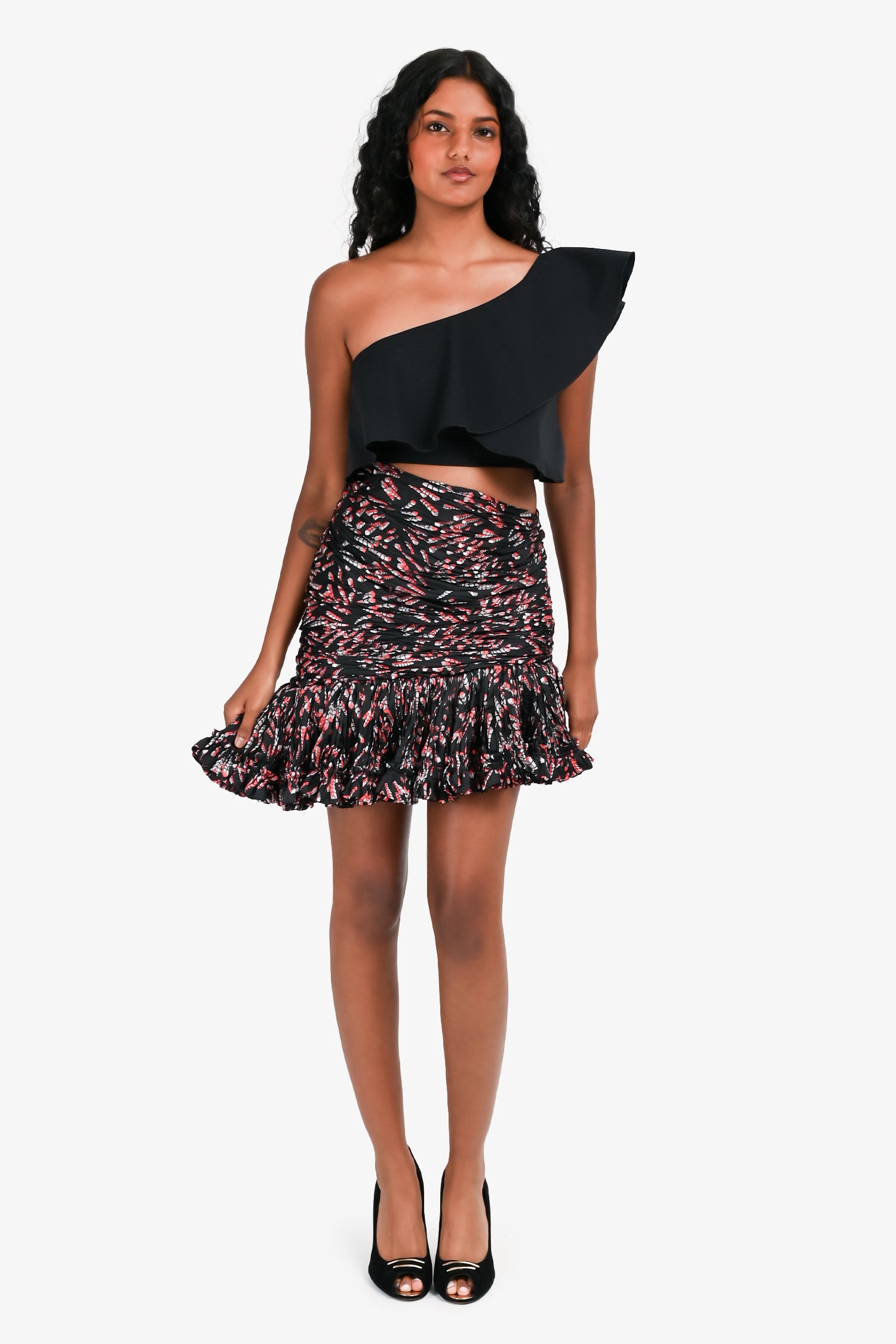 Refresh availabilityPaco Rabanne Black/Red Printed Asymmetrical Ruffled Mini Skirt. Side zip closure. Asymmetrical hem with layered ruffle detailing. Lightweight fabric. Tonal stitching.