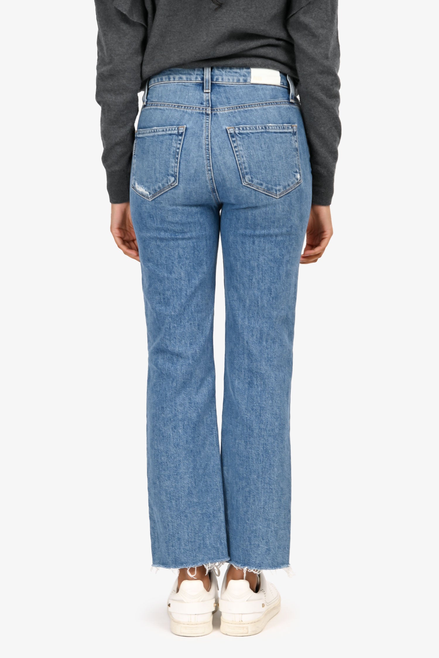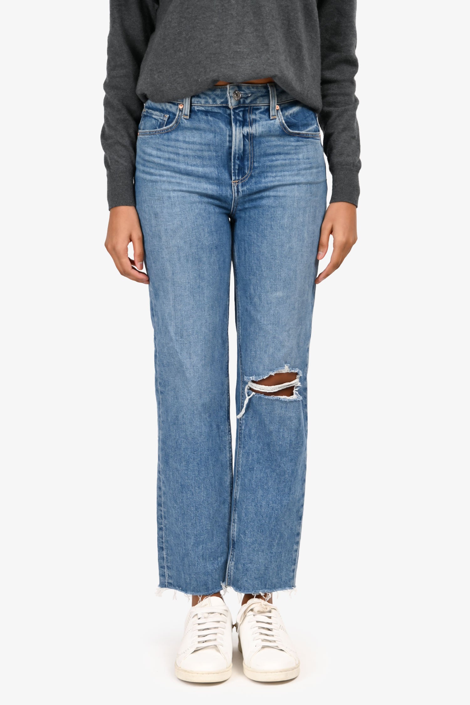 Refresh availabilityPaige Blue Cropped Distressed 'Sarah Straight Ankle' Jeans. Front zip with button closure. Waistband belt loops. 5 exterior pockets; 2 side slip and 1 mini compartment, 2 rear slip. Silver and gold-tone hardware. Contrast stitching.