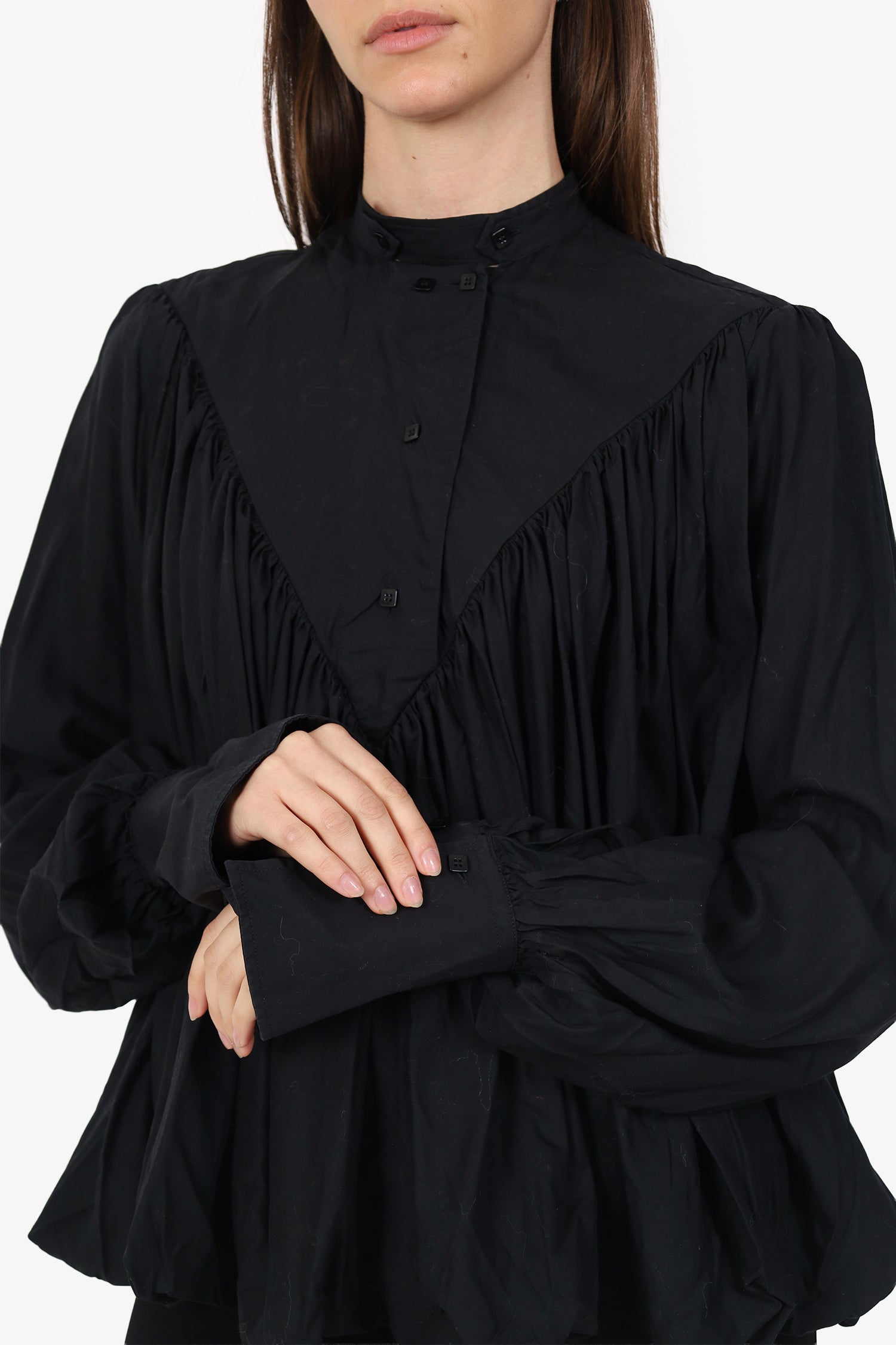 Refresh availabilityPalmer Harding Black Bubble Hem Long Sleeve Blouse. Pull-on. Round neckline. Front button-up closure. Sleeve cuffs with button-up closure. Tonal stitching.
