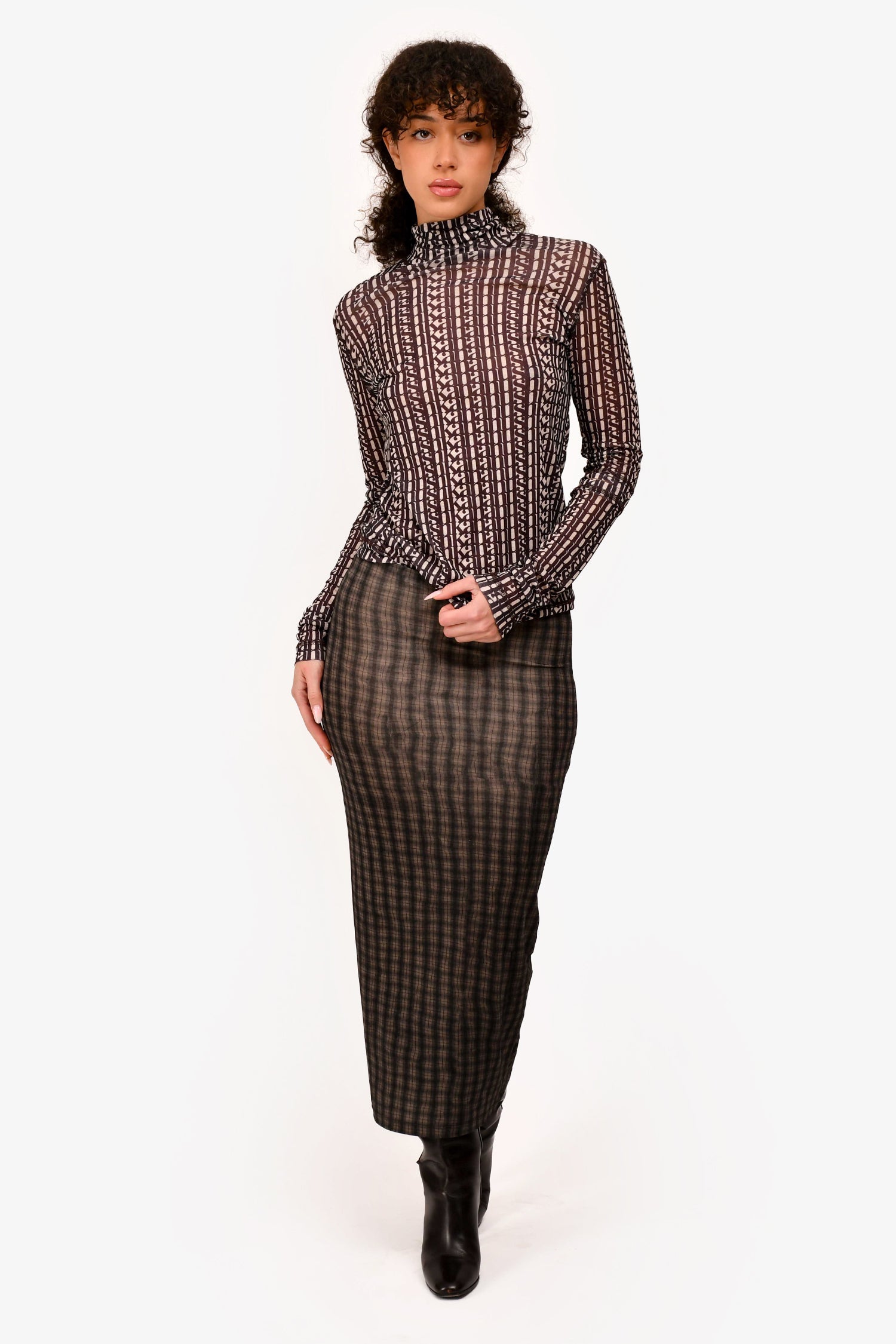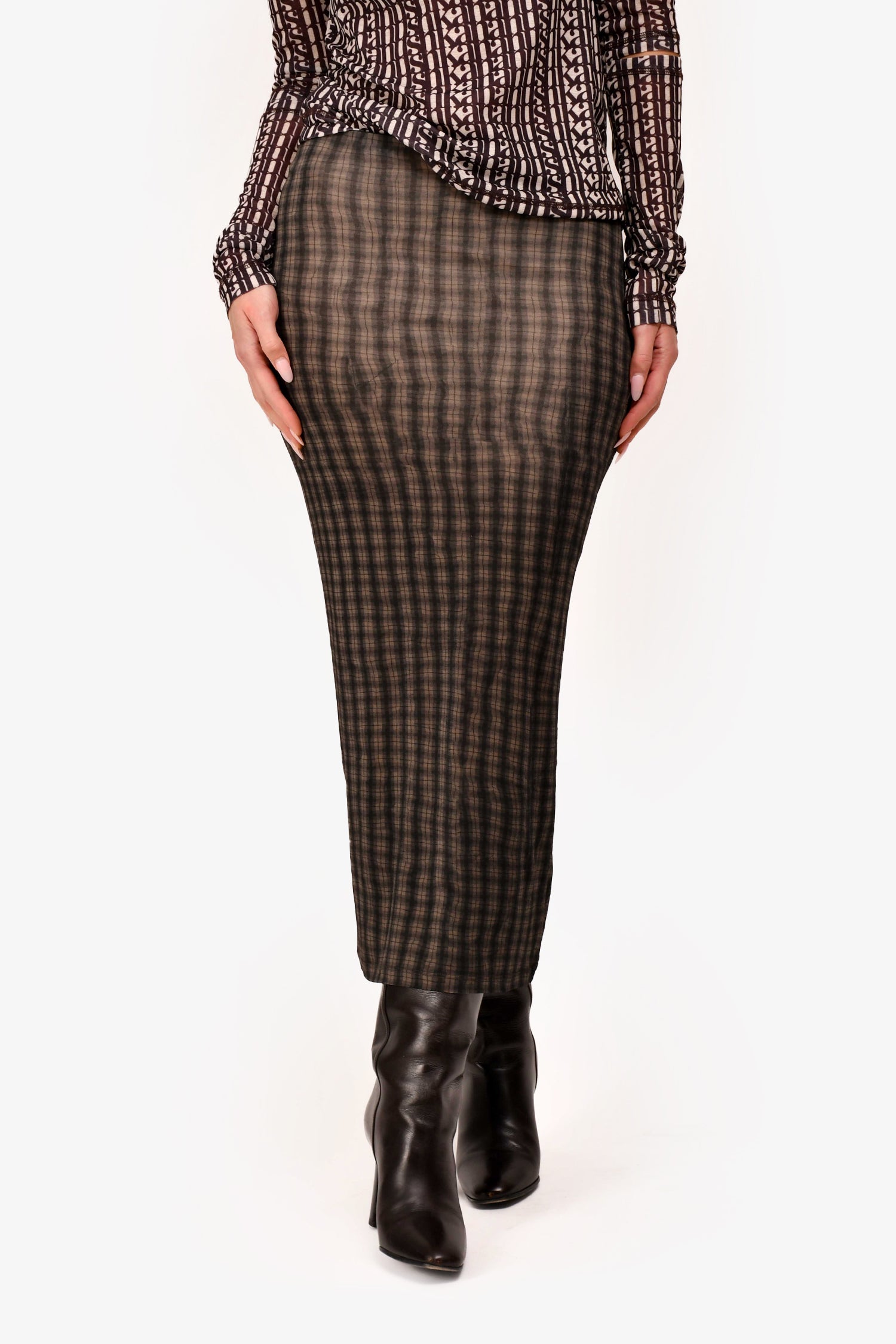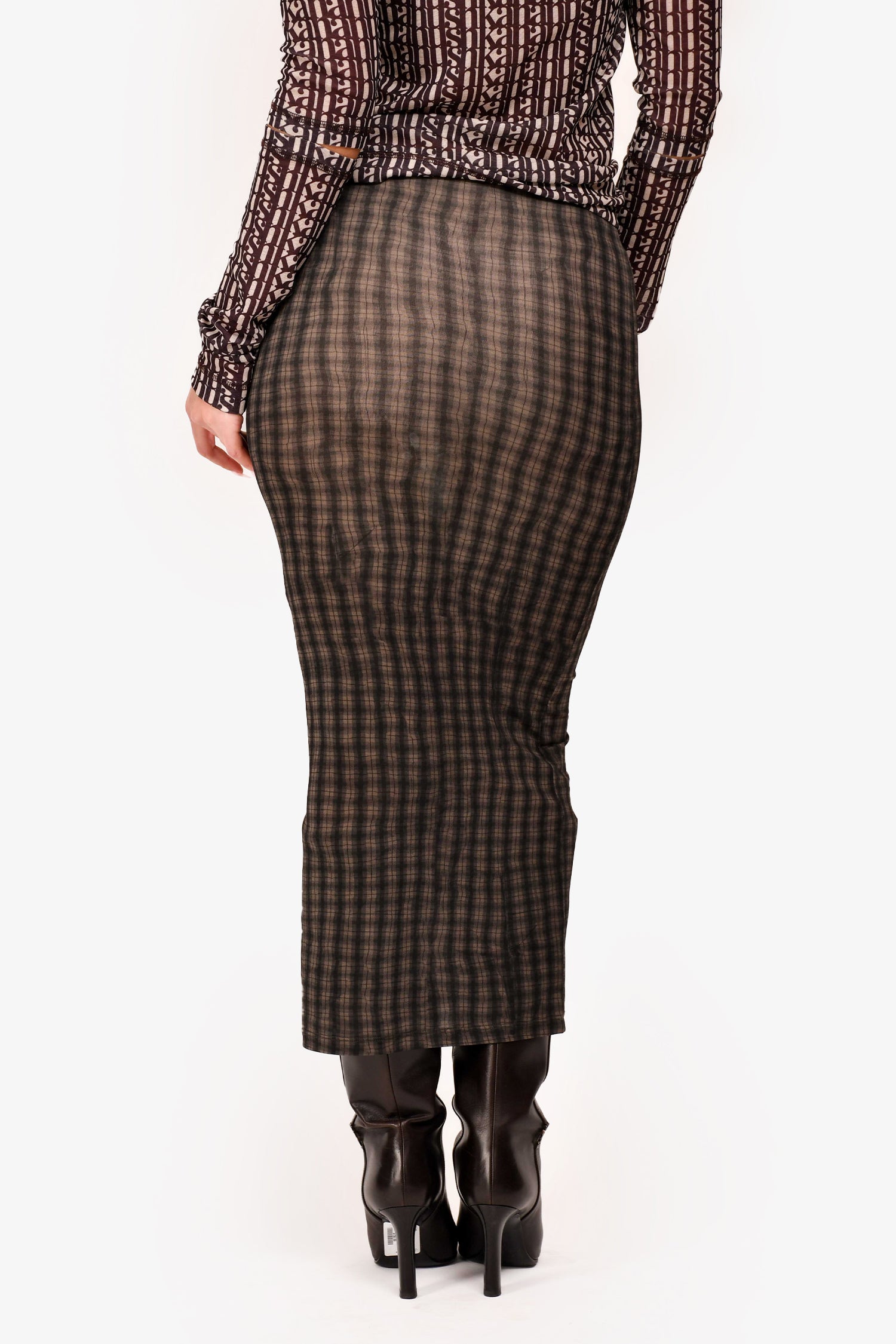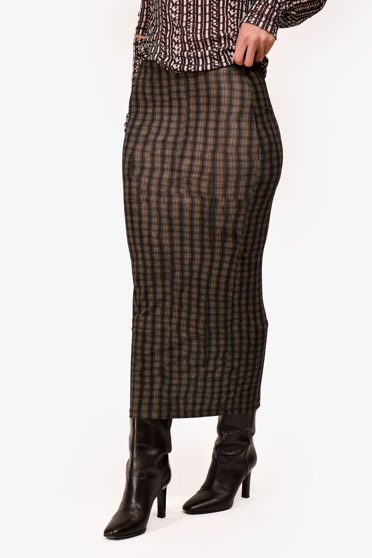 Refresh availabilityPaloma Wool Brown Tartan Print Stretchy Midi Bodycon Skirt. Elasticated. Tonal stitching.