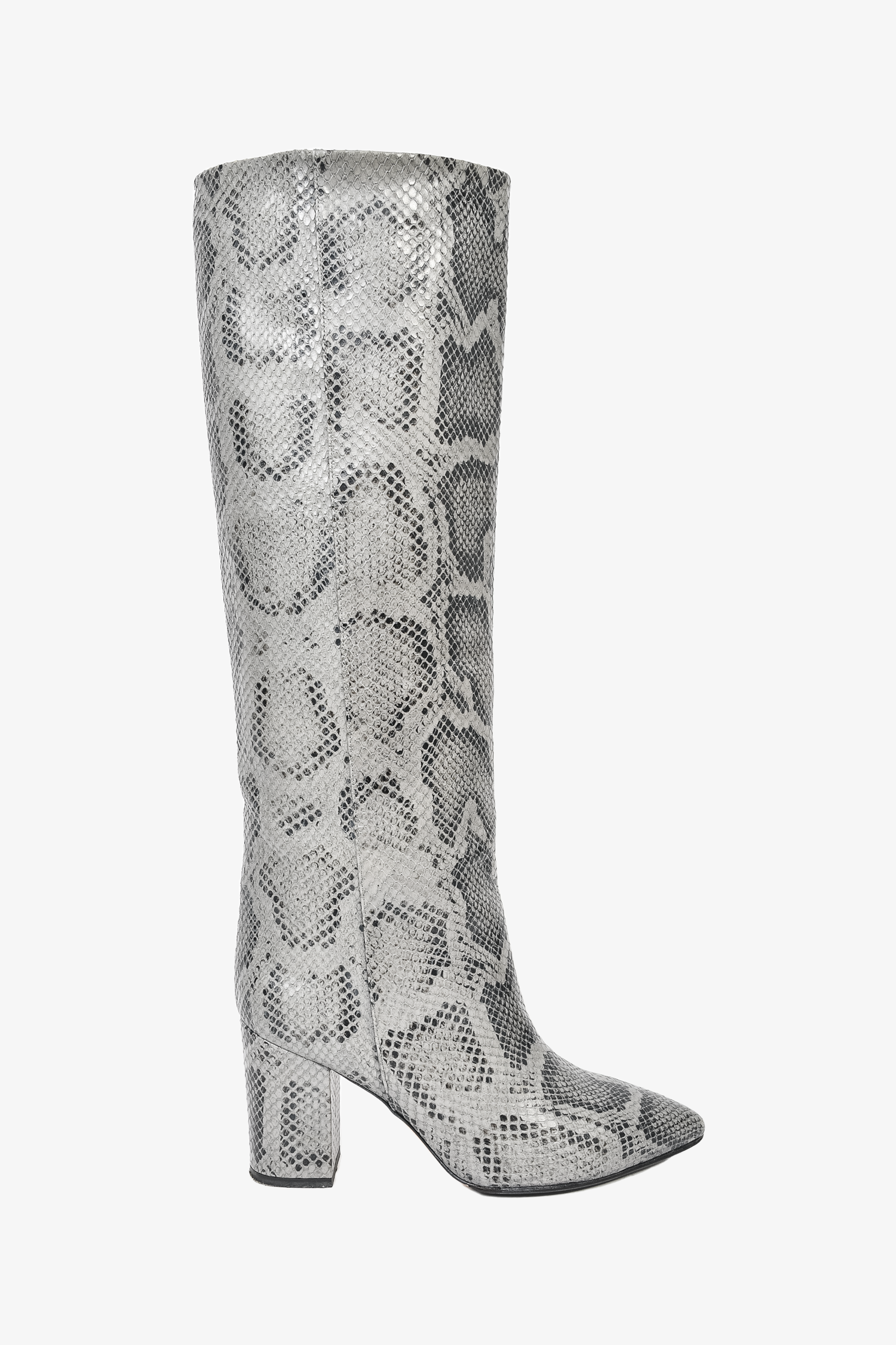 Refresh availabilityParis Texas Grey Snake Embossed Knee High Boots. Slip on. Pointed toe. Tonal stitching.