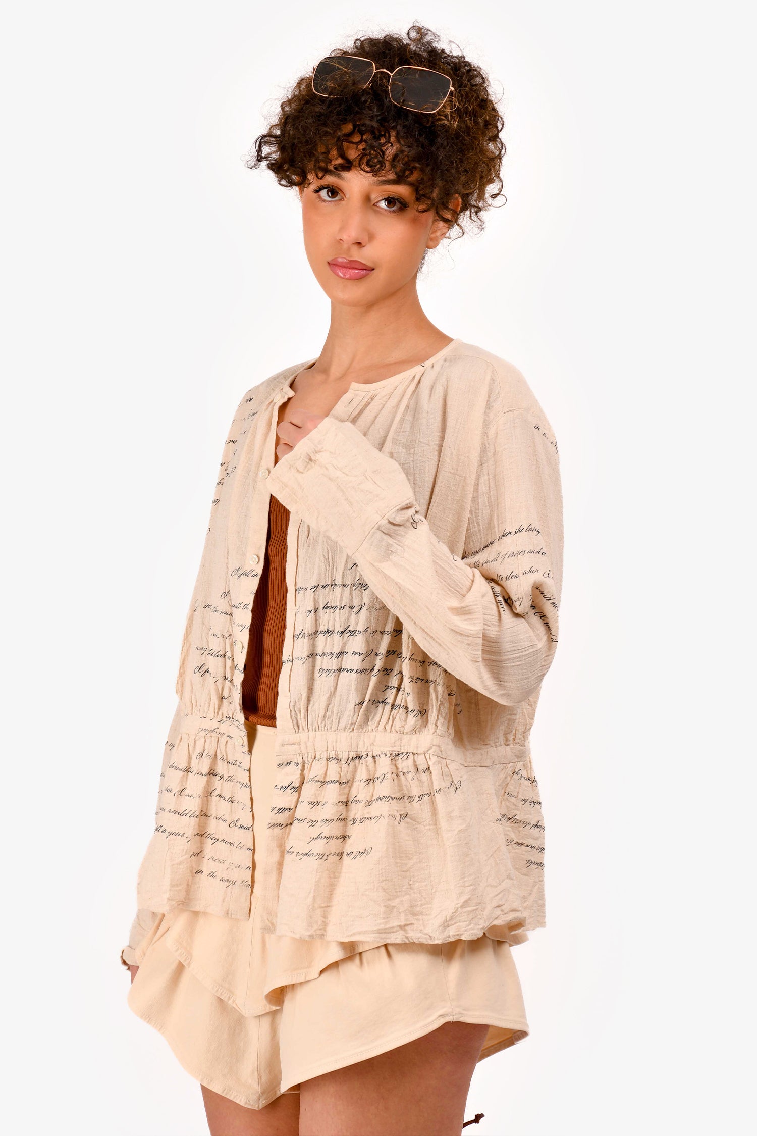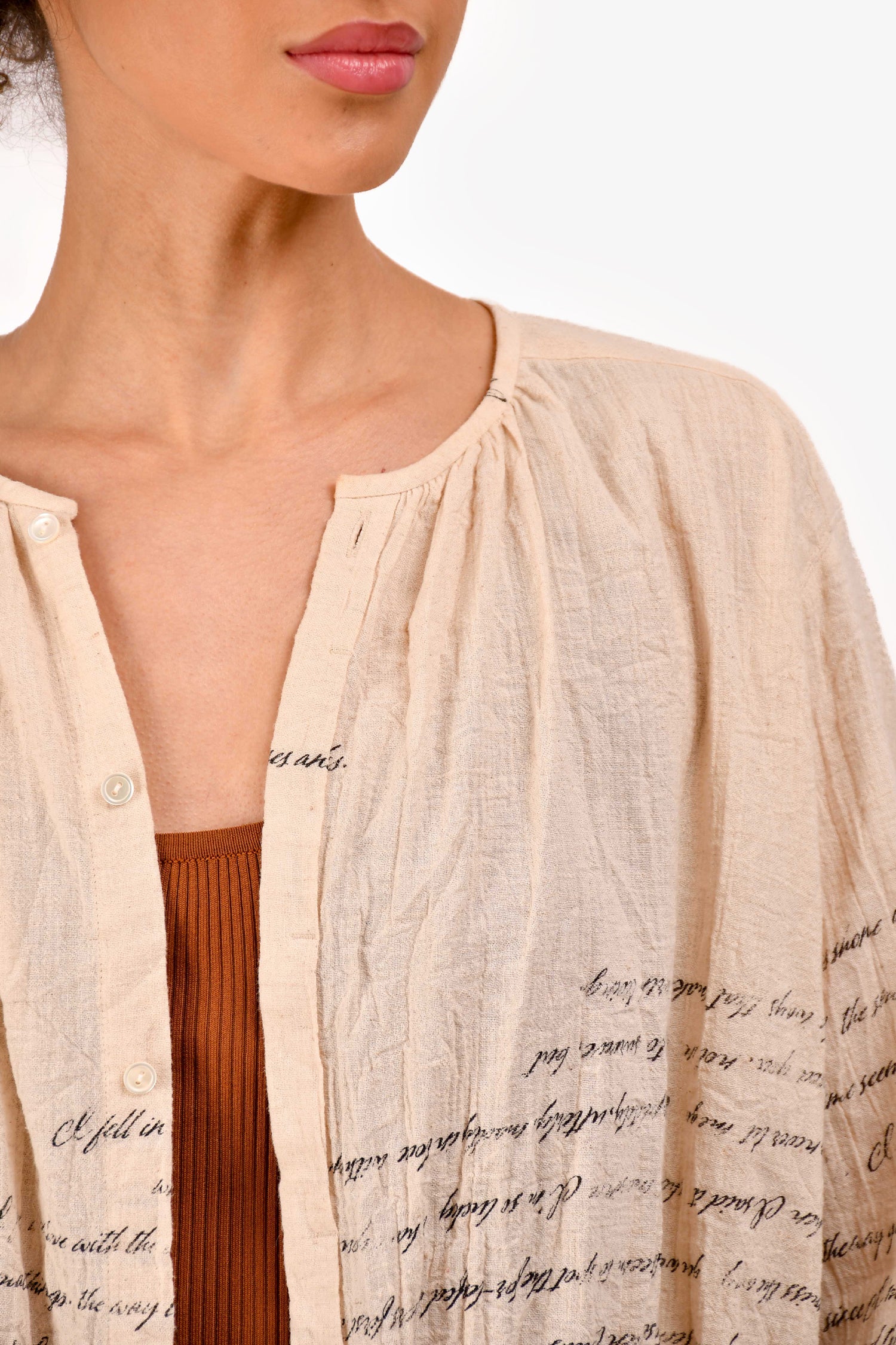 Refresh availabilityPas De Calais Beige Linen Calligraphy Printed Top. Front button-down closure. Button closure at cuffs. Tonal stitching.