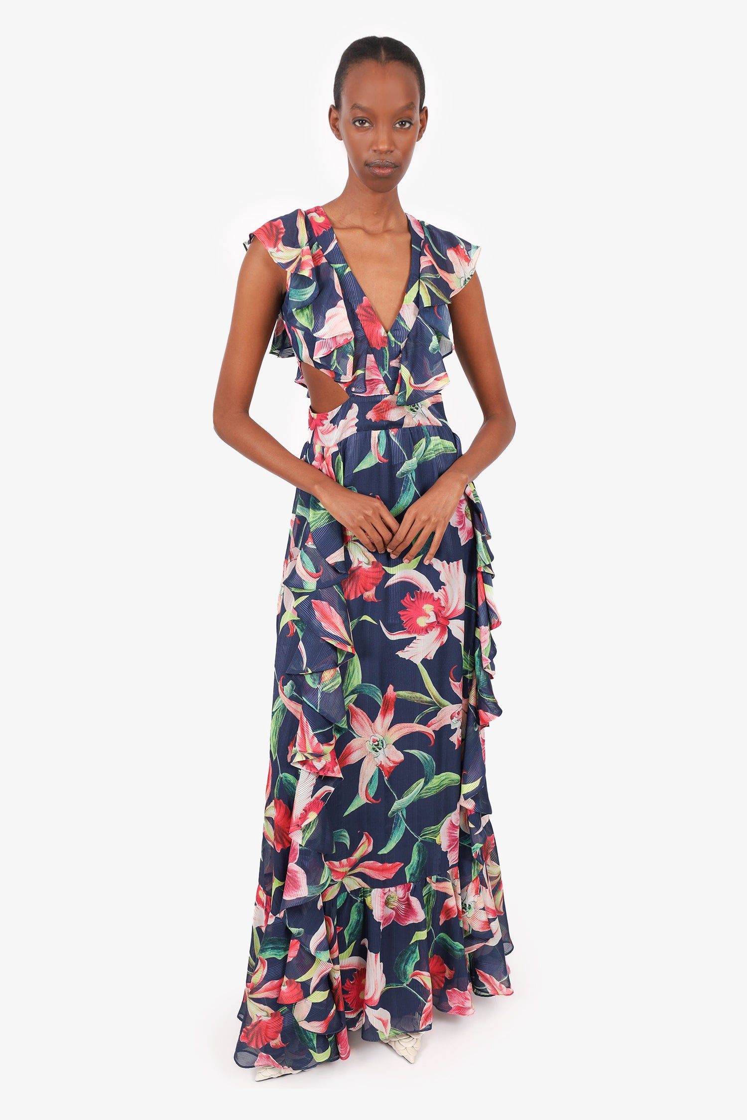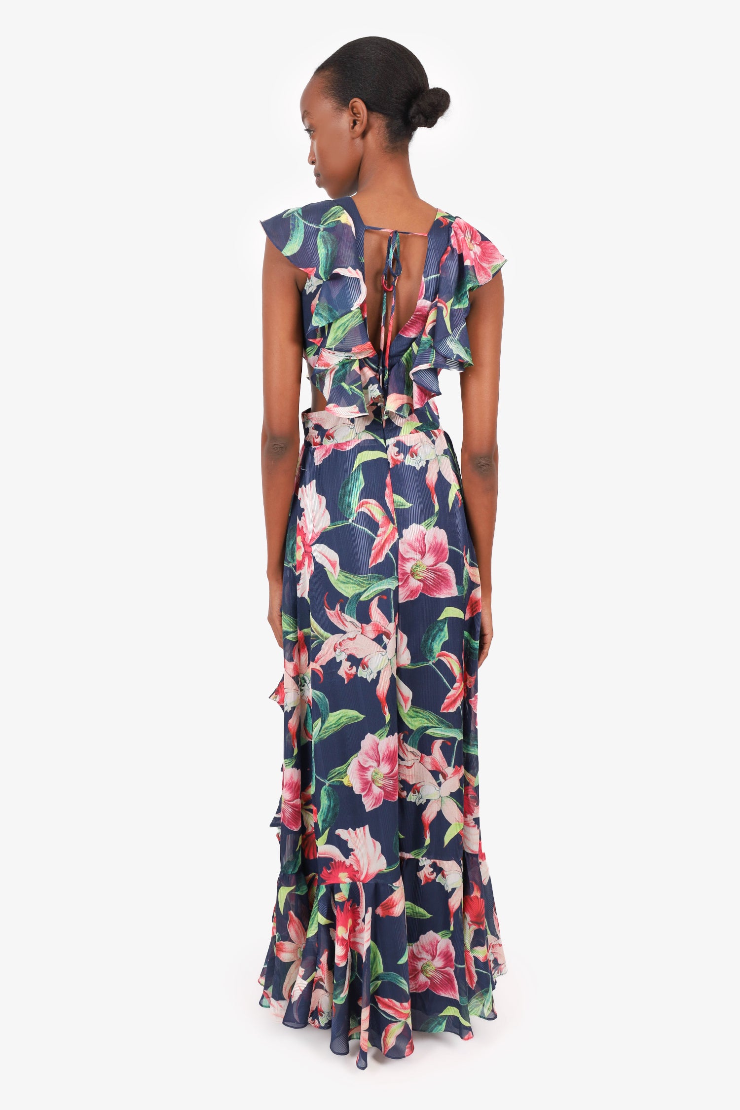 Refresh availabilityPatBO Midnight Laelia Ruffle V-Neck Maxi Dress. Rear zip and hook closure. Lined. Tonal stitching.