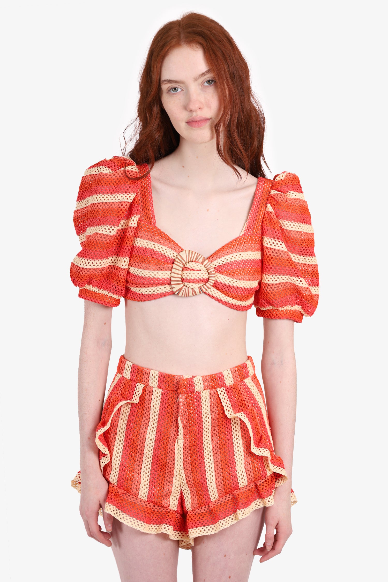 Refresh availabilityPatbo Pink/Red Crochet Short-sleeve Cropped Top & Short Set. Top; puffed sleeves. Rear zip-closure. Tonal stitching. Shorts; fly hook and zip up closure. Ruffle hem. Tonal stitching.
