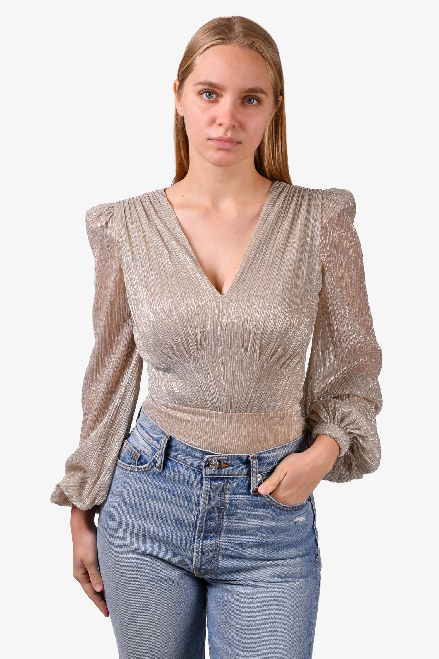 Refresh availabilityPatbo Silver Shimmer Plunge Mesh Bodysuit. Rear zip closure. Round neck. Lined. Snap-button closures on the bottom. Tonal stitching.