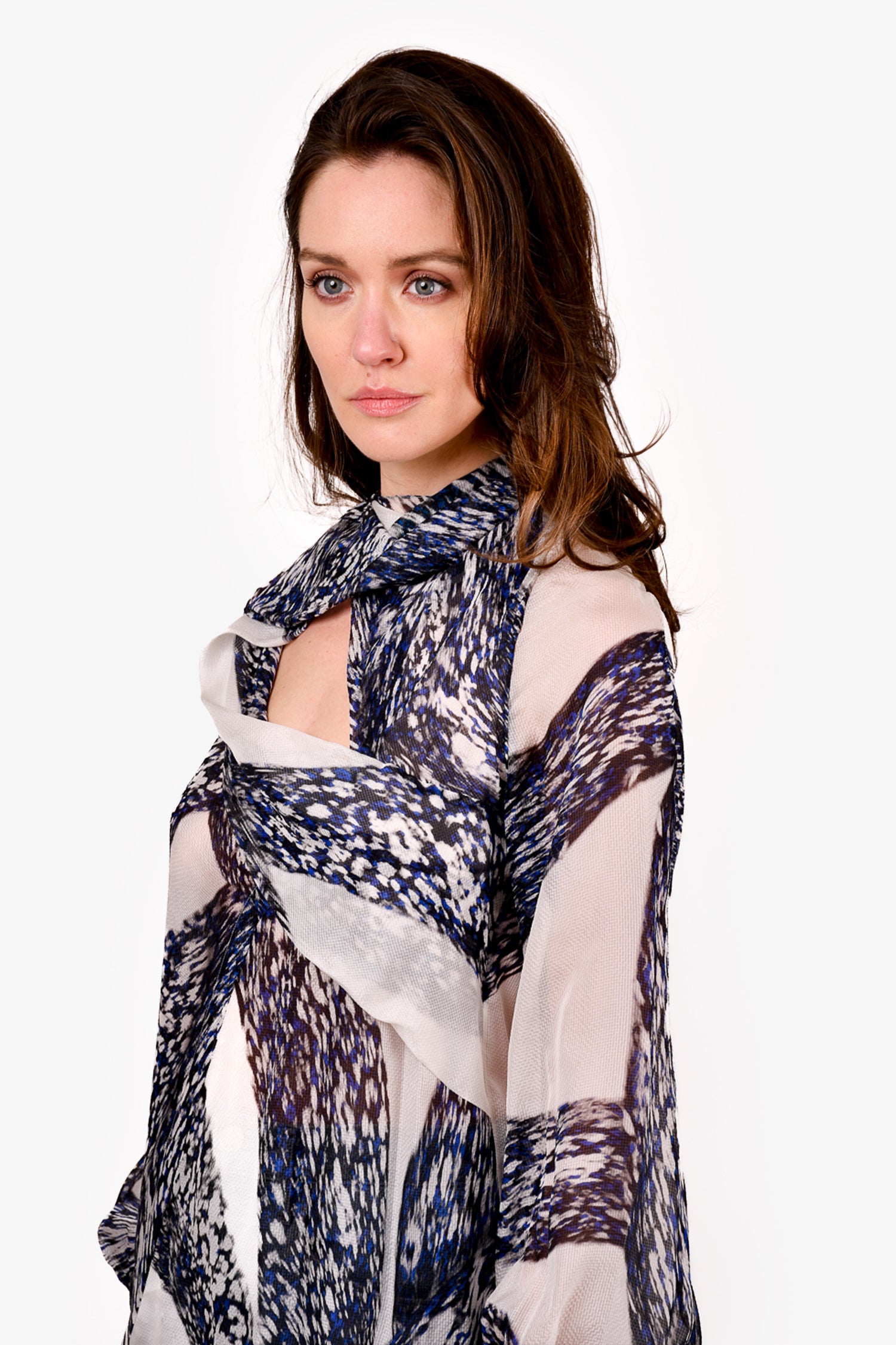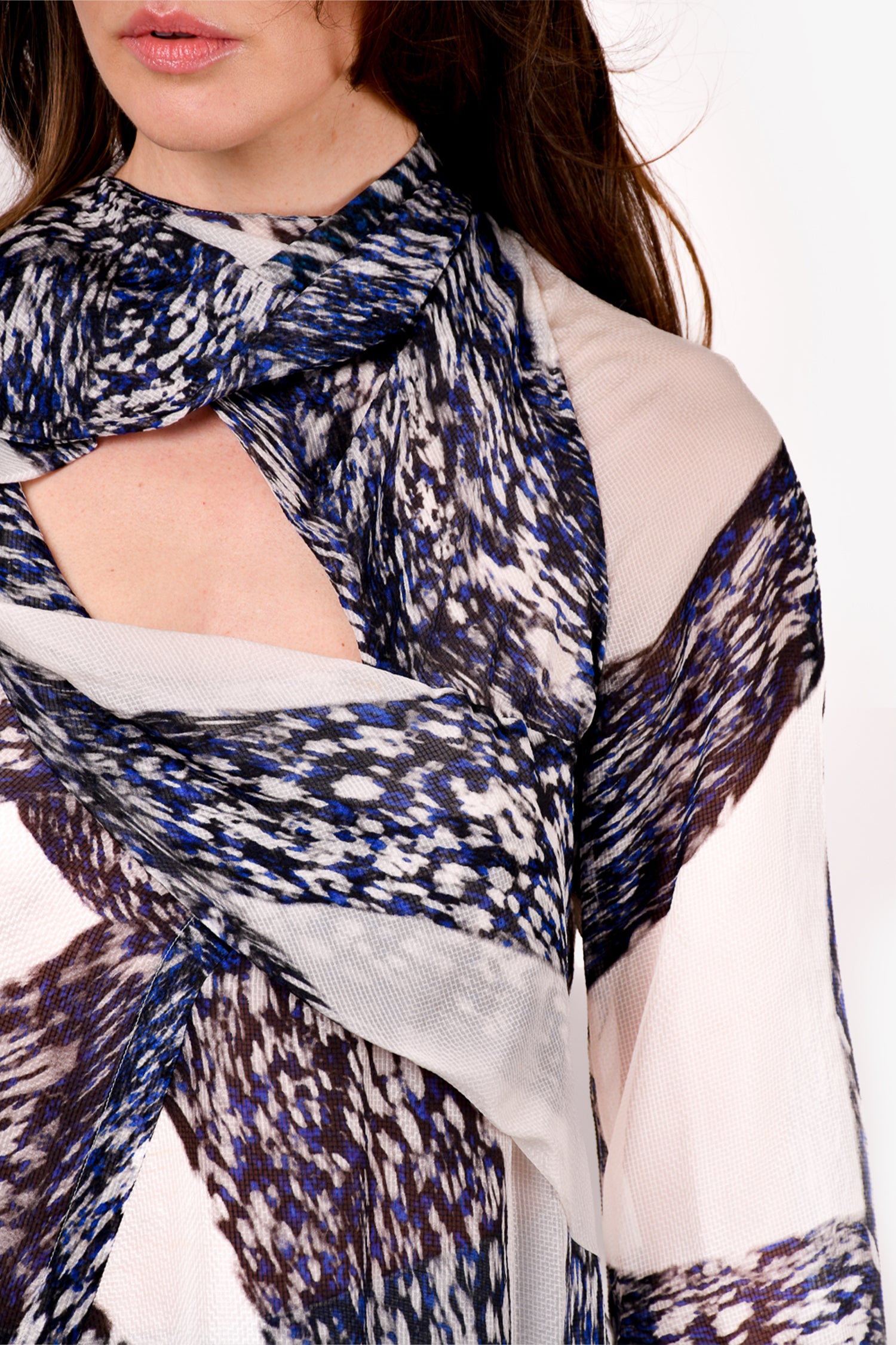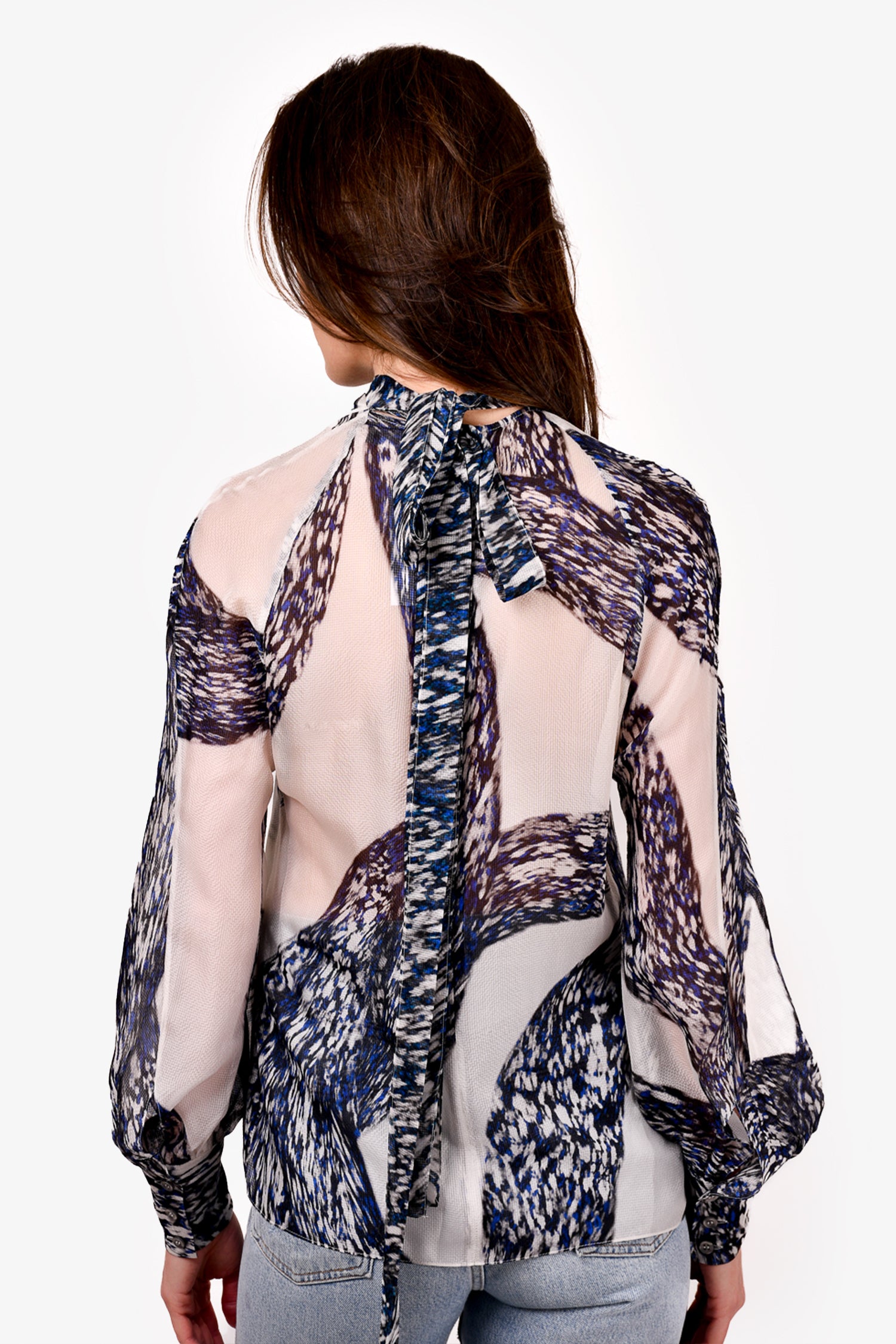Refresh availabilityPeter Pilotto Blue/White Patterned Neck Tie Blouse. Button closure on the cuffs. Rear zip and hook closure. Unlined. Tonal stitching.