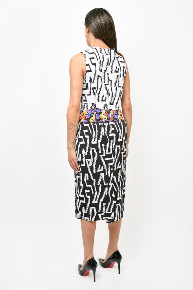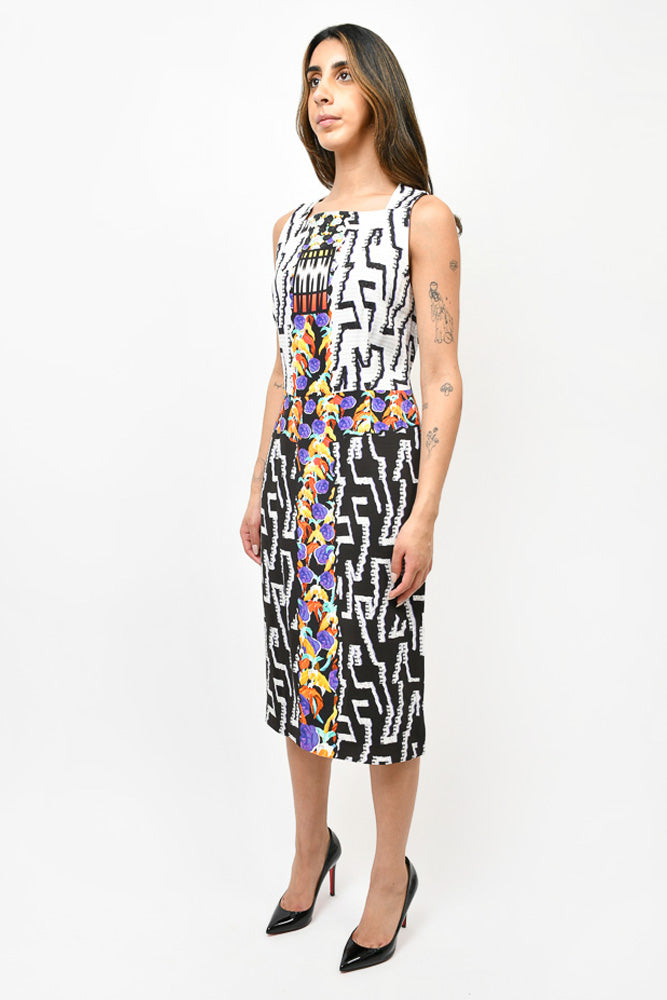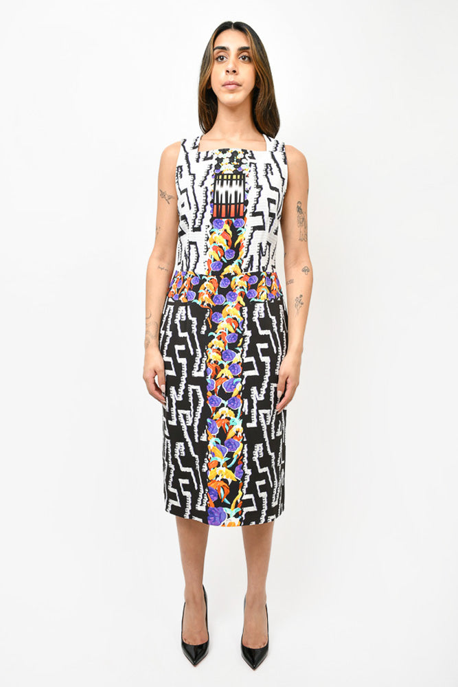 Refresh availabilityPeter Pilotto White/Black/Multicolour Printed Sleeveless Shift Dress. Back zip closure. Square neckline. Black interior lining. Tonal stitching.