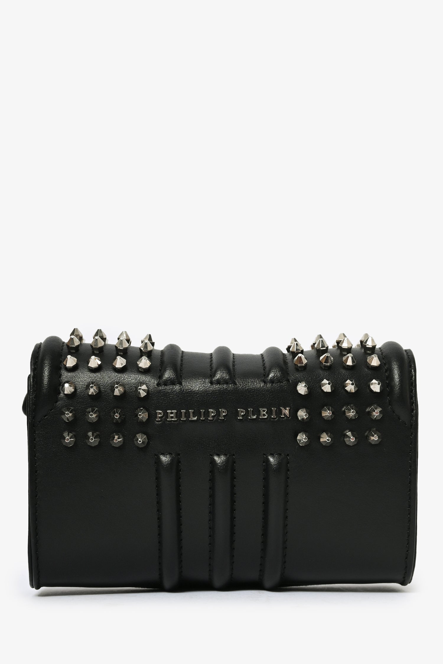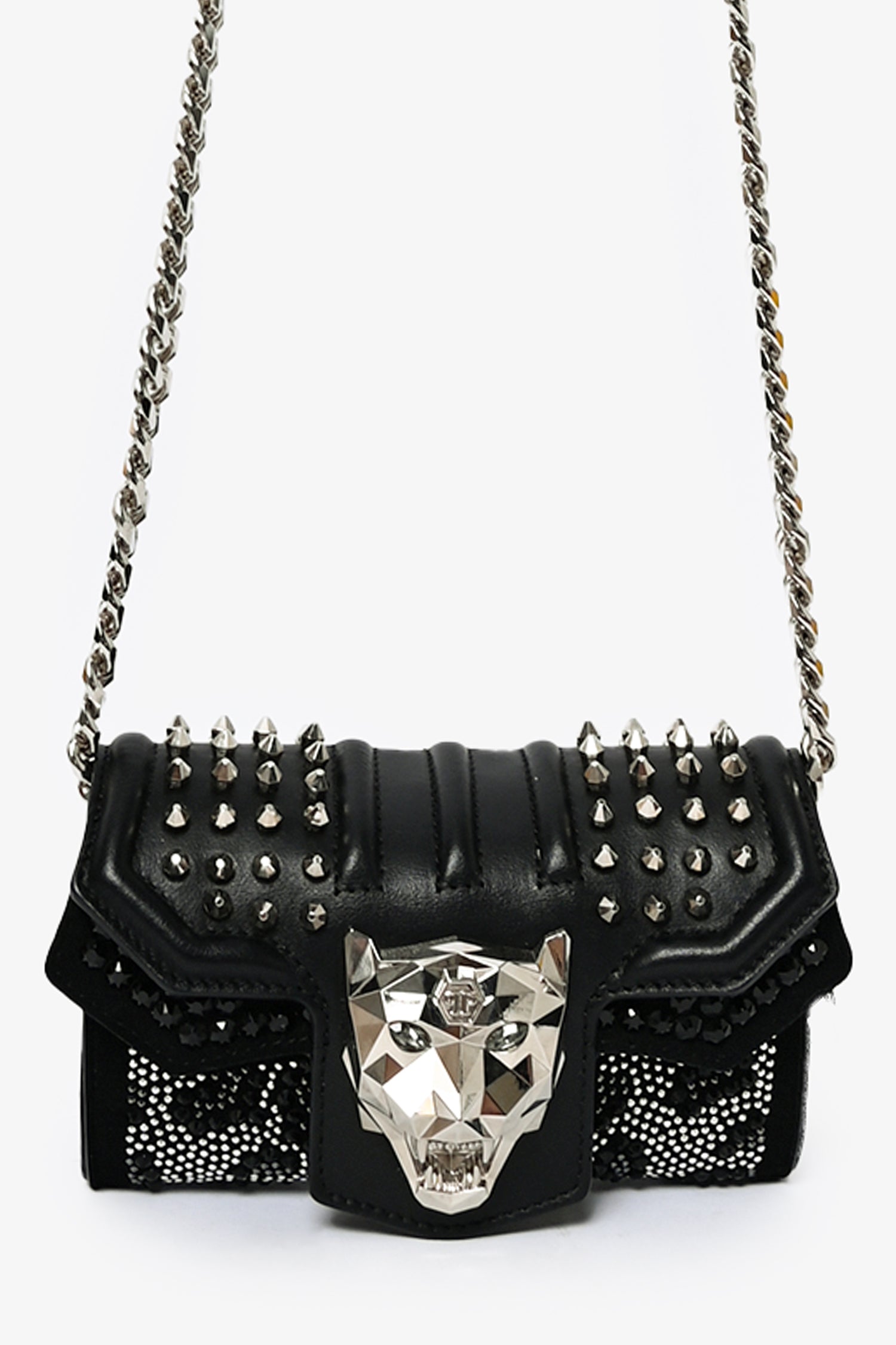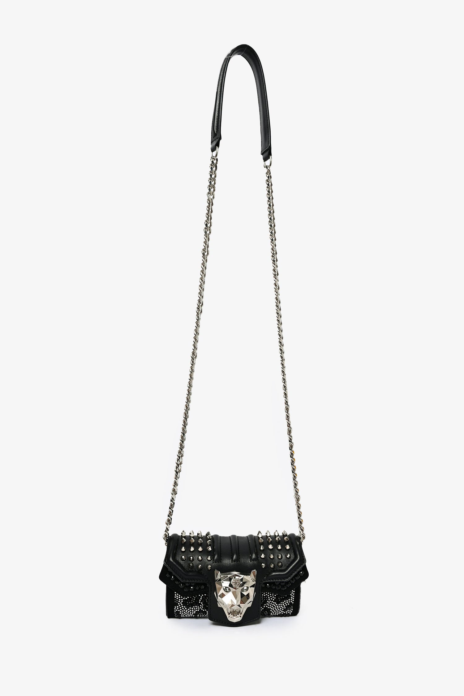Refresh availabilityPhilipp Plein Black Leather Crystal Embellished Crossbody. Tonal stitching. Leather trimming. Chain-link and leather accent crossbody strap. Studded accents and embellishment throughout. Silver-toned embellished closure at centre. Suede accents.