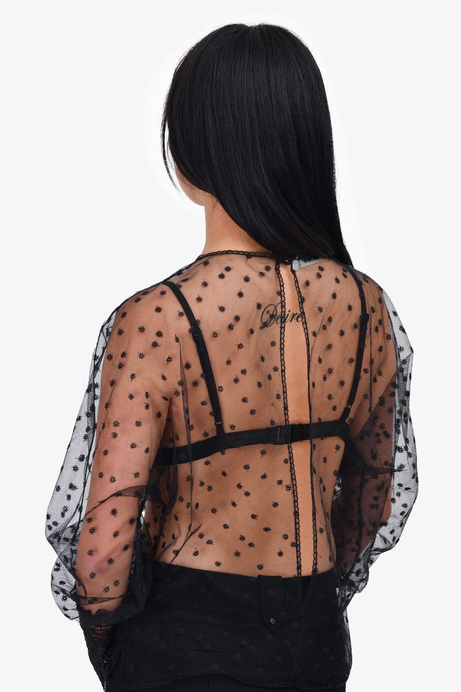 Refresh availabilityPhilosophy Black Mesh Sheer Open Back Top. Back-of-neck button closure. Elasticized cuffs.