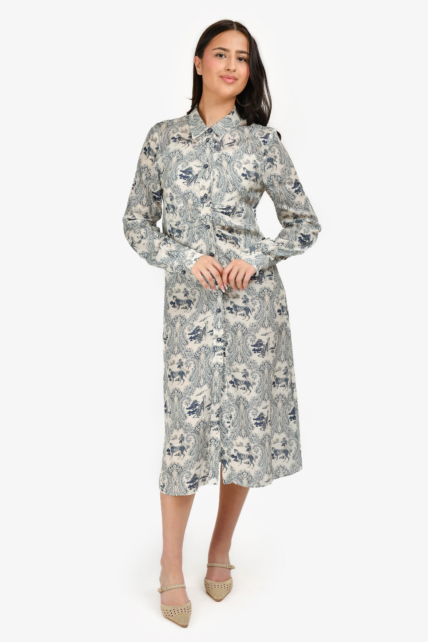 Refresh availabilityPinko White/Blue Collared Button Down Long Sleeve Maxi Dress. Front button-up closure. Tonal blue and sliver blue. Buttoned cuffs. Tonal stitching.