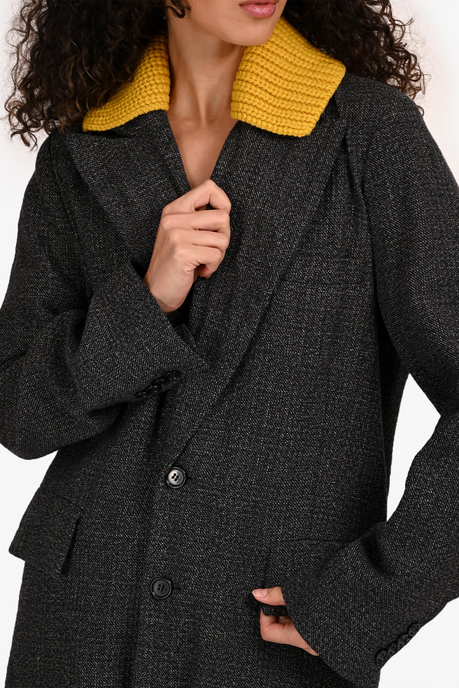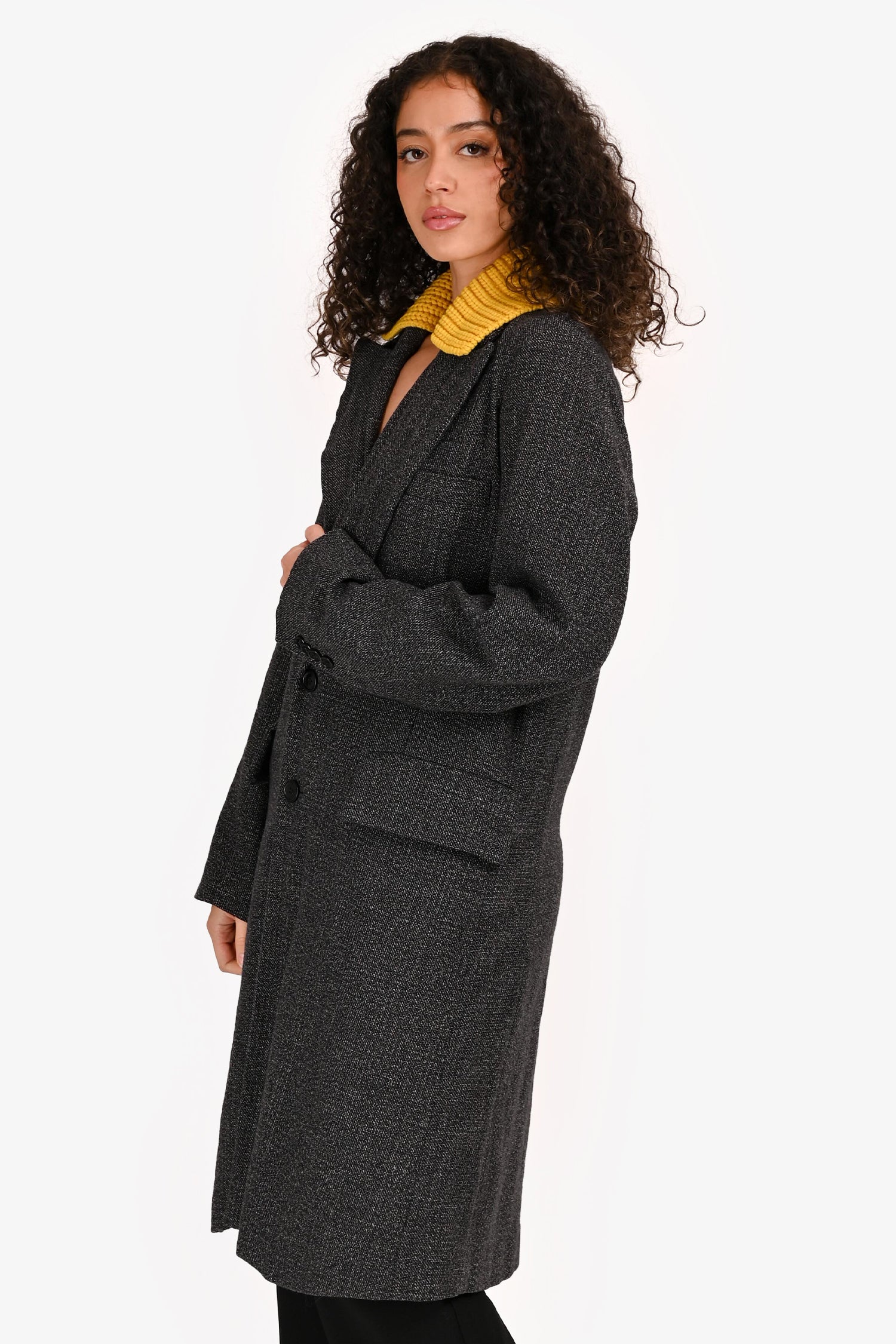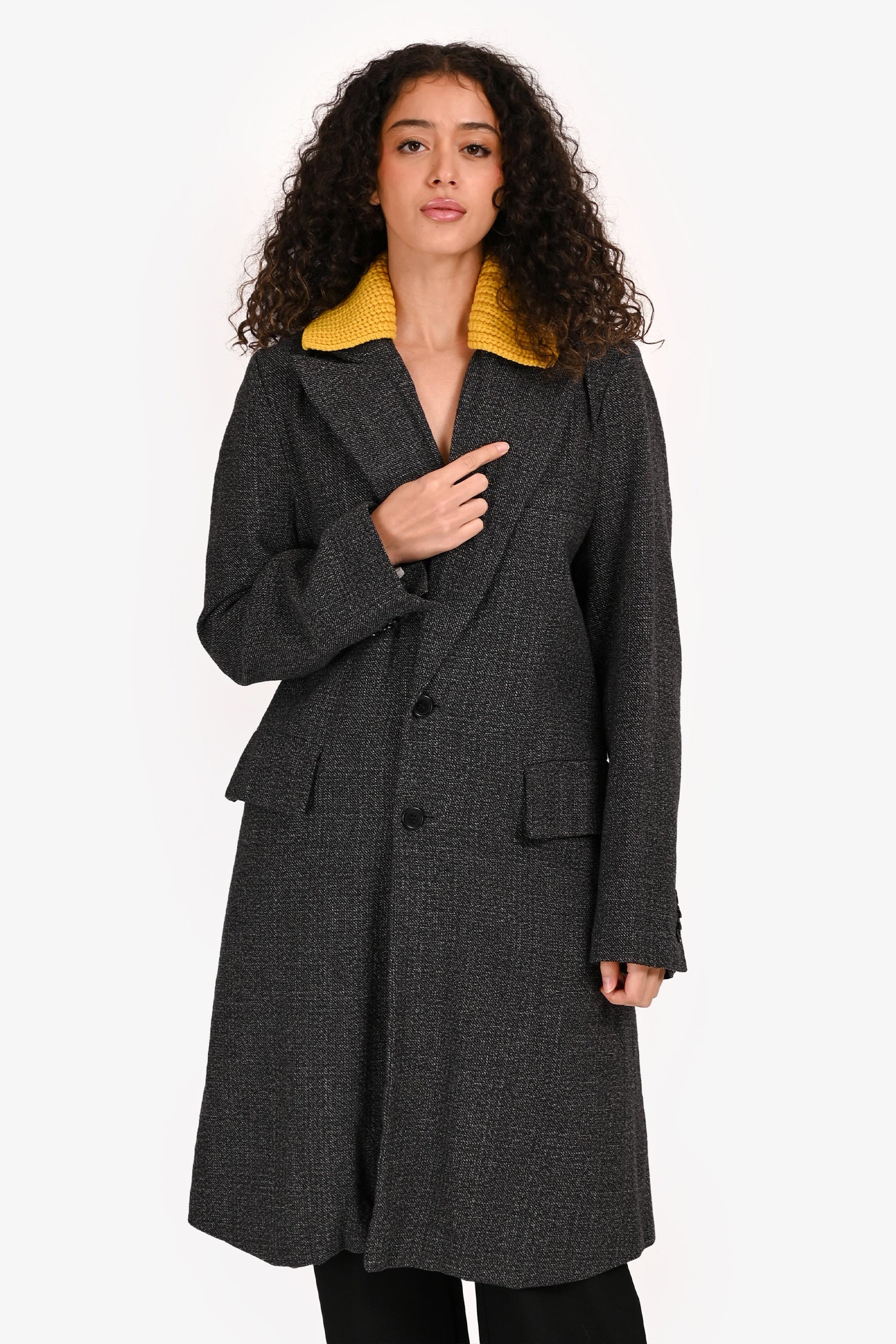 Refresh availabilityPlan C Grey/Yellow Wool/Cotton Blend Single Breasted Coat. Button front closure. Notch lapel collar. Cuffs with button-up detail. 2 exterior flap pockets; 1 interior slip pocket. Lined interior. Tonal stitching.