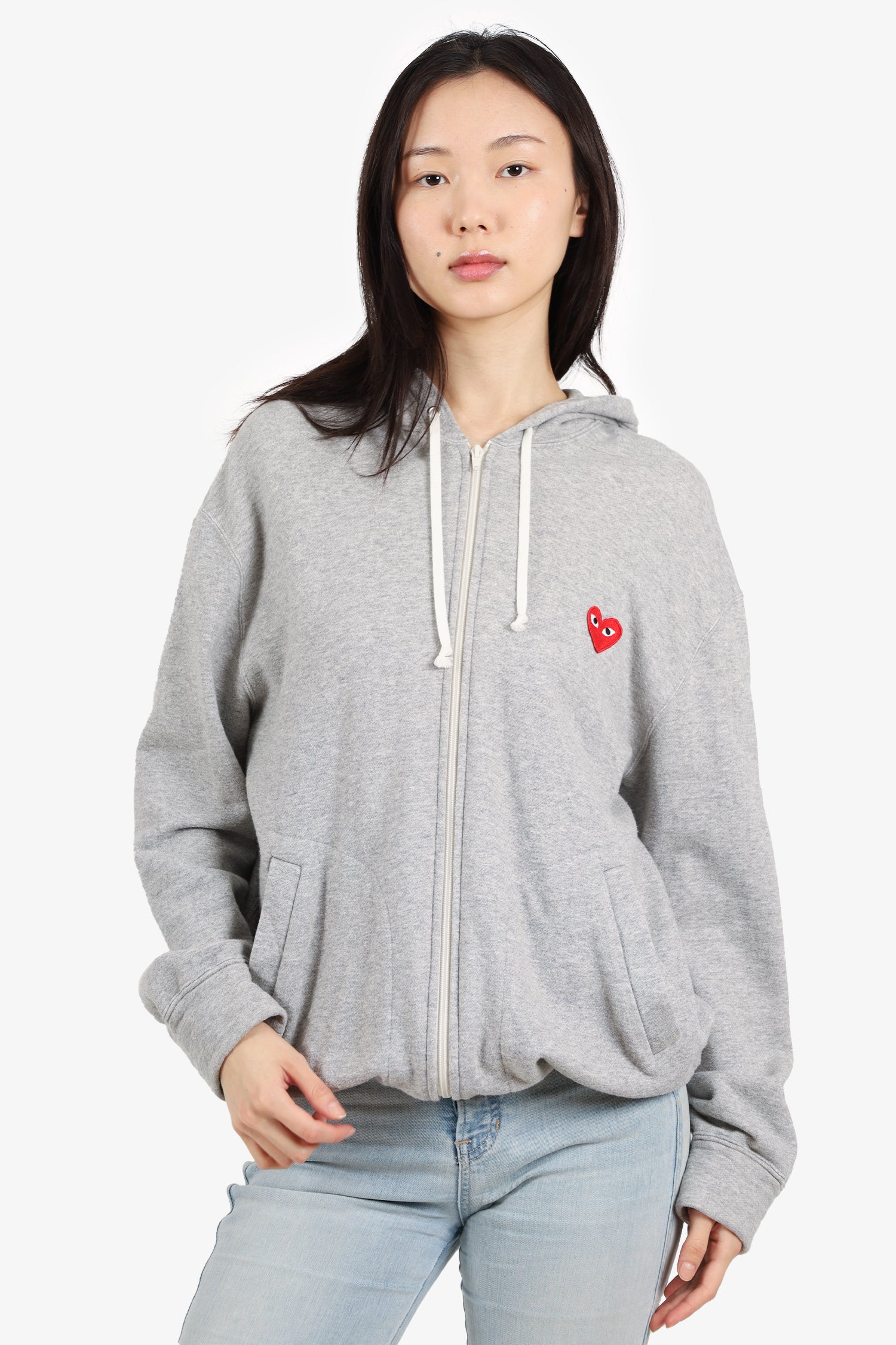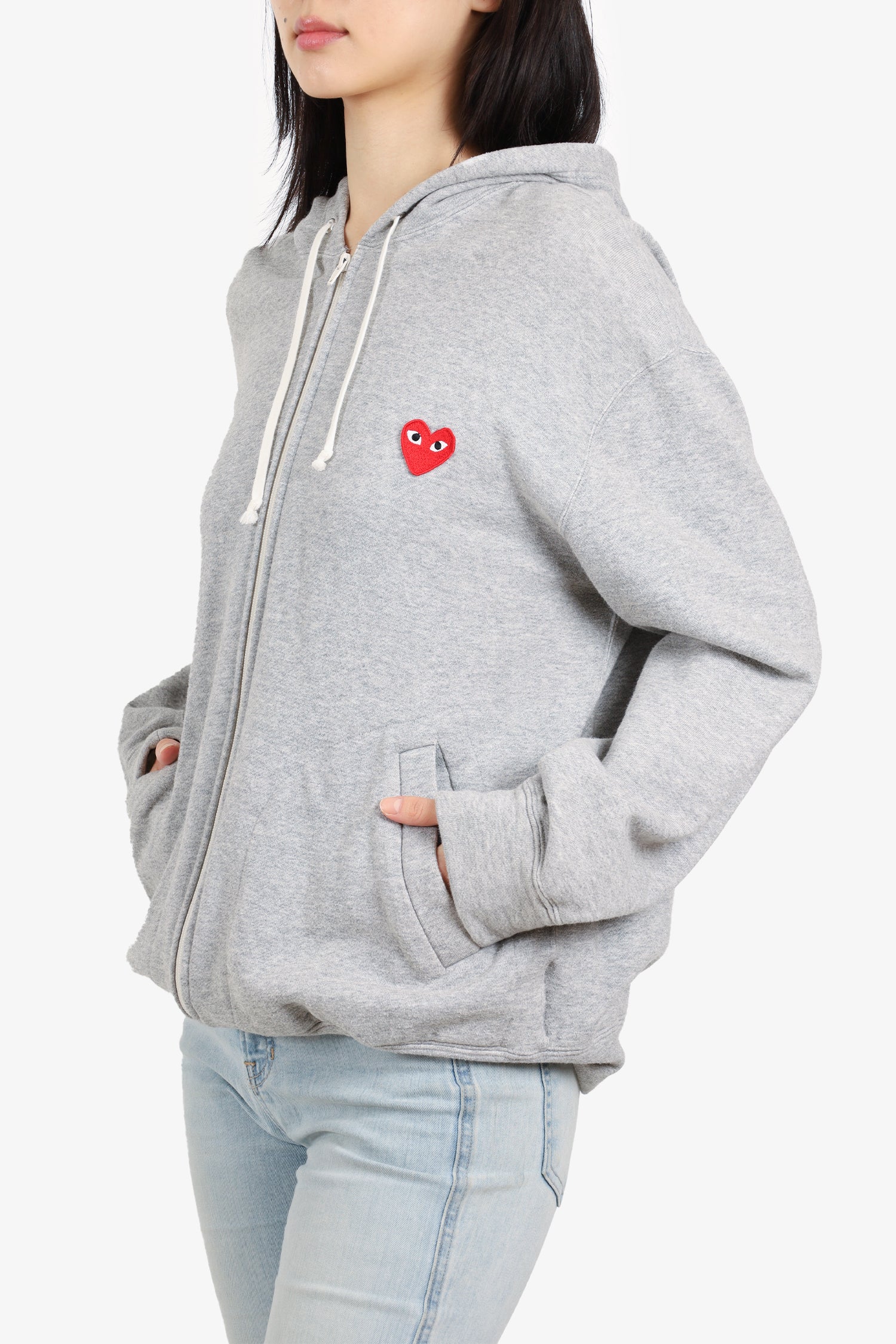 Refresh availabilityPlay Comme des Garcons Grey Heart Patch Zip Up Sweater. Front zip closure. Drawstrings. Front slip pockets. Tonal stitching.