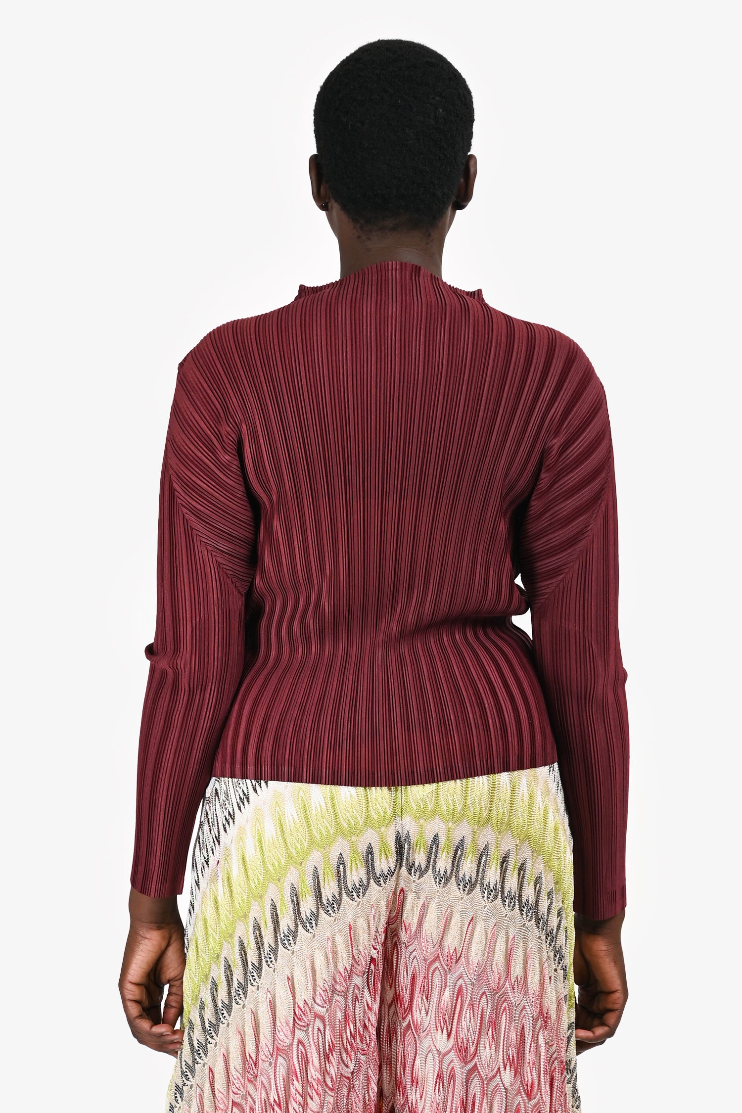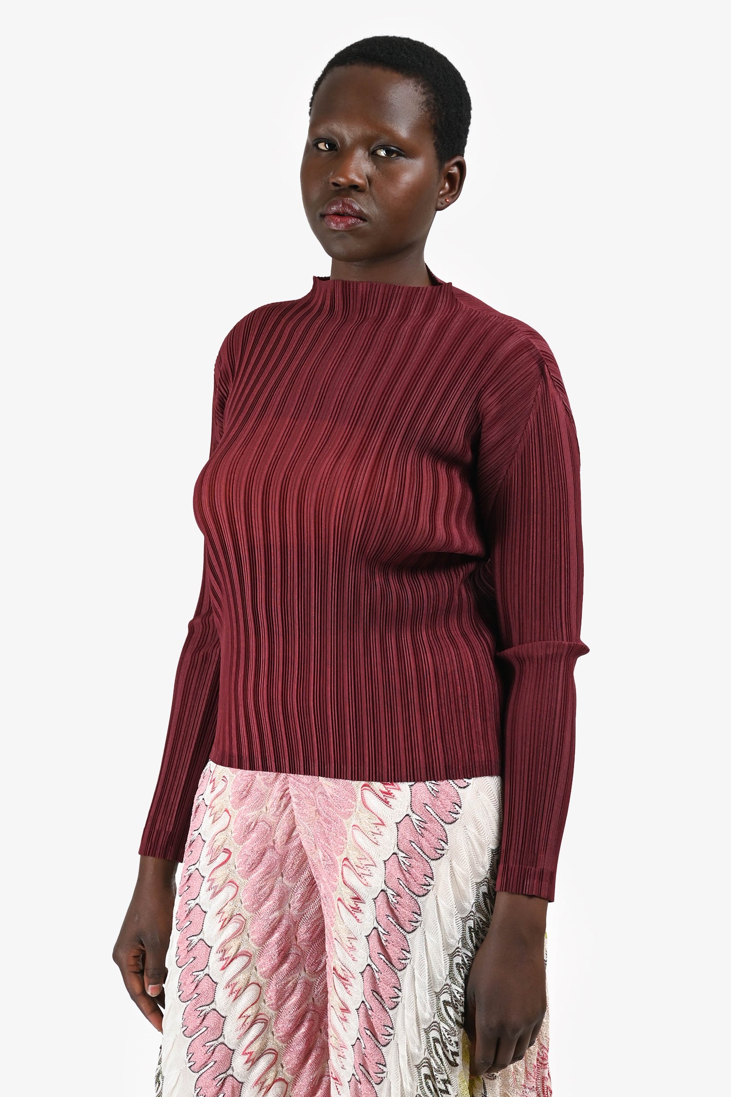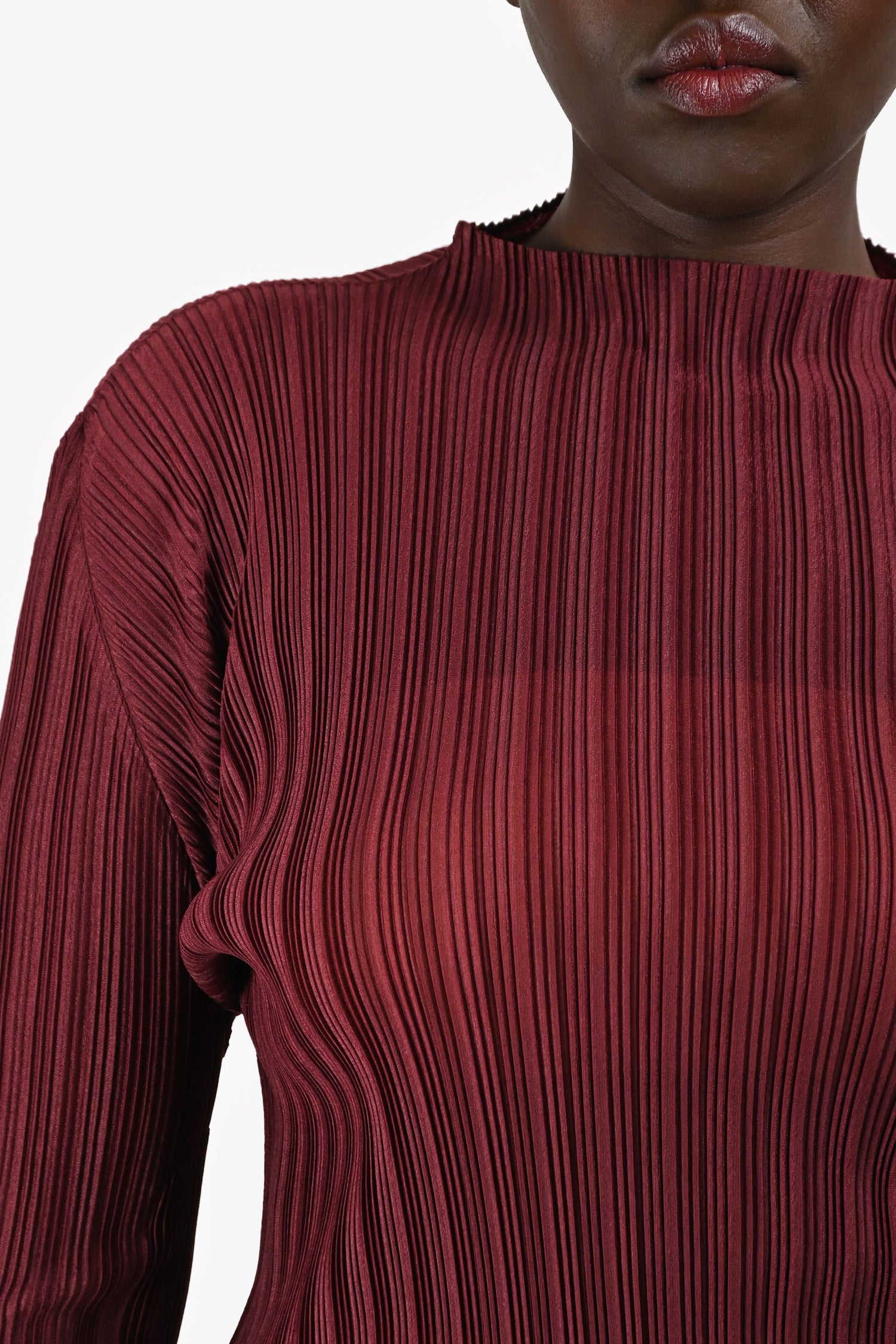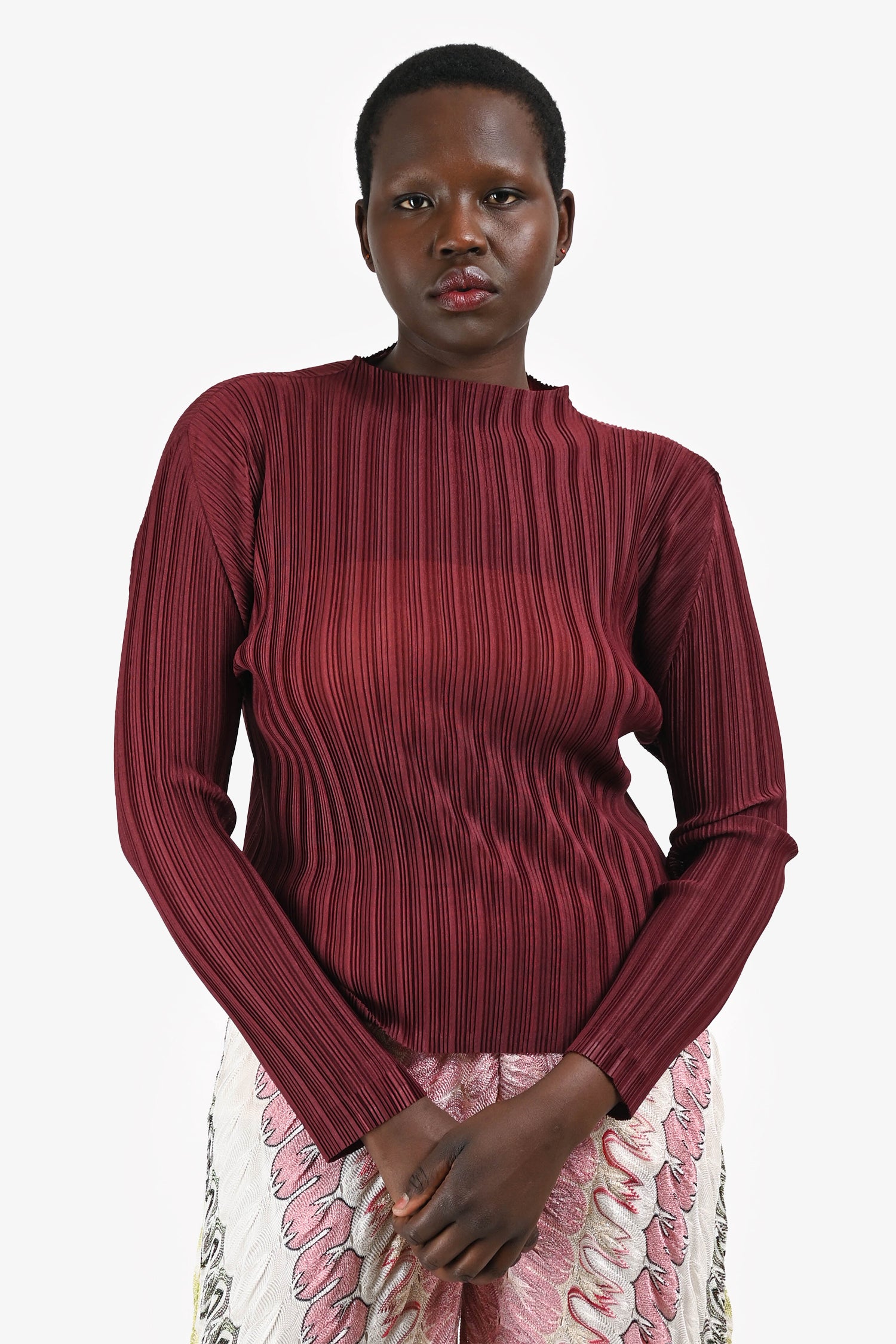 Refresh availabilityPleats Please Issey Miyake Burgundy Pleated High Neck Long Sleeves Top. Signature pleated fabric. High neckline. Long sleeves. Pull-on style. Sheer. Tonal stitching.