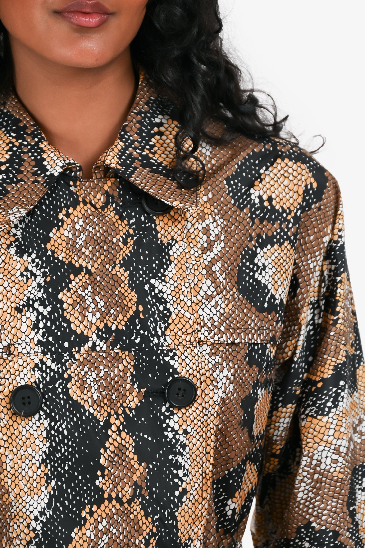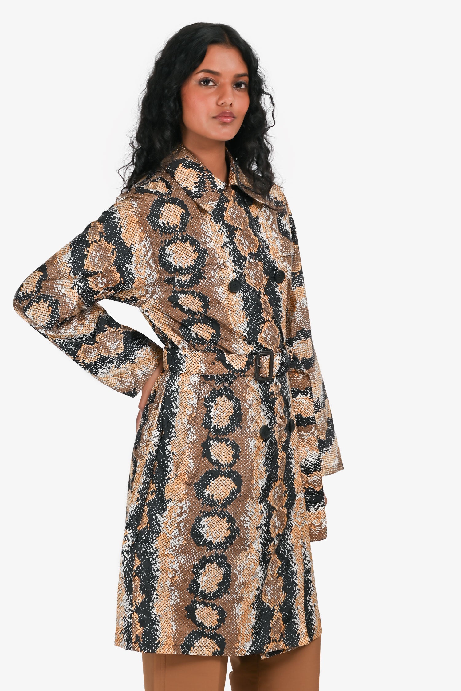Refresh availabilityPrada 2015 Brown Animal Print Nylon Belted Midi Trench Coat. Classic pointed collar. Double-breasted front with tonal buttons. Long sleeves. Adjustable matching belt at waist. Side slit pockets. Tonal stitching.