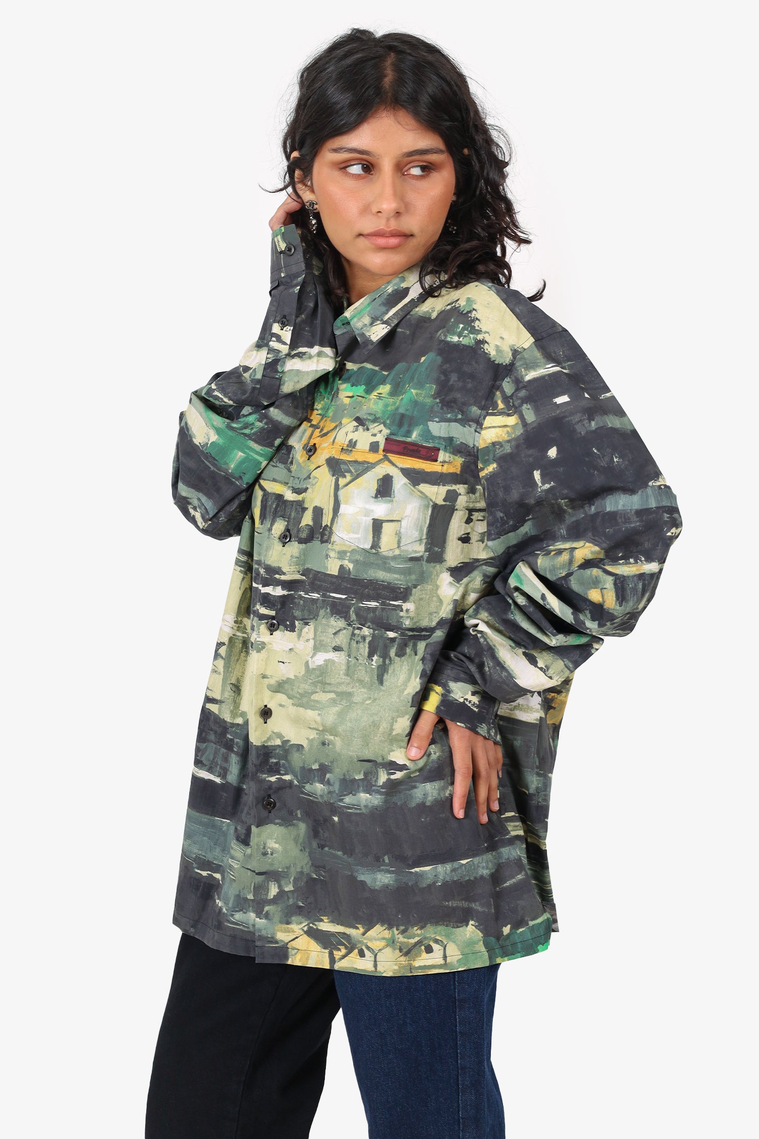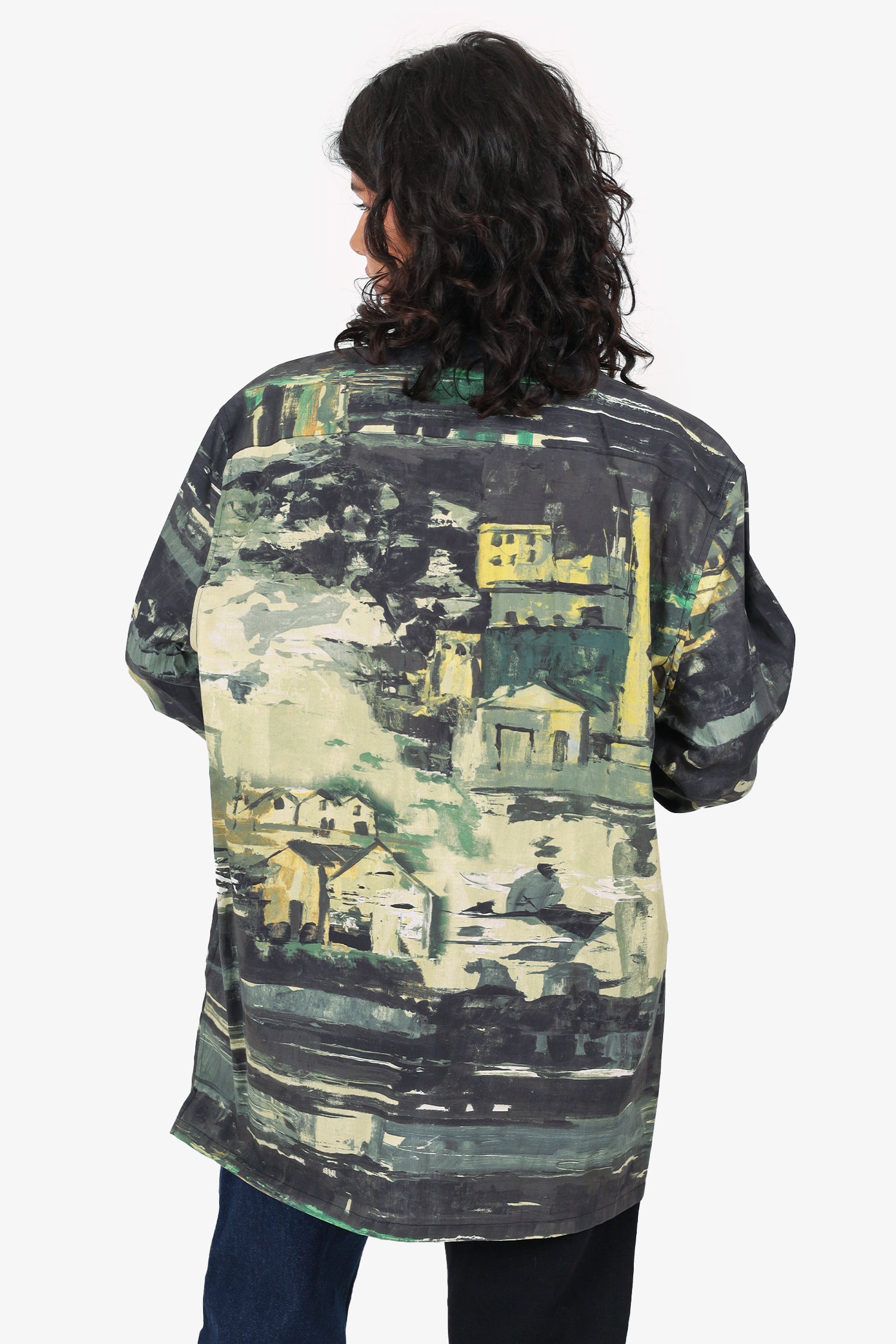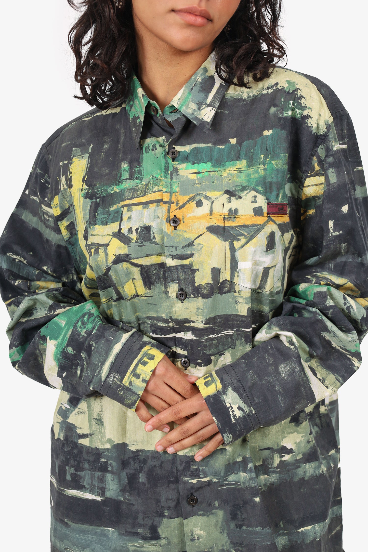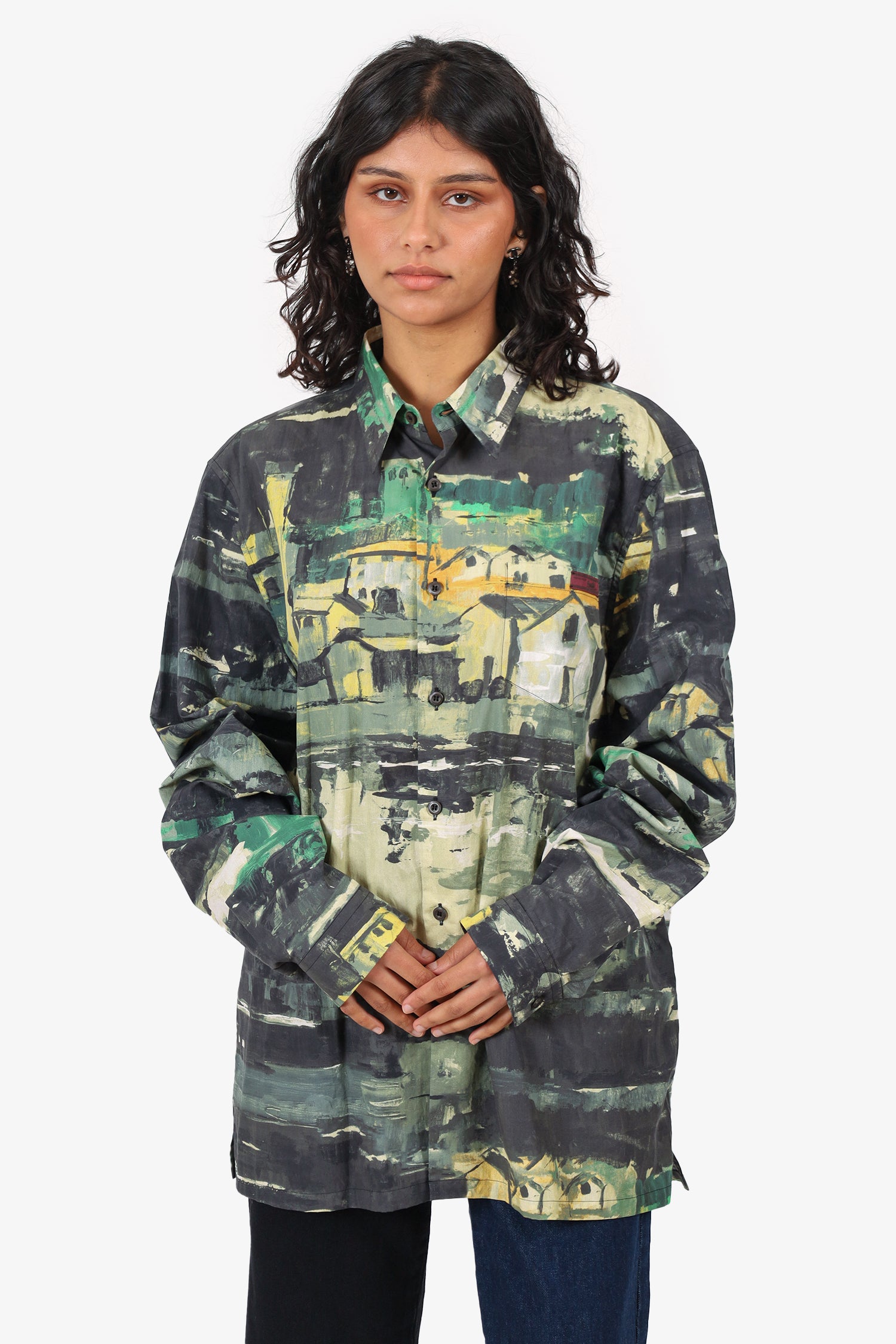 Refresh availabilityPrada 2017 Green/Multicolour Watercolour Village Button Down Shirt. Pull-on. Collared-neckline. Front button-up closure. Sleeve cuffs with button-up closure. Single exterior slip pocket. Tonal stitching.