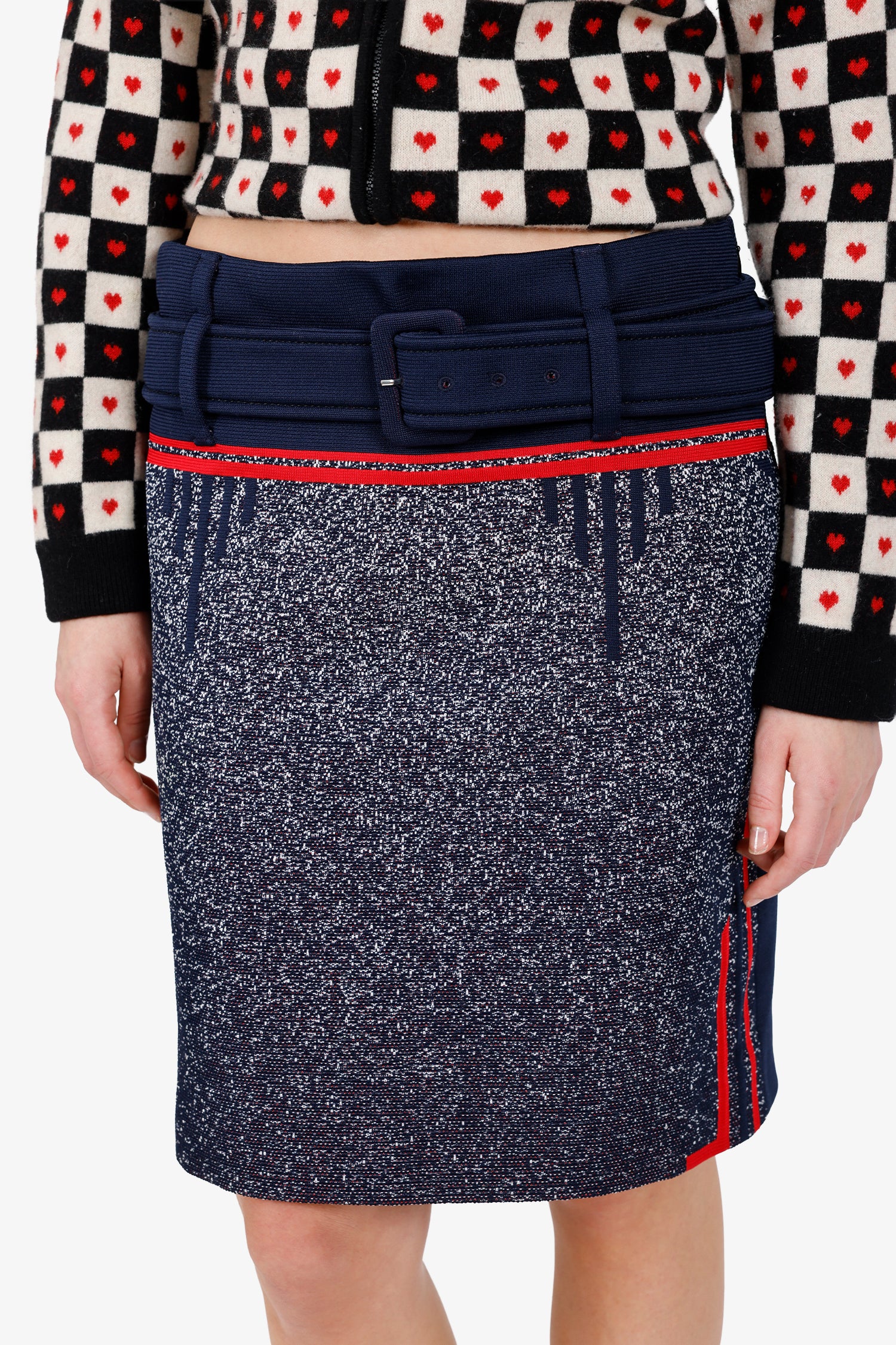 Refresh availabilityPrada 2018 Navy/Red Speckle Skirt. Slip-on. Rear zip closure. Removable belt with adjustable pull-through buckle closure. Waistband belt-loops. Single rear slit. Lined interior. Silver-tone hardware. Tonal stitching.