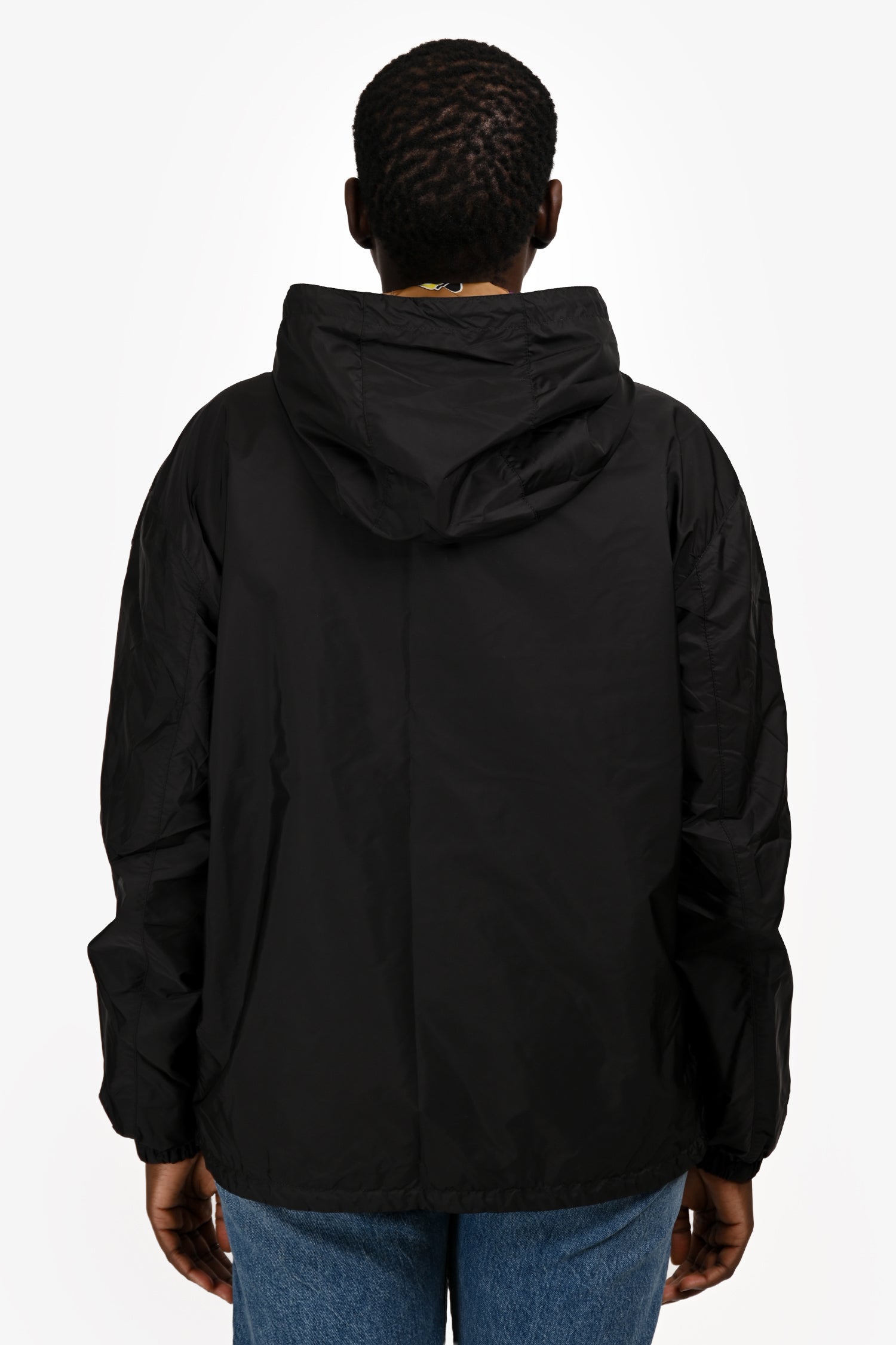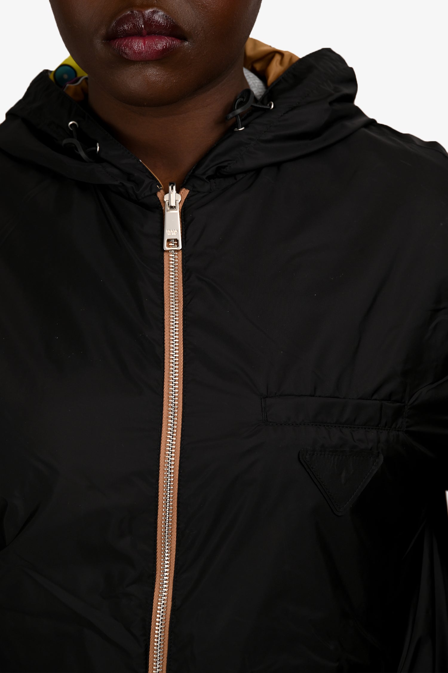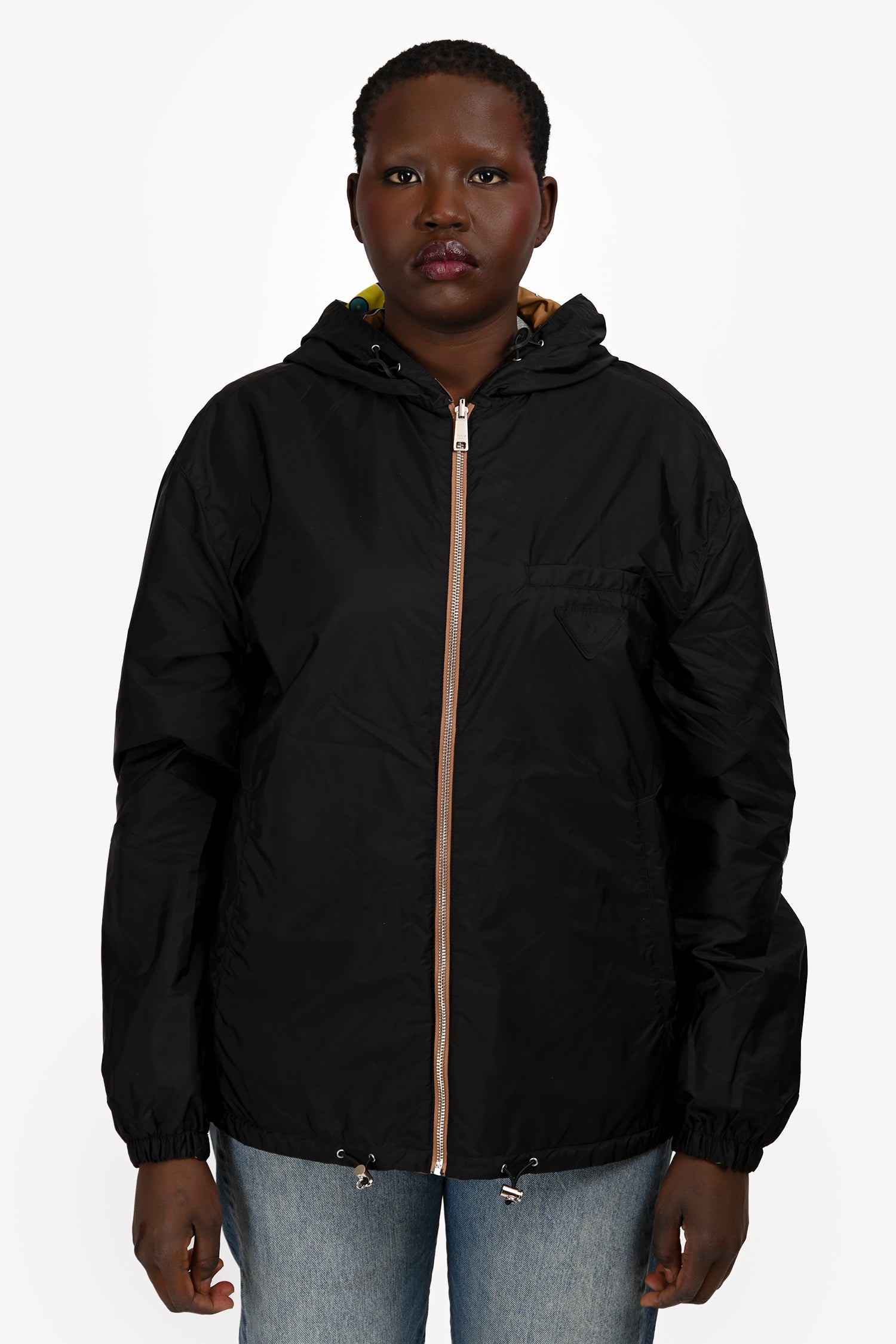 Refresh availabilityPrada 2019 Black/Brown Patterned Reversible Windbreaker Jacket. Slip-on. Hooded neckline. Front zip closure. Elasticized cuffs. 2 exterior zip pockets on each side; 1 chest pocket with velcro closure on the black side. Drawstring hem. Silver-tone hardware. Tonal stitching.