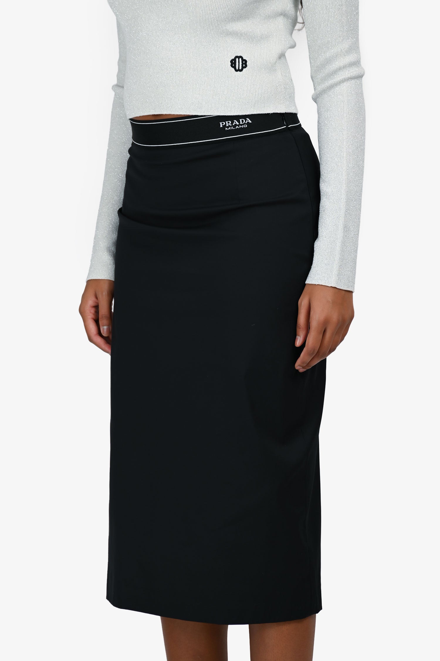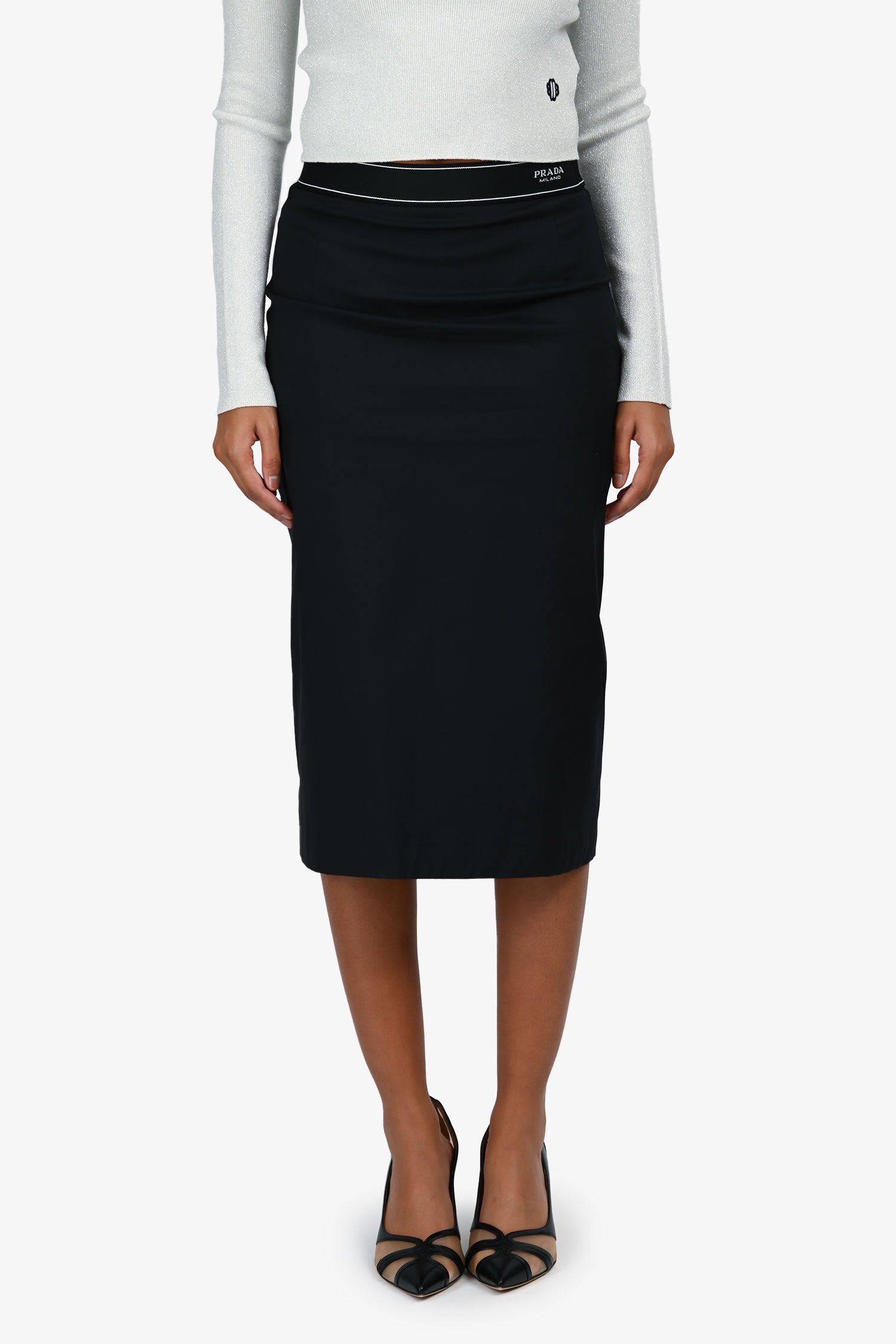 Refresh availabilityPrada 2021 Black Nylon Logo Waistband Midi Skirt. Slip-on. Side zip closure. Elasticized logo waistband. Rear slit. Lined interior. Tonal stitching.