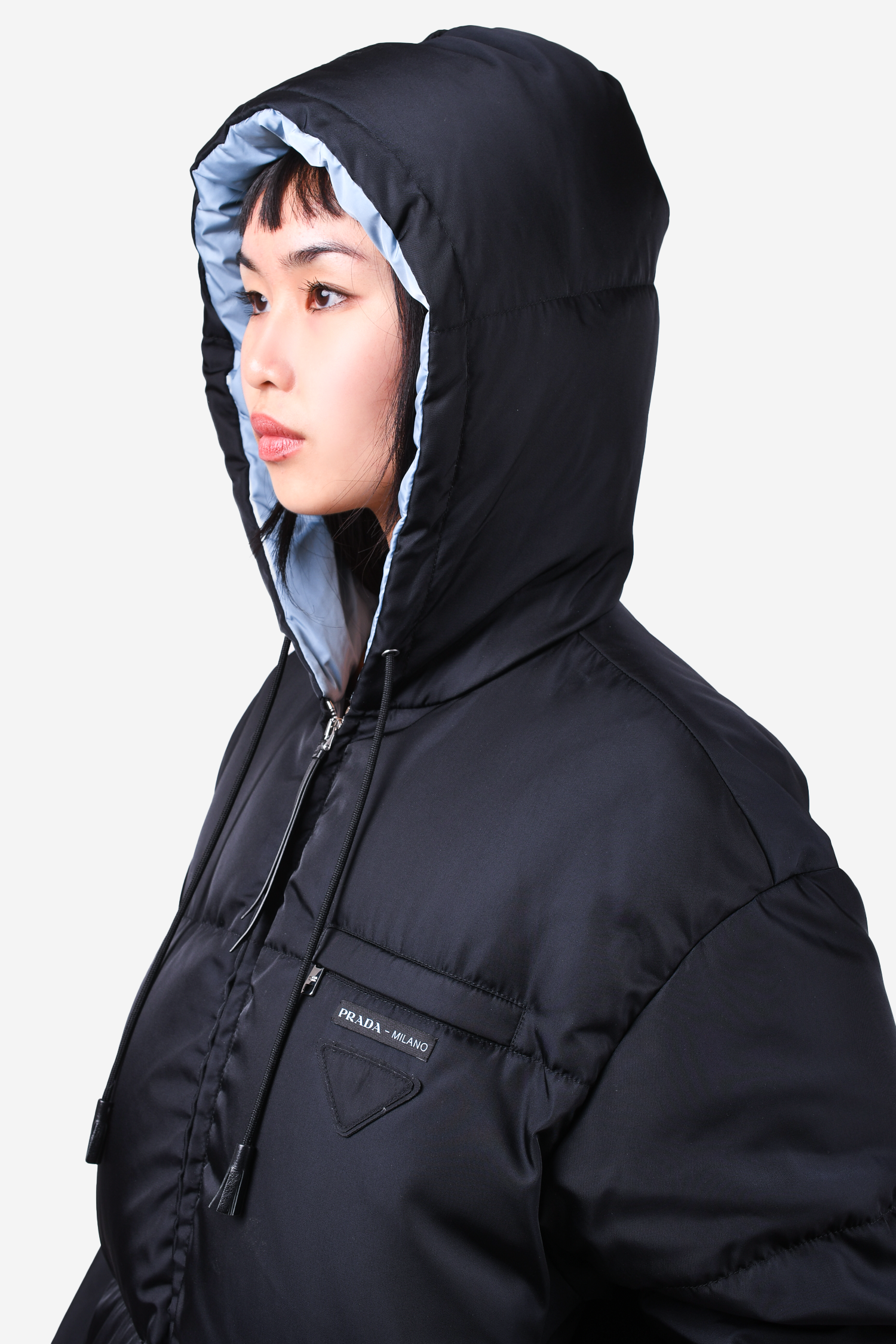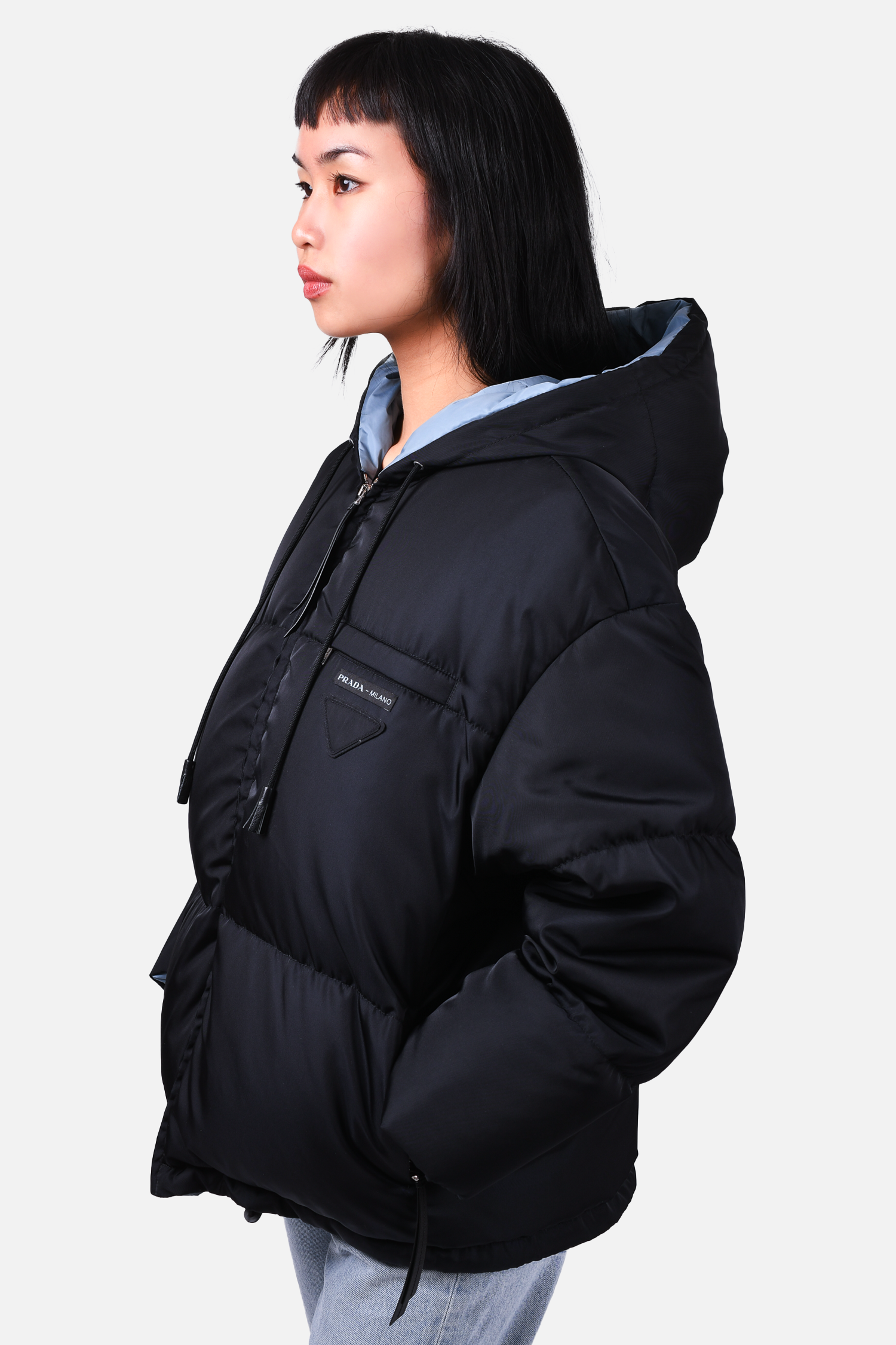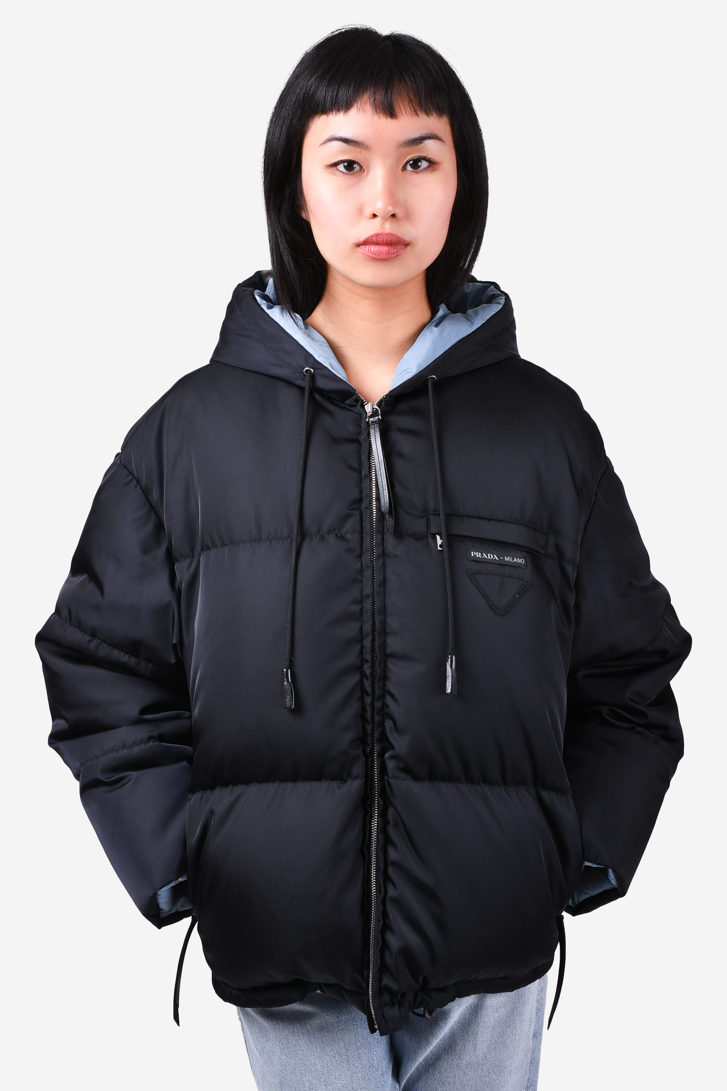 Refresh availabilityPrada 2022 Black Down Puffer Jacket. Front zip closure. Front zip pockets. Brand name patch at the front. Tonal stitching.