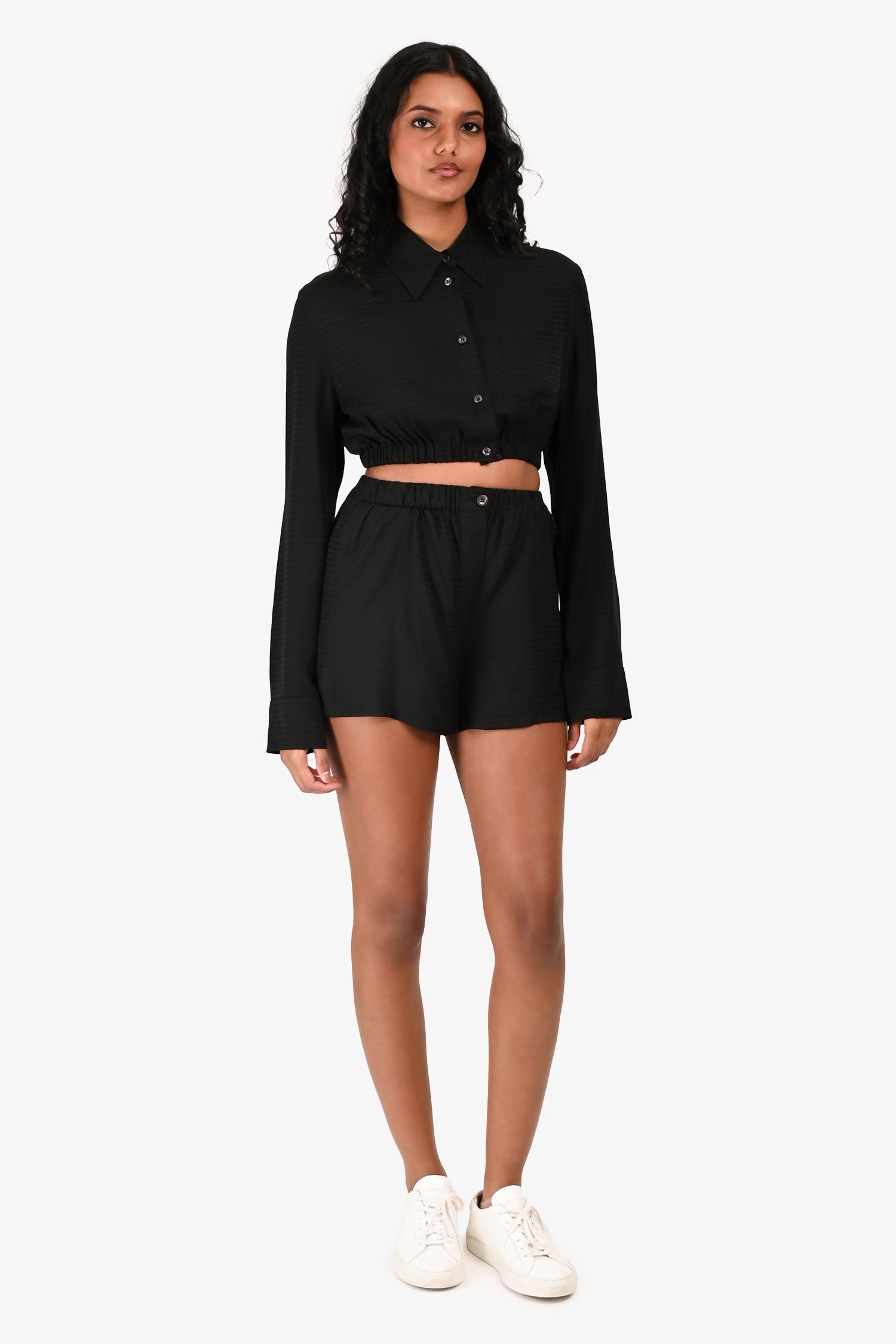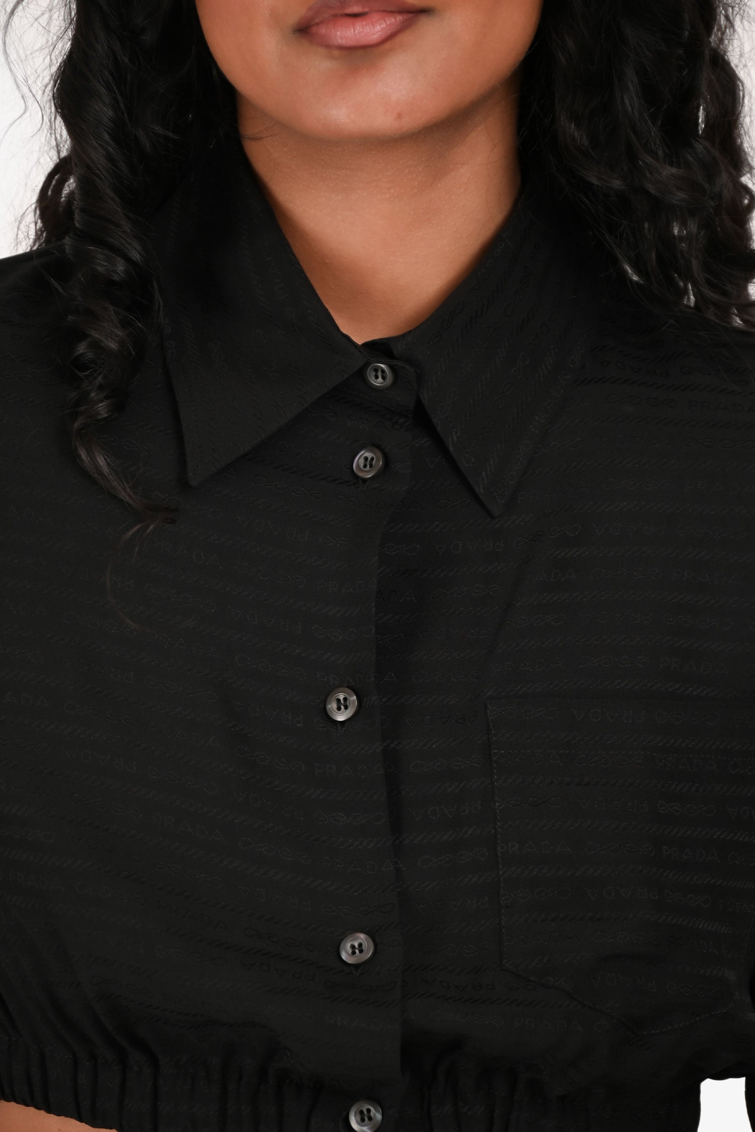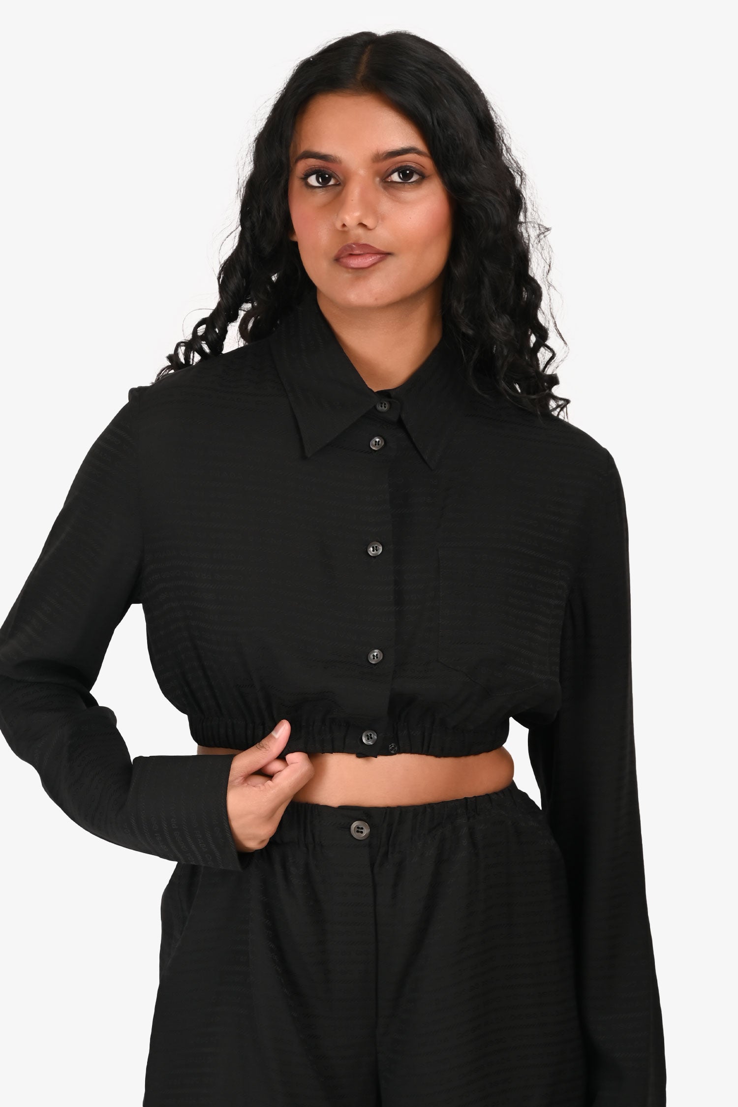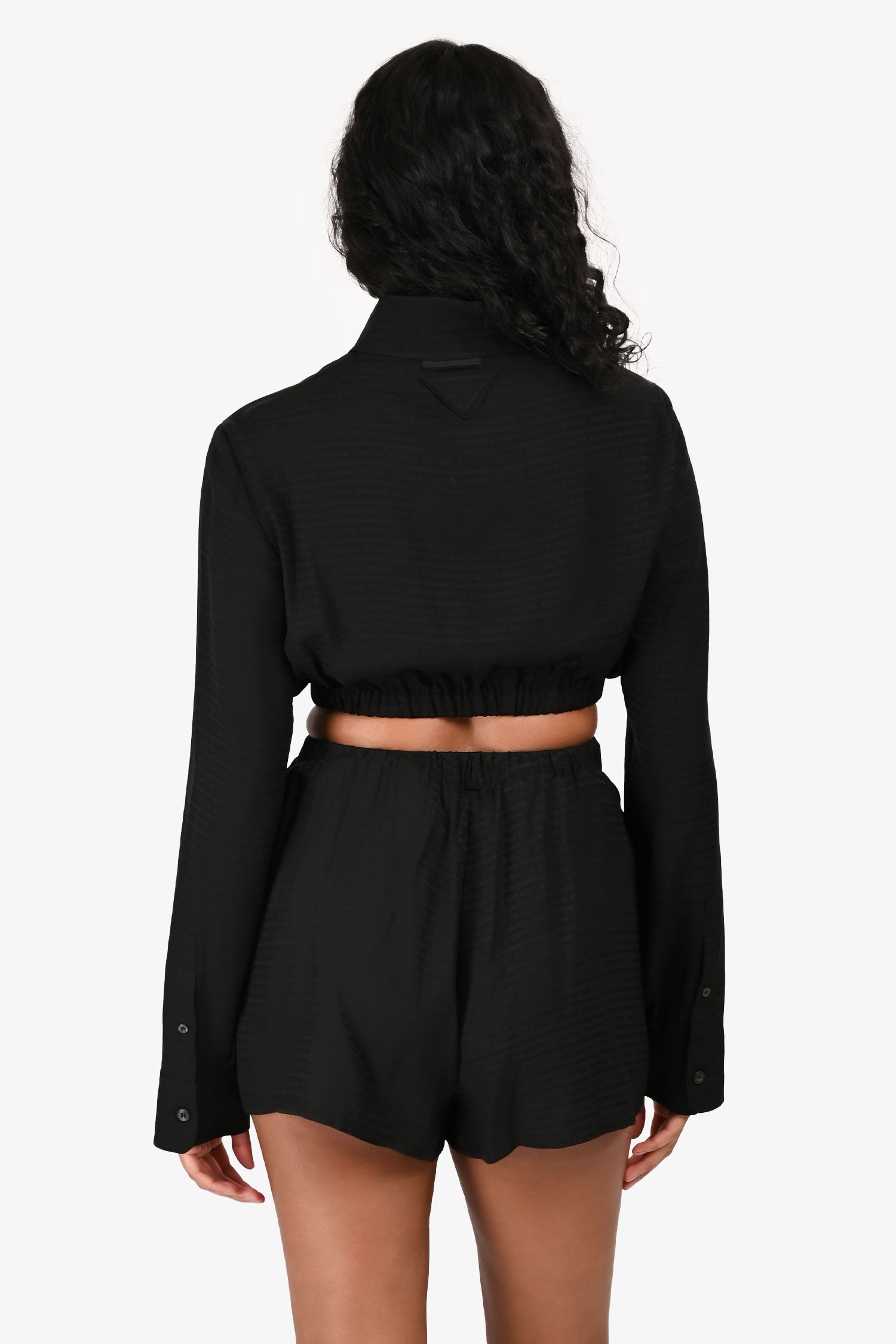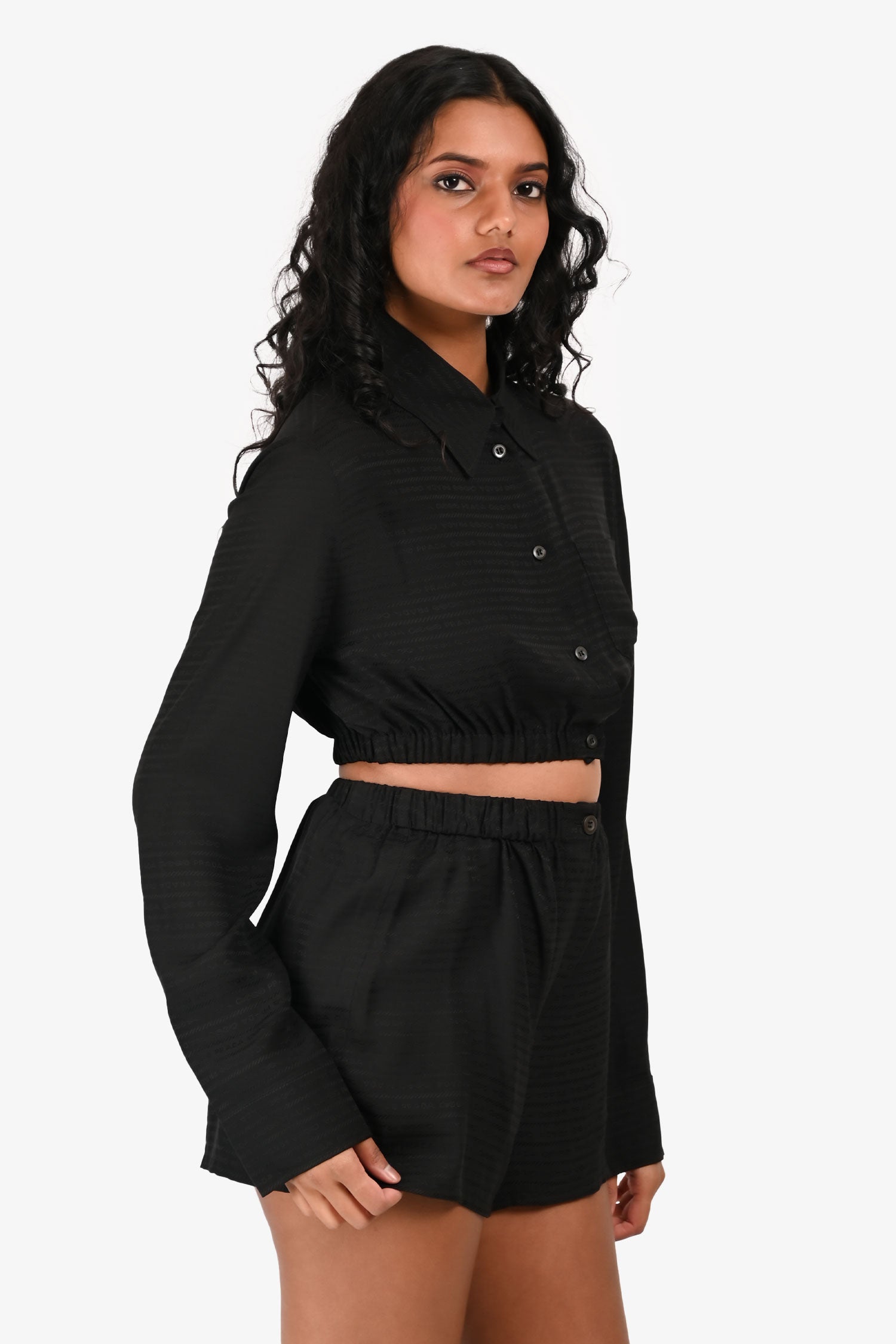 Refresh availabilityPrada 2022 Black Jacquard Logo Silk Cropped Button-Up Top + Shorts Set. Top: Front button closure. One patch pocket. Elastic waistband. Button detailing on the cuff with a placket. Shorts: Hidden fly with a button closure and one visible top button. Elastic waistband. Both the top and shorts have tonal stitching.