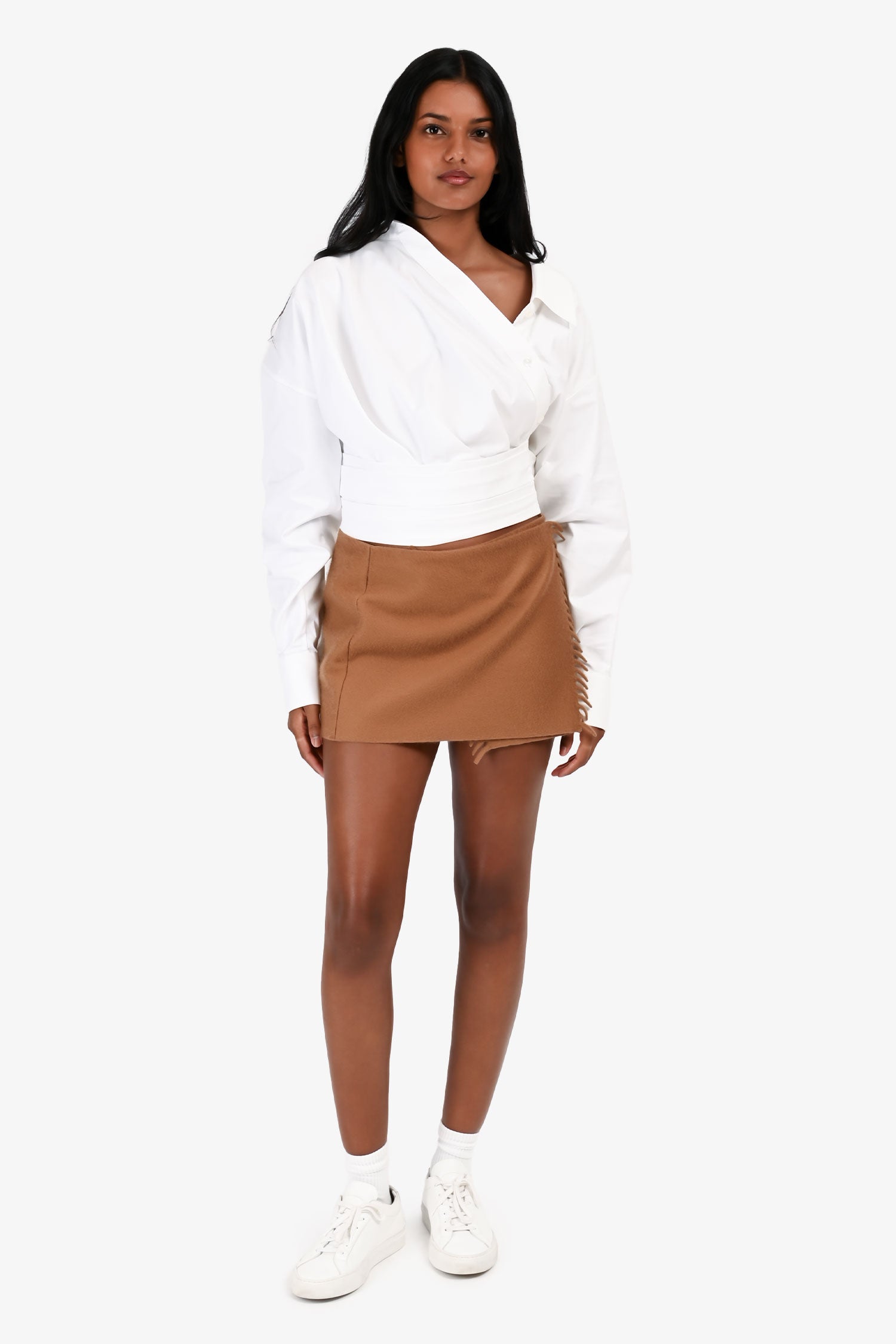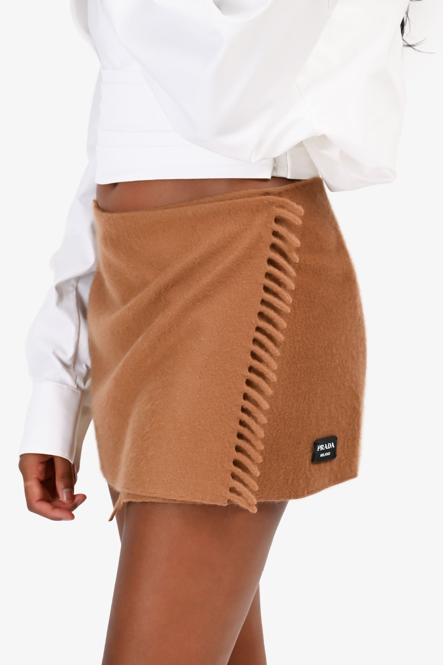 Refresh availabilityPrada 2023 Brown Cashmere Fringe Scarf Mini Skirt. Wrap design with interior button and hook closures. Black leather brand patch. Tonal stitching.