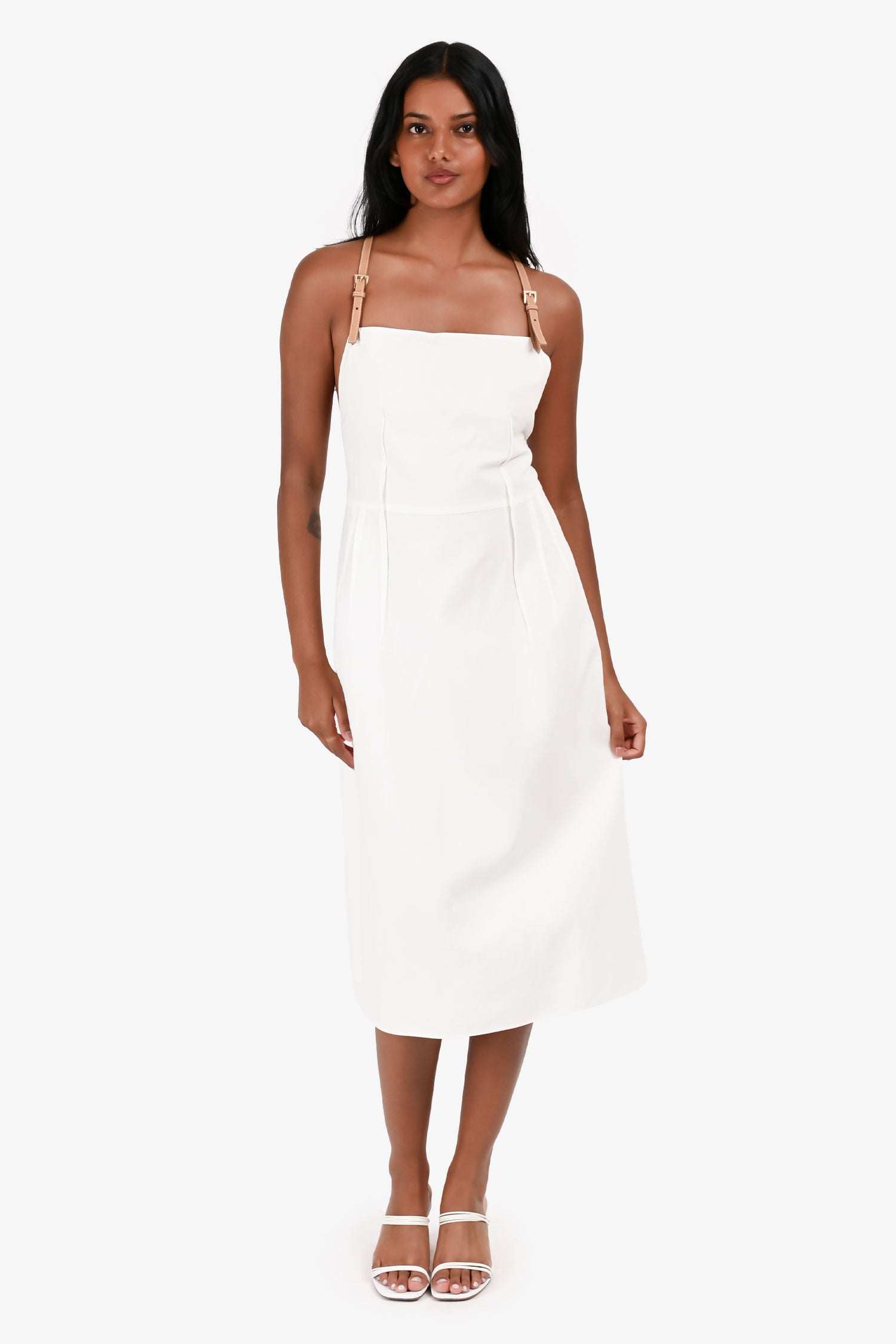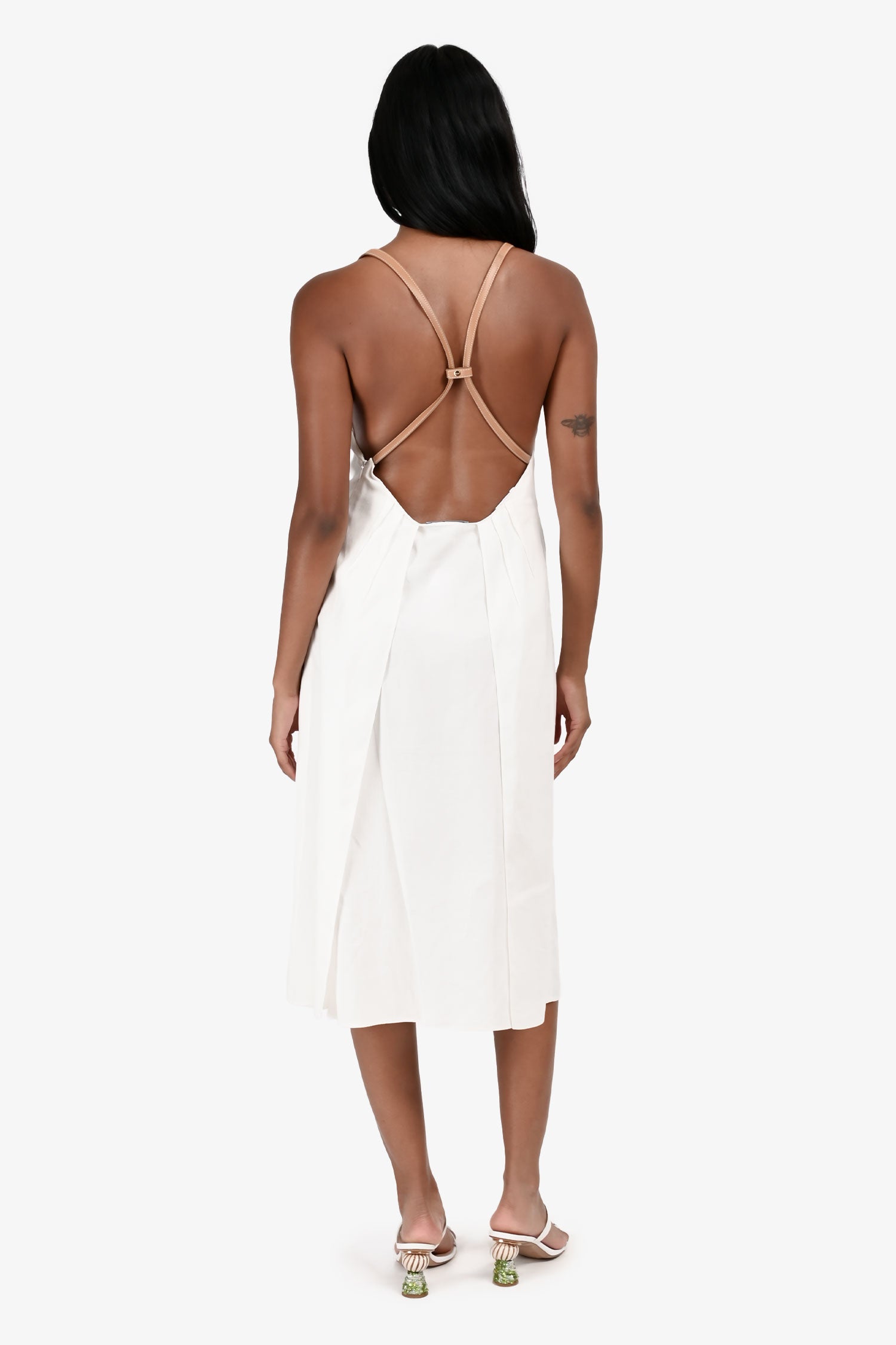 Prada 2023 White Linen/Cotton Brown Leather Strap Midi Dress Size 38