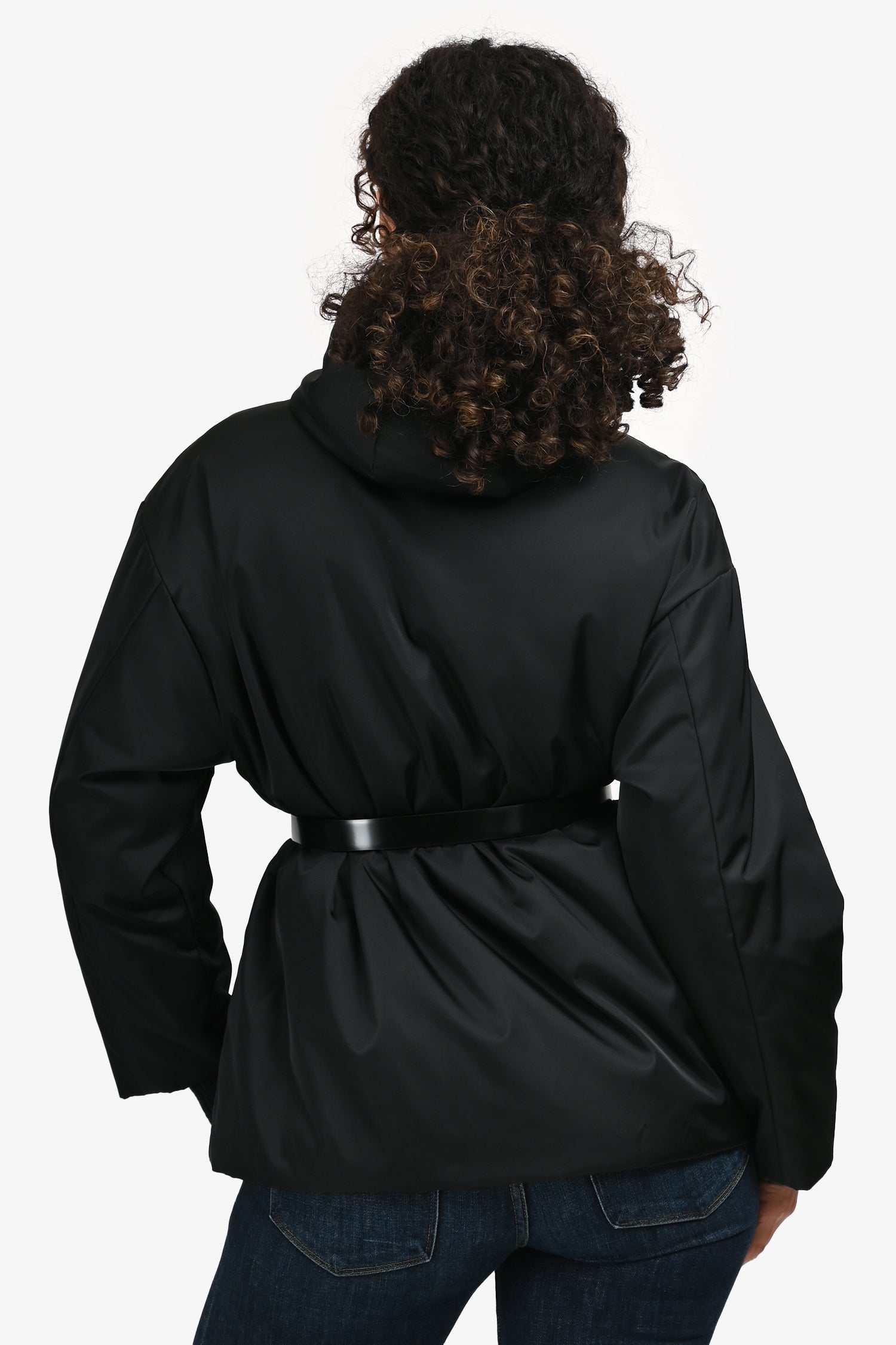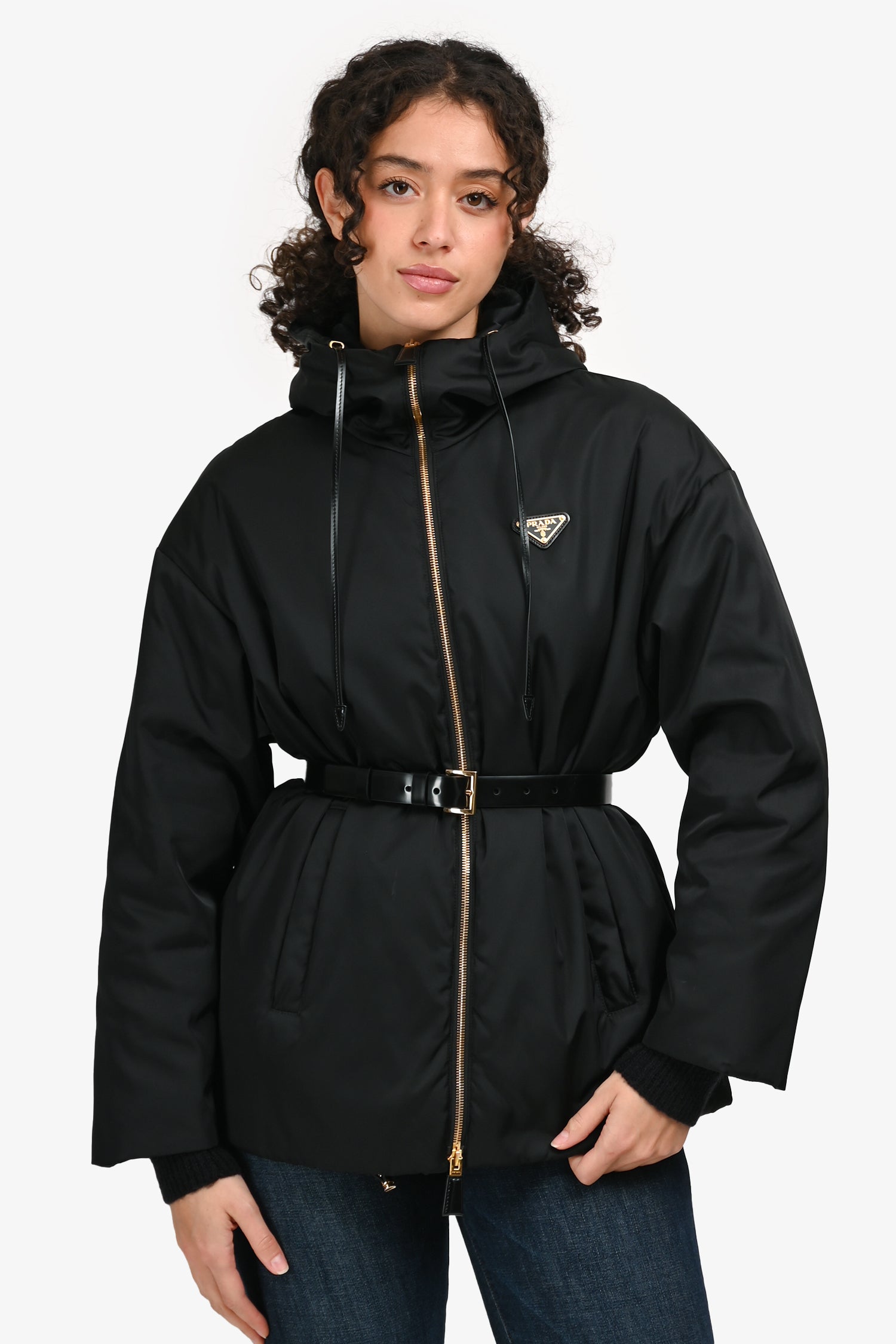 Refresh availabilityPrada 2024 Black Re-Nylon Logo Plaque Hooded Jacket with Belt. Slip-on. Front zip closure. Adjustable hood. Removable belt. 2 exterior zip pockets; 1 interior slip pocket. Fully lined. Gold-tone hardware. Tonal stitching.