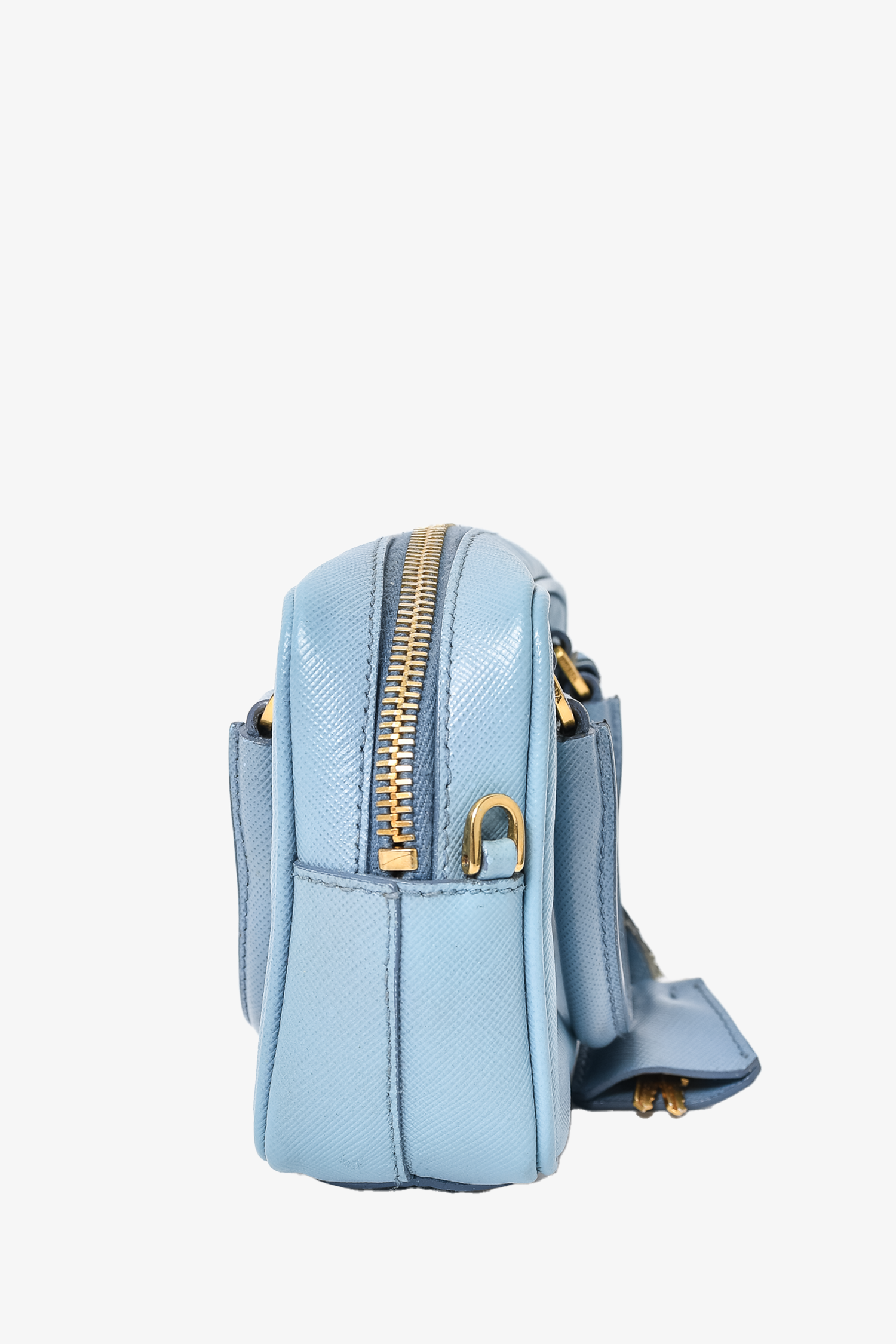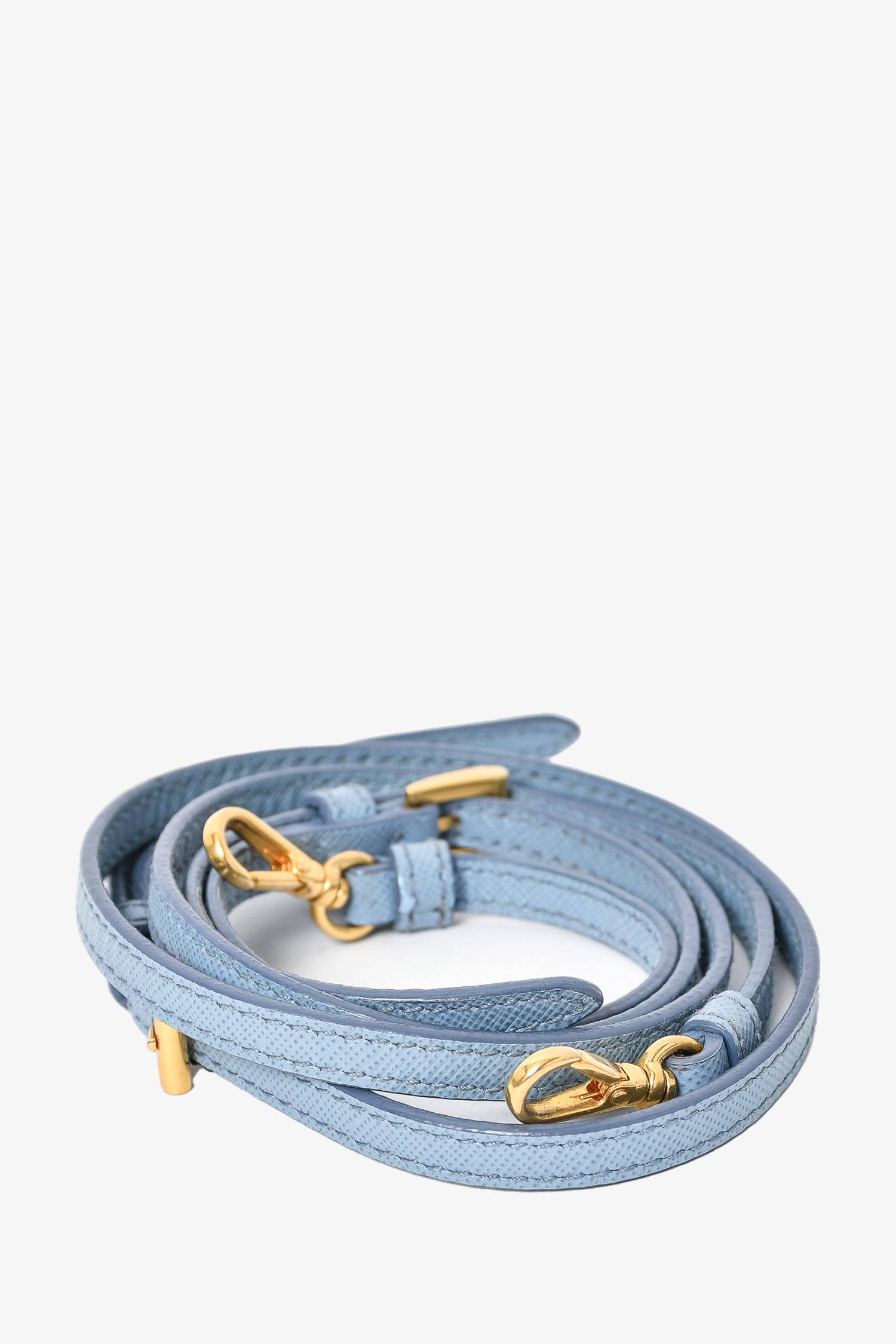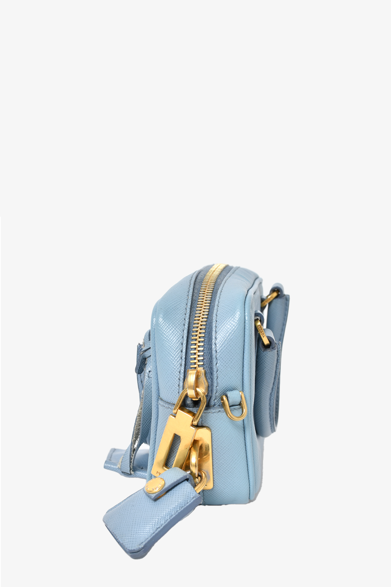 Prada Baby Blue Saffiano Leather Micro Bag with Strap. Dual rolled handles. Top zip closure. Tonal logo'd textile interior lining. Open interior. Removable and adjustable strap. Detachable clochettes with keys and lock. Protective metal bottom. Gold-tone hardware. Tonal stitching.