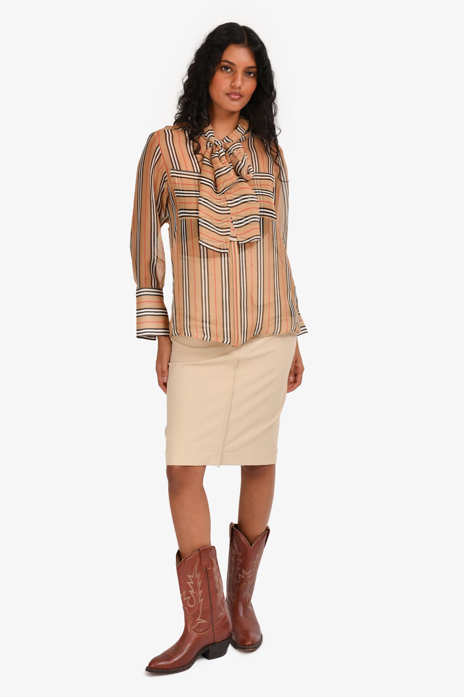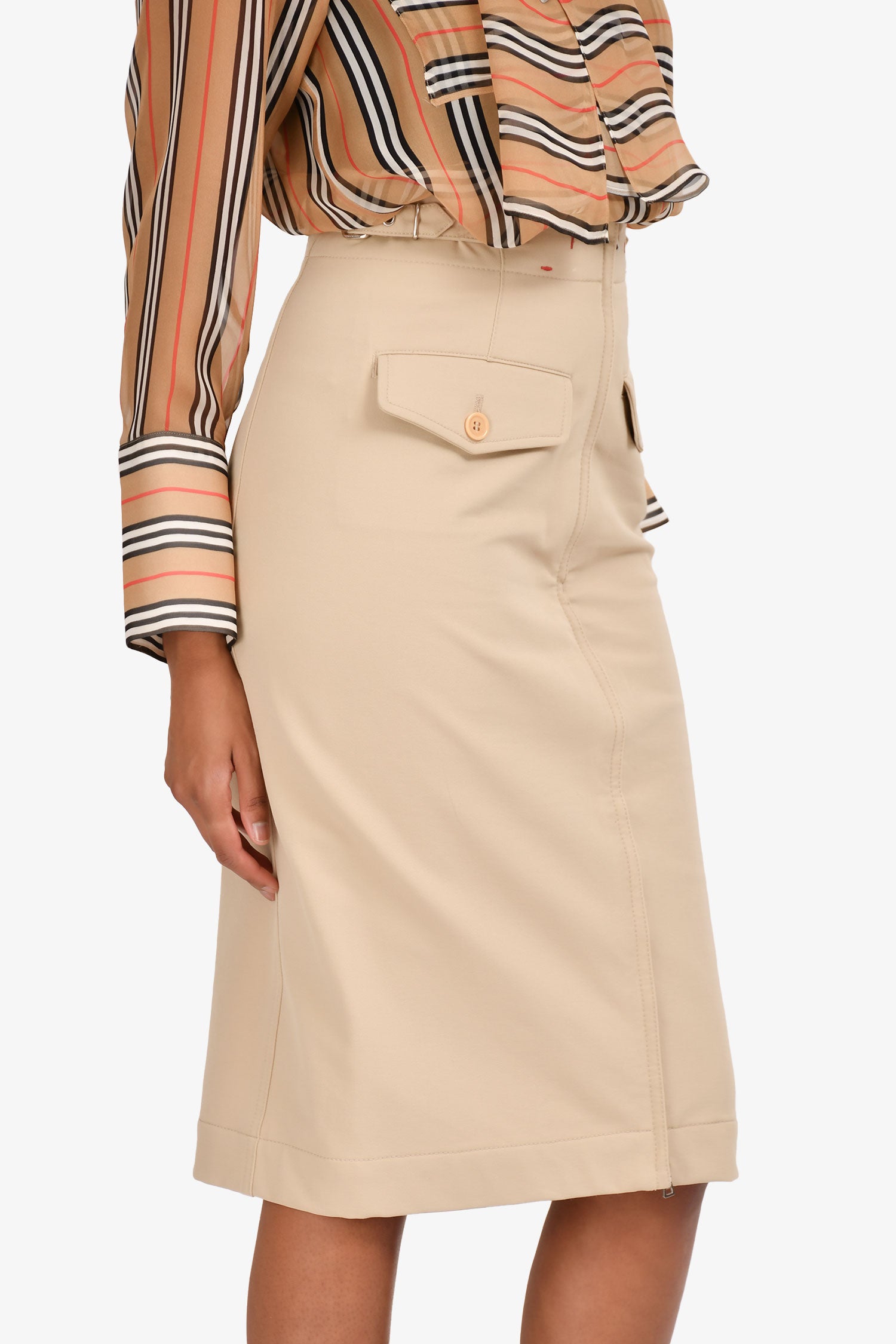 Refresh availabilityPrada Beige Belted Pencil Skirt. Back zip closure. Back flap pockets. Rear zip vent. Tonal stitching.