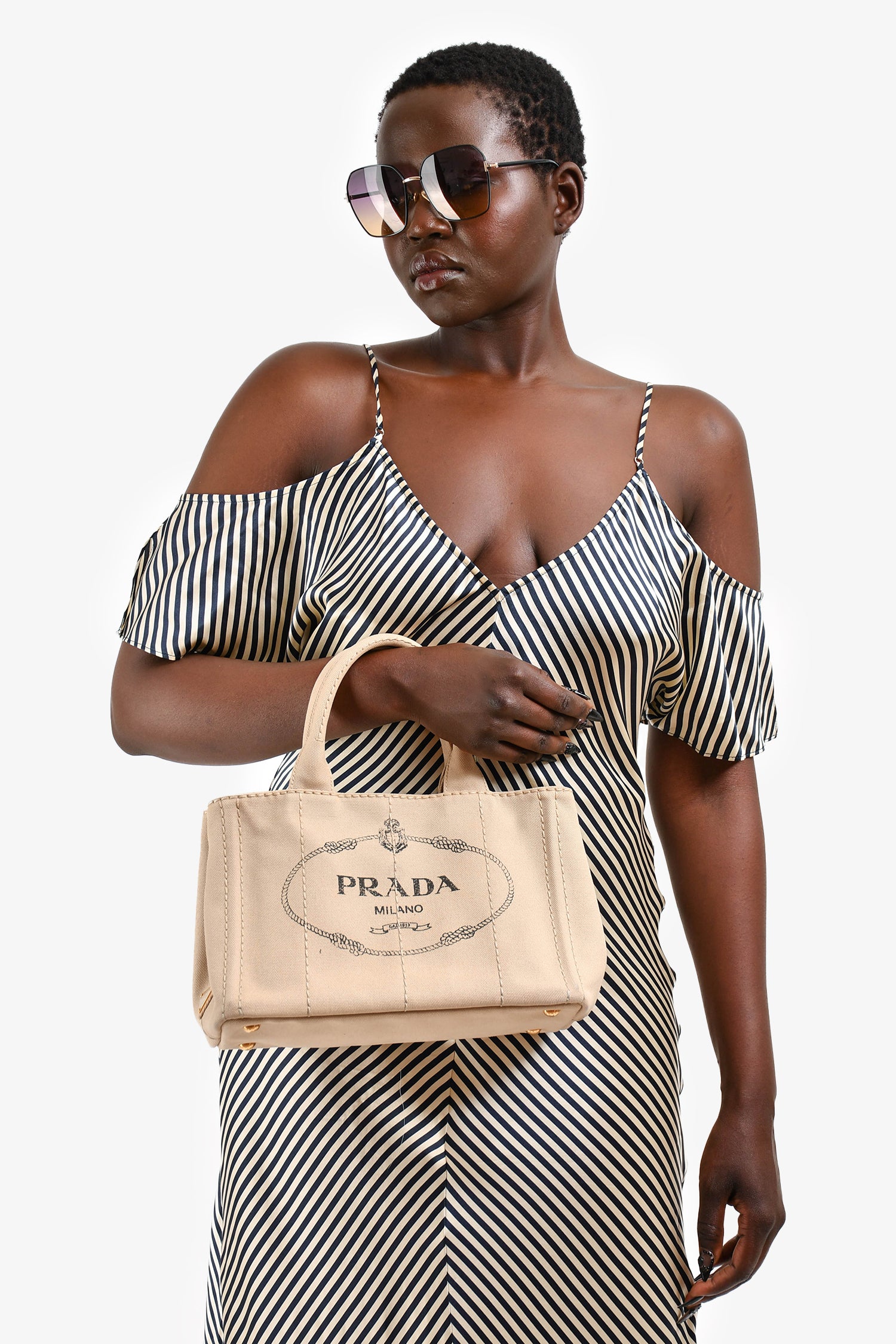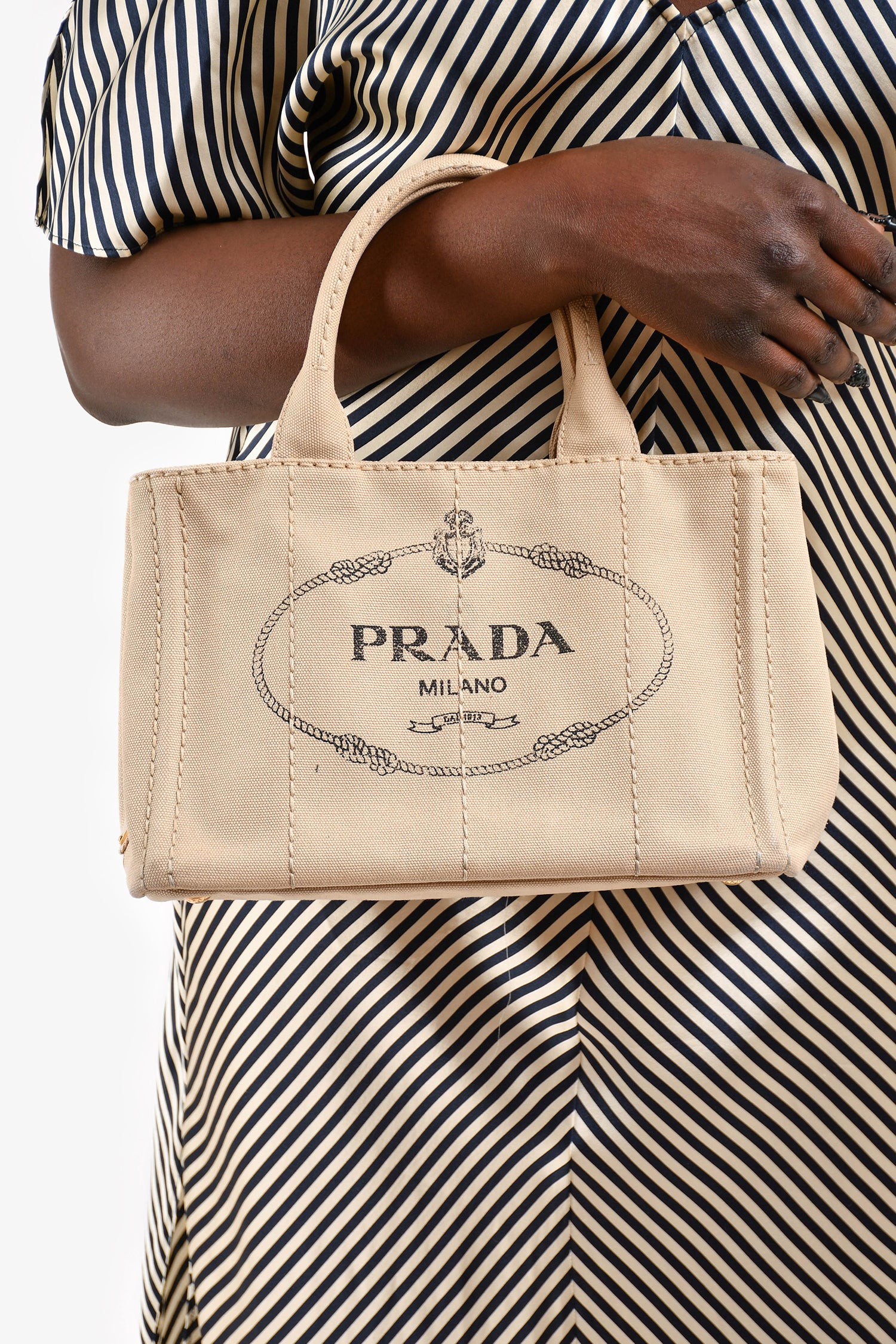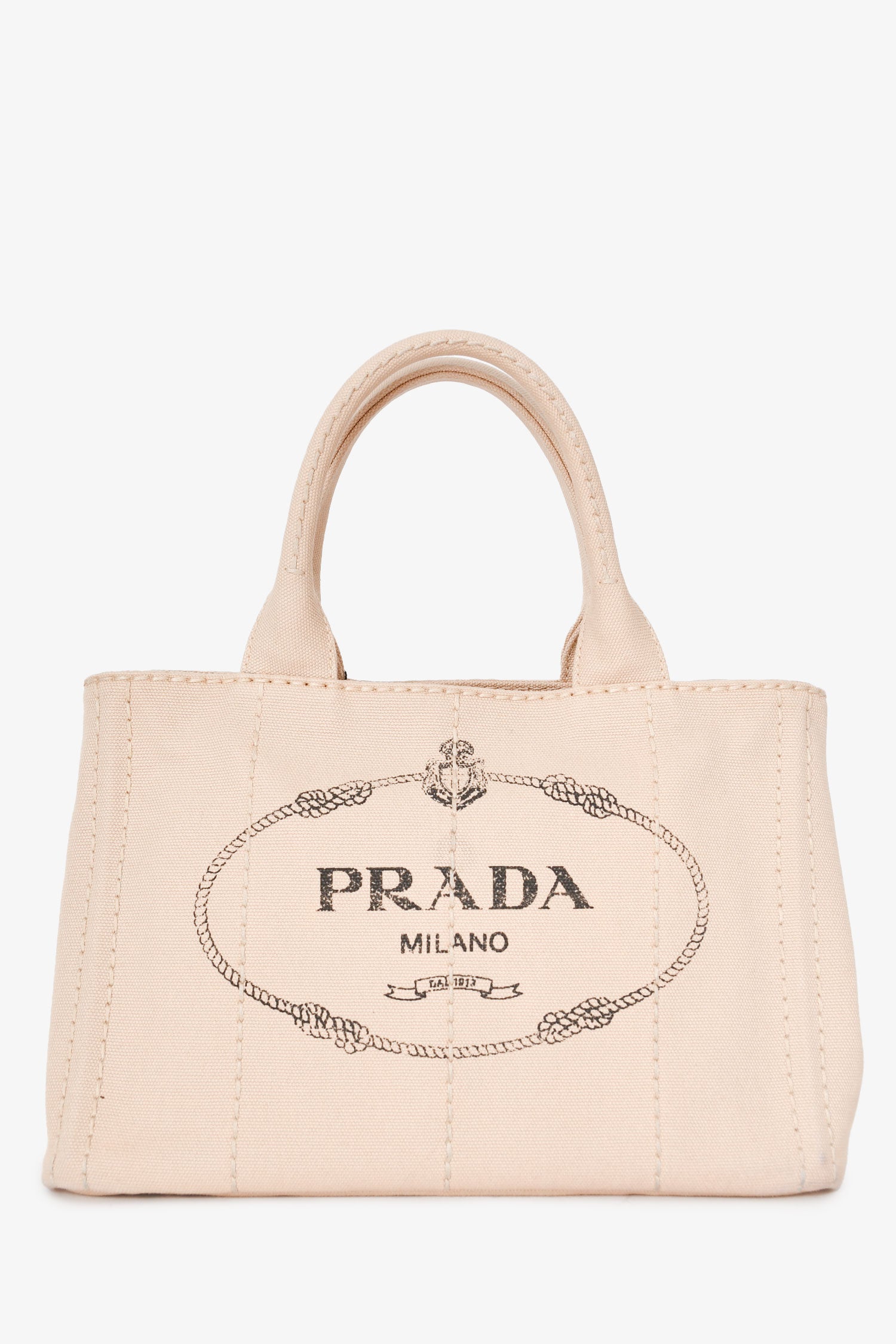 Refresh availabilityPrada Beige/Black Canvas Small Canapa Top Handle Bag with Strap. Dual top handles and detachable shoulder strap. Open top with snap closures at sides. Interior features zip and two slip pockets. Gold-tone hardware. Tonal stitching.