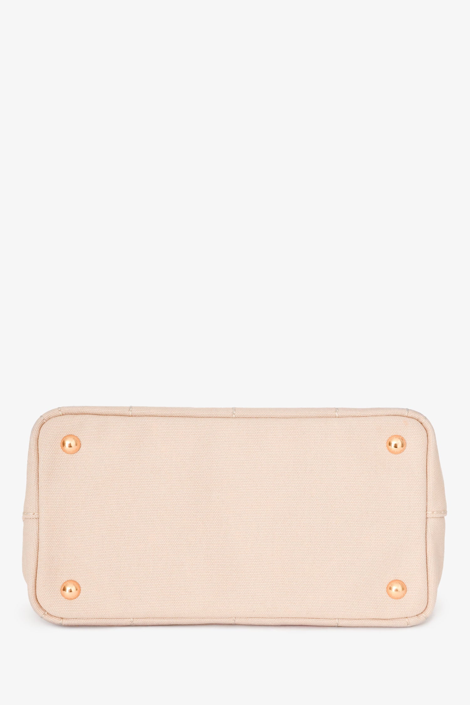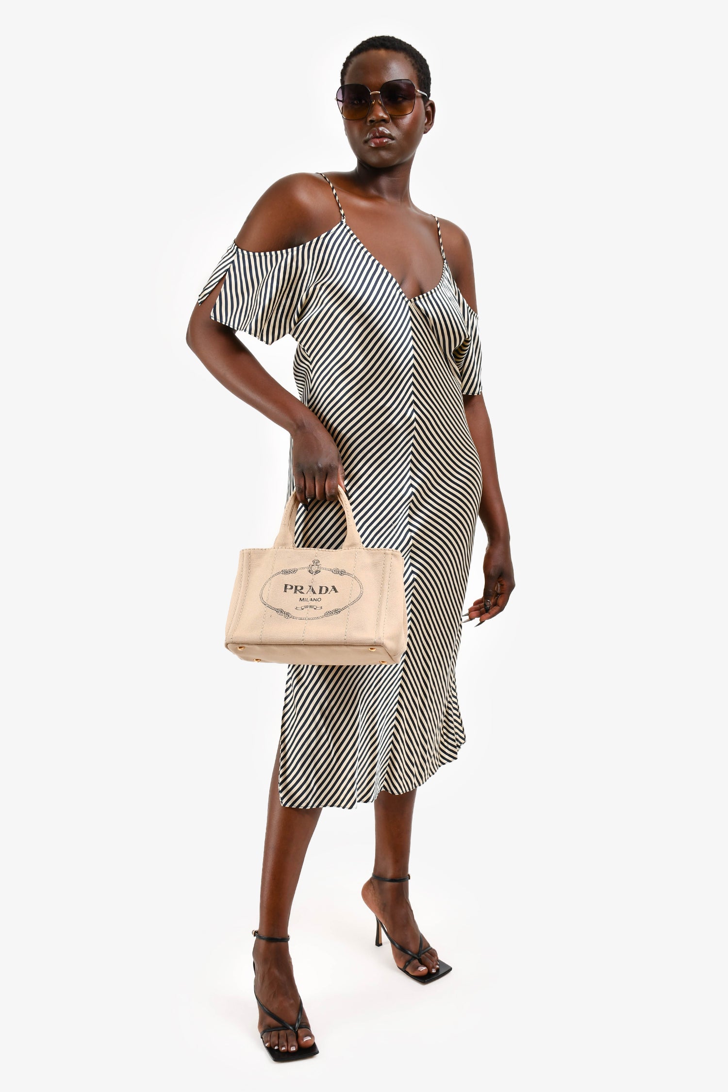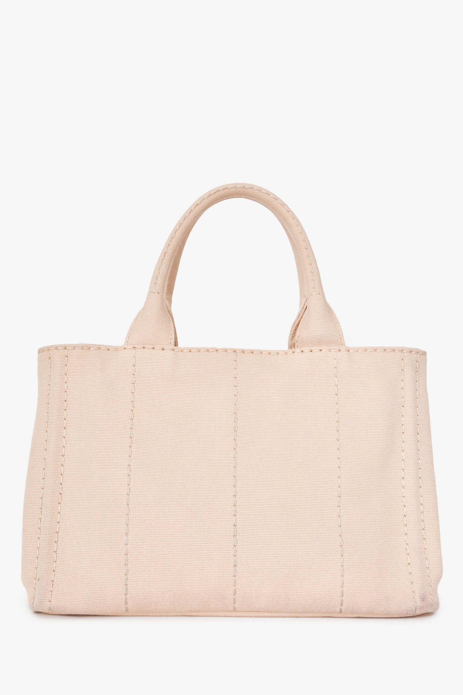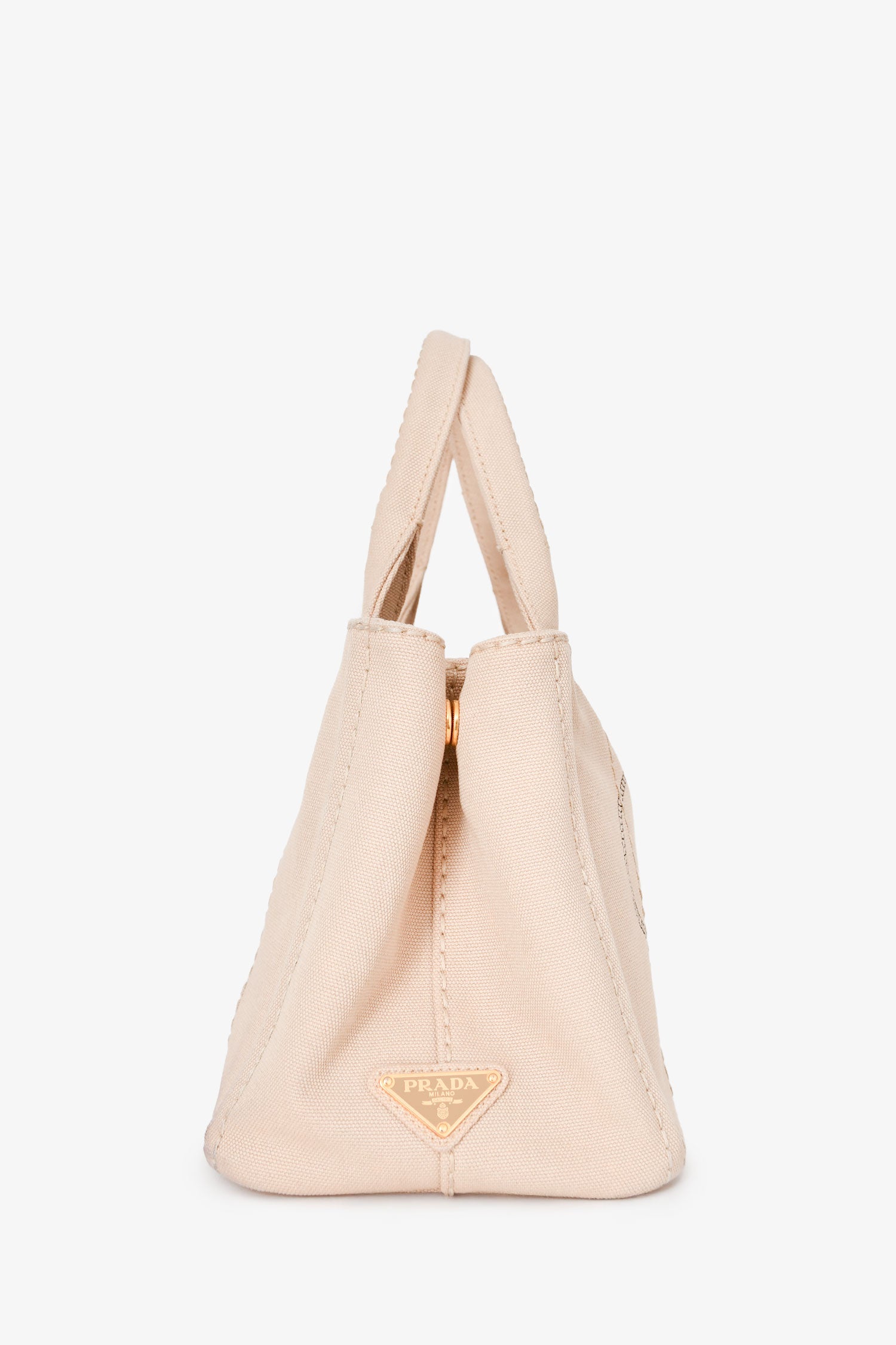 Refresh availabilityPrada Beige/Black Canvas Small Canapa Top Handle Bag with Strap. Dual top handles and detachable shoulder strap. Open top with snap closures at sides. Interior features zip and two slip pockets. Gold-tone hardware. Tonal stitching.
