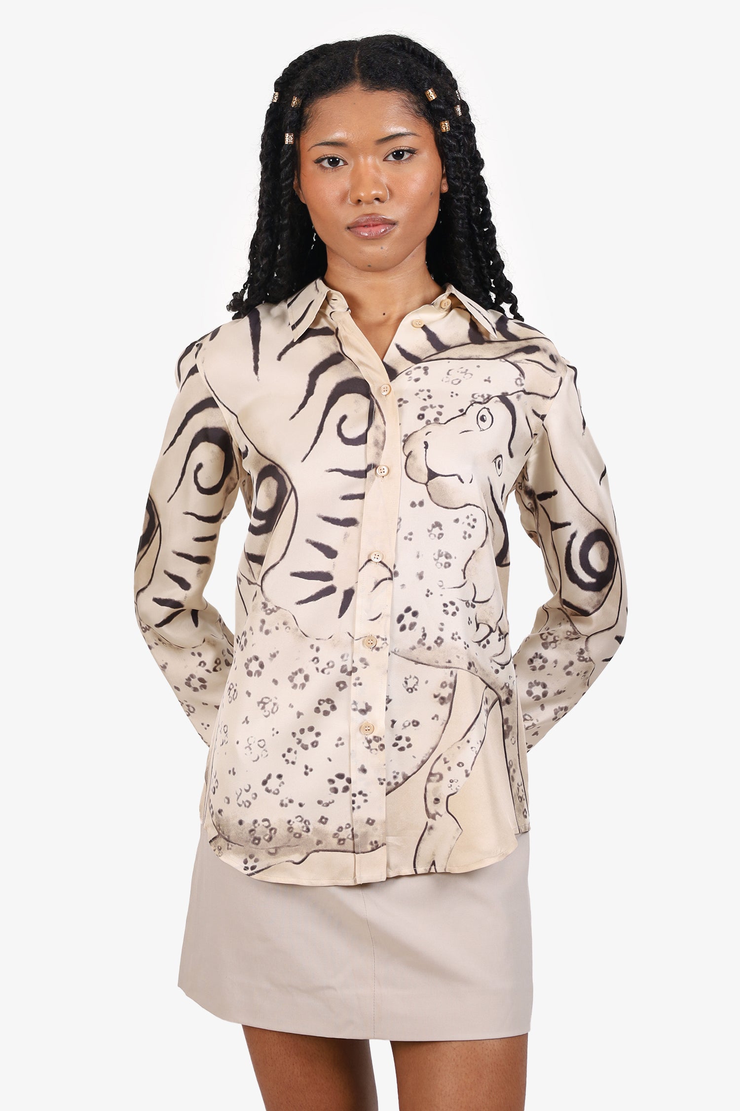 Refresh availabilityPrada Beige/Black Silk Tiger Print Blouse. Collared neckline. Front button-up closure. Sleeve cuffs with button-up closure. Tonal stitching.