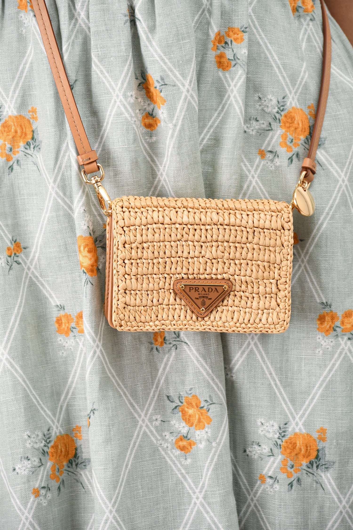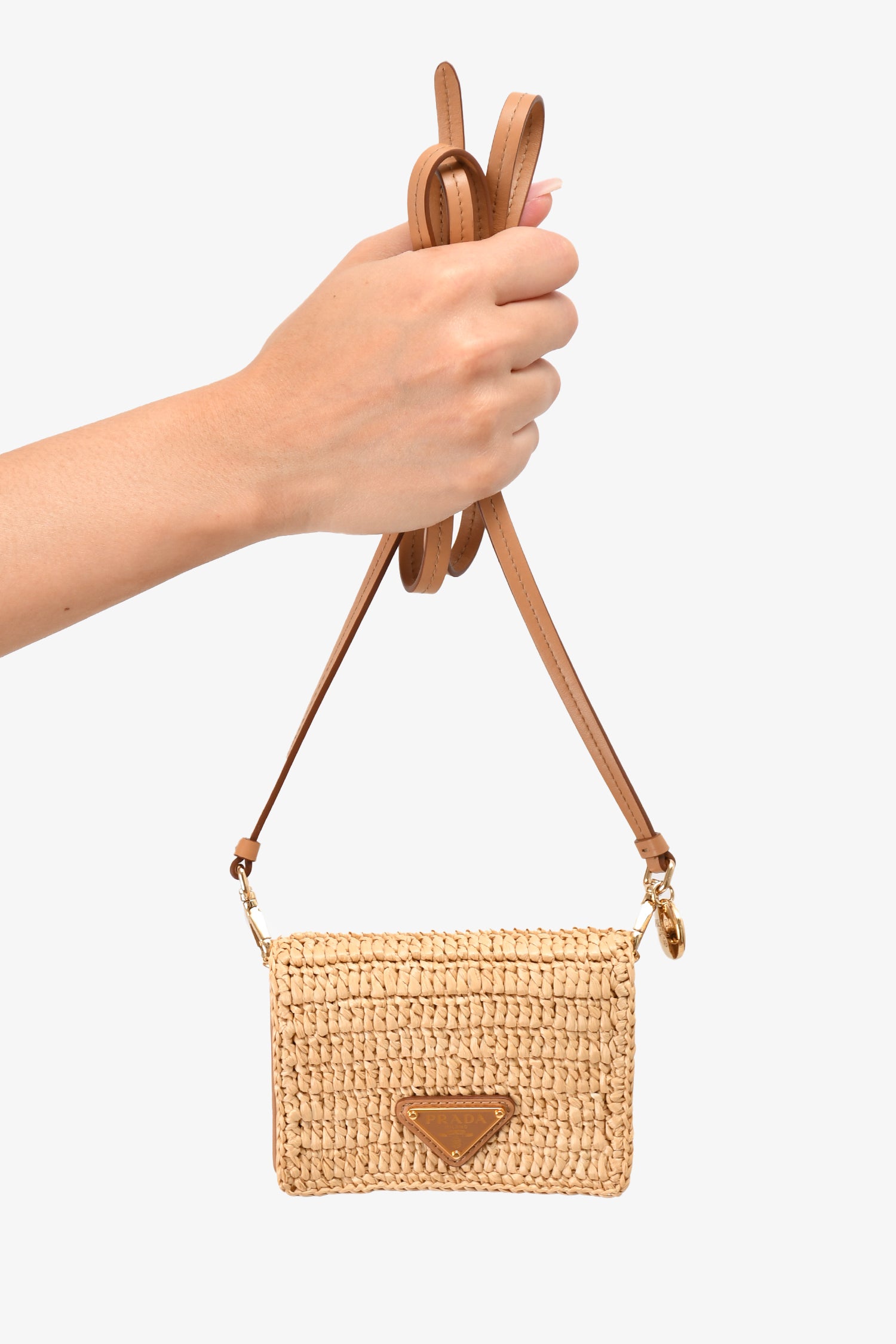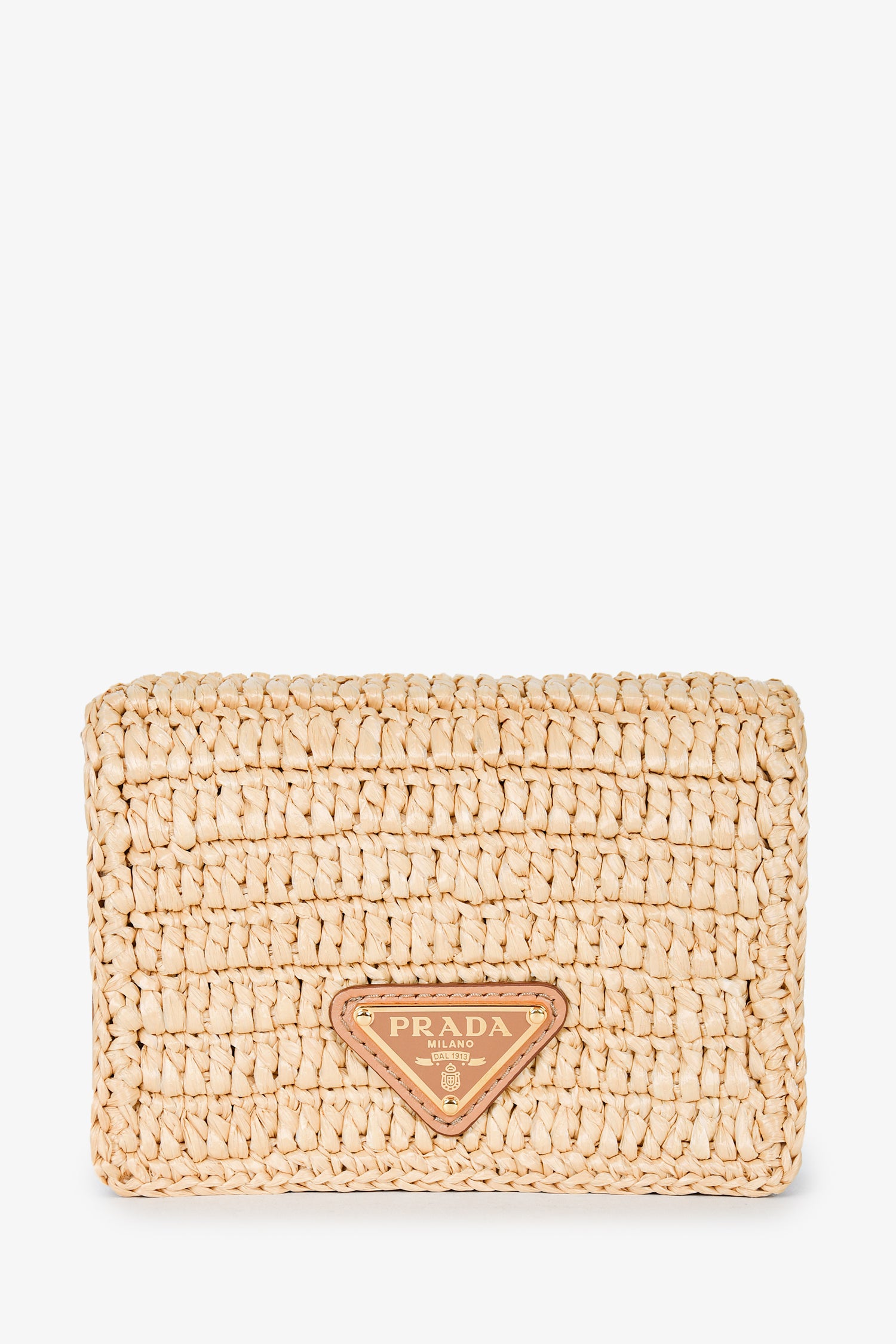 Refresh availabilityPrada Beige Crochet Cardholder with Crossbody Strap. Fold-over crochet flap with snap closure. Tonal top stitching. Gold-toned hardware. Adjustable and detachable crossbody strap. Single interior compartment.