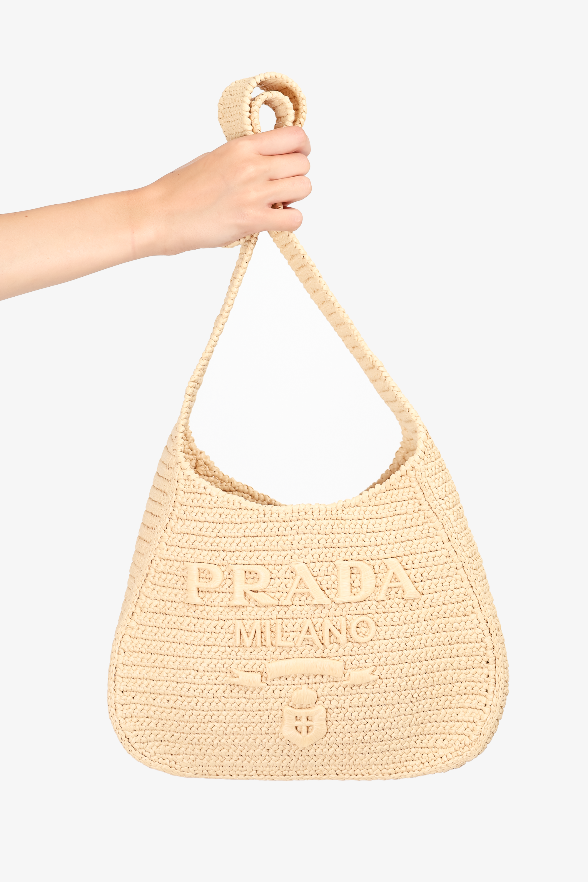 Refresh availabilityPrada Beige Logo-Embossed Raffia Shoulder Bag. Tie closure. Open interior. Tonal stitching.