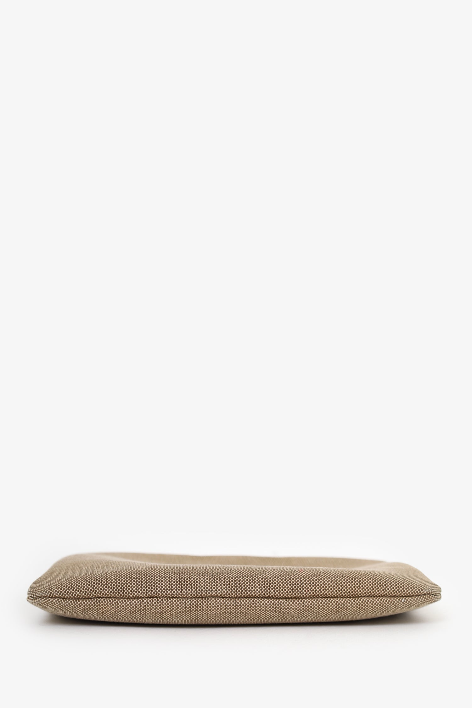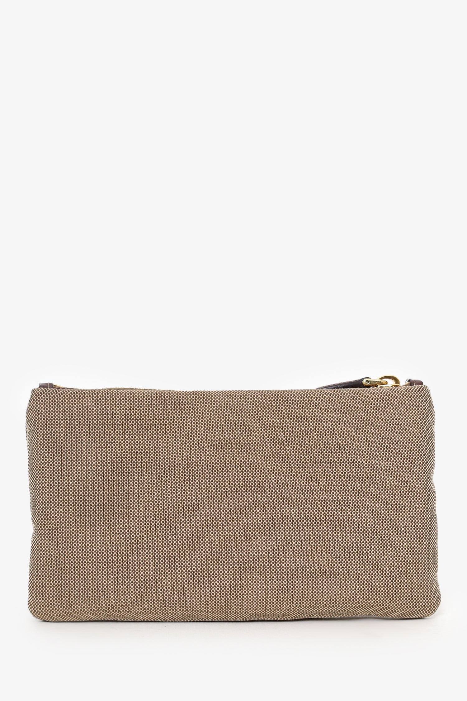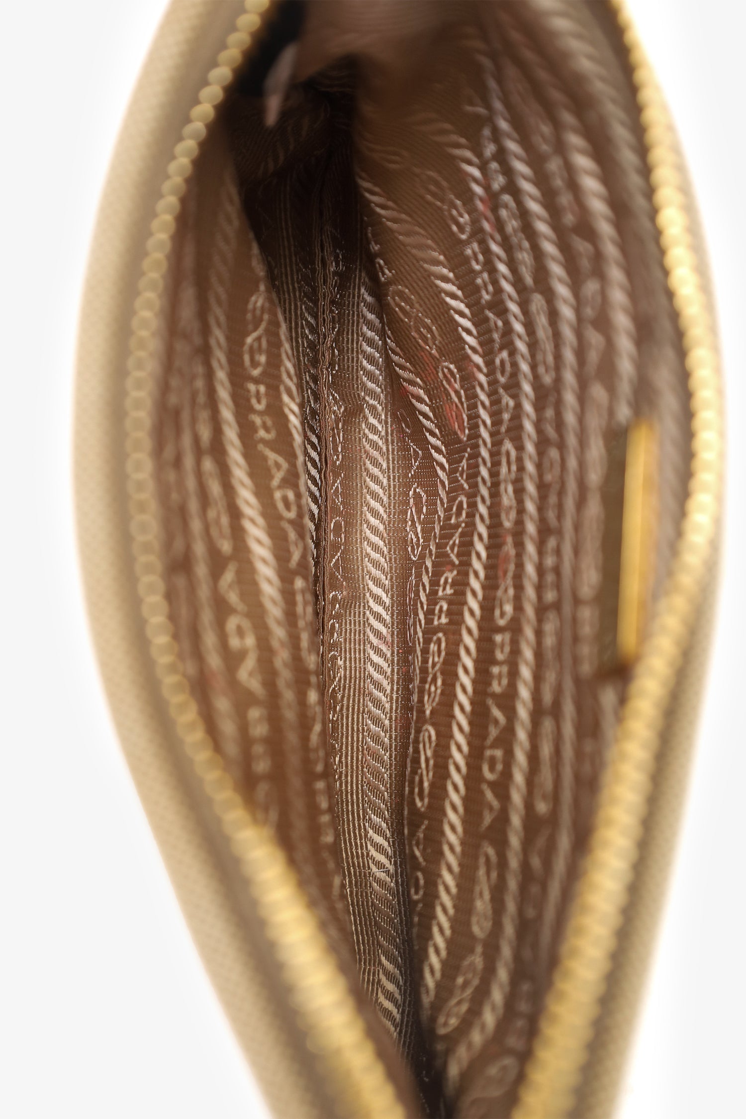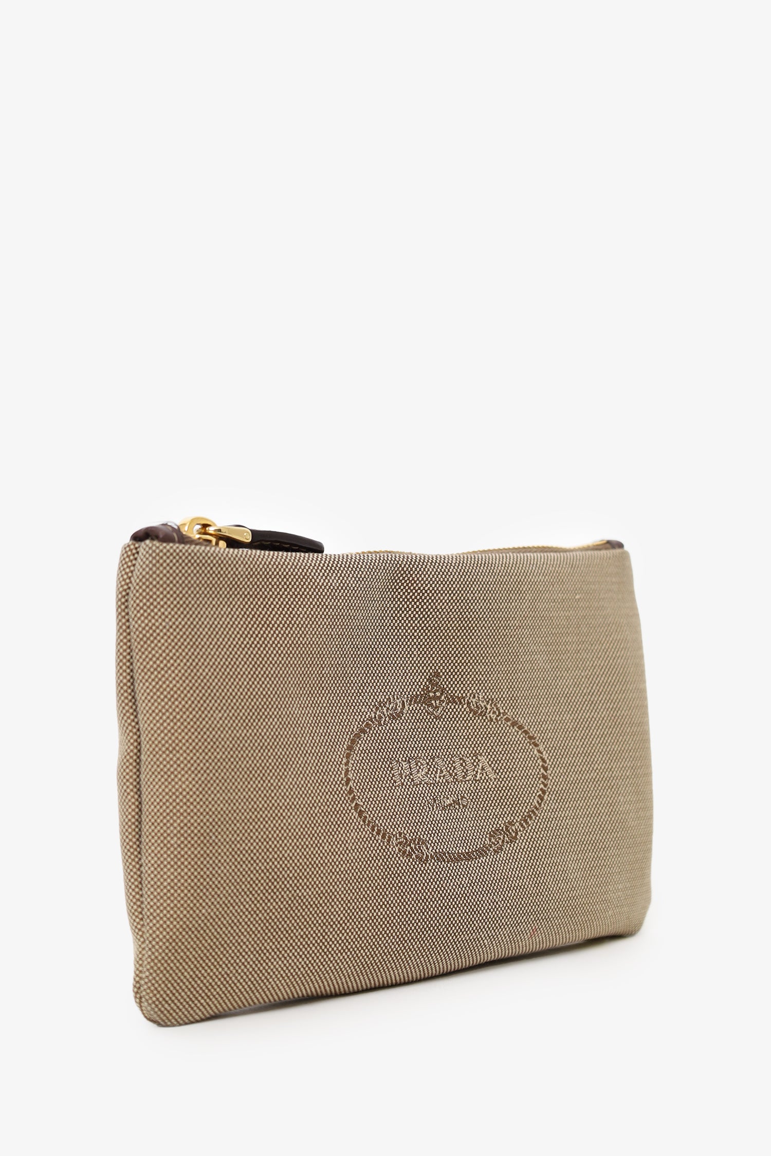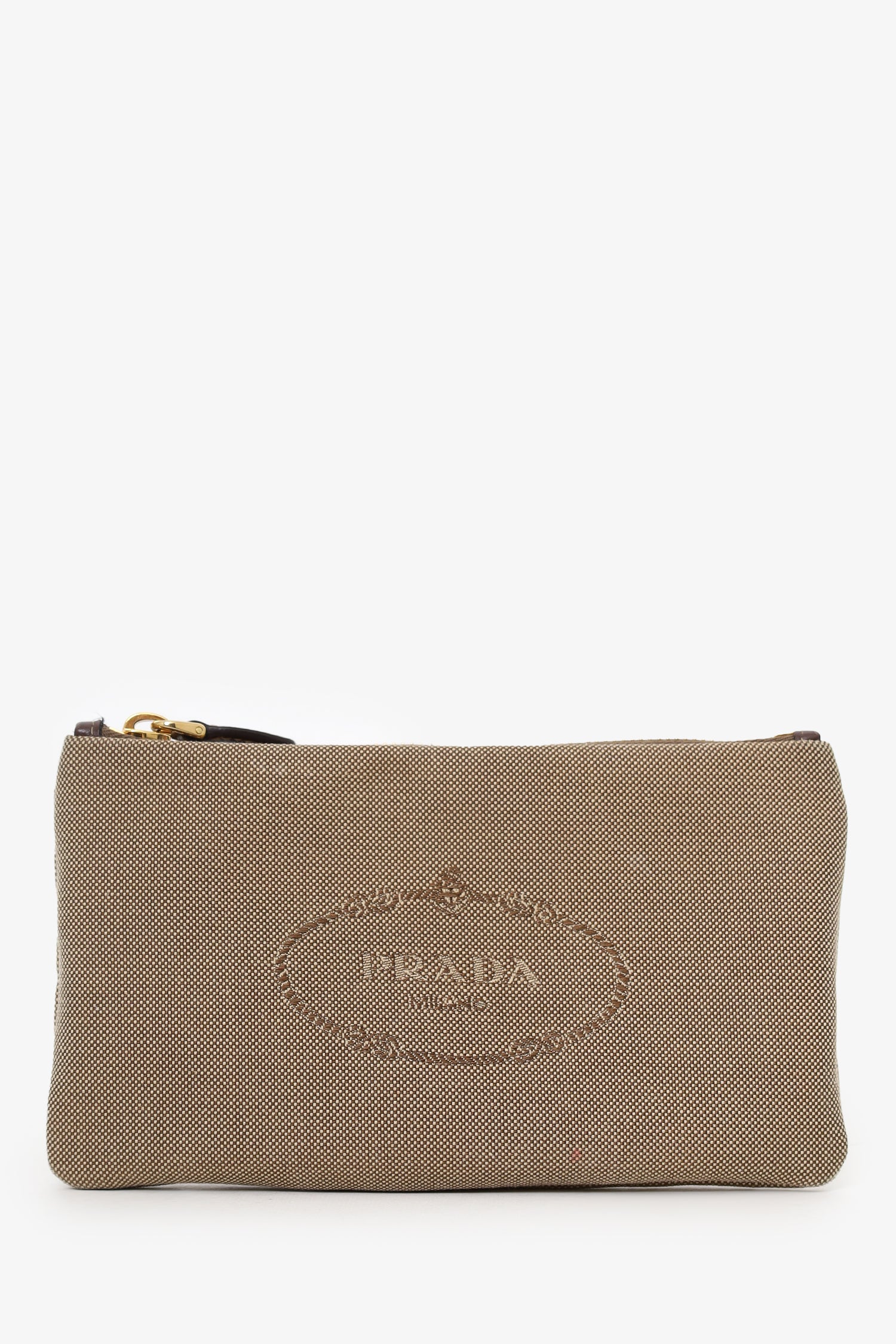 Refresh availabilityPrada Beige Logo Jacquard Canapa Clutch. Top zip closure. Open lined interior. Gold-tone hardware. Tonal stitching.