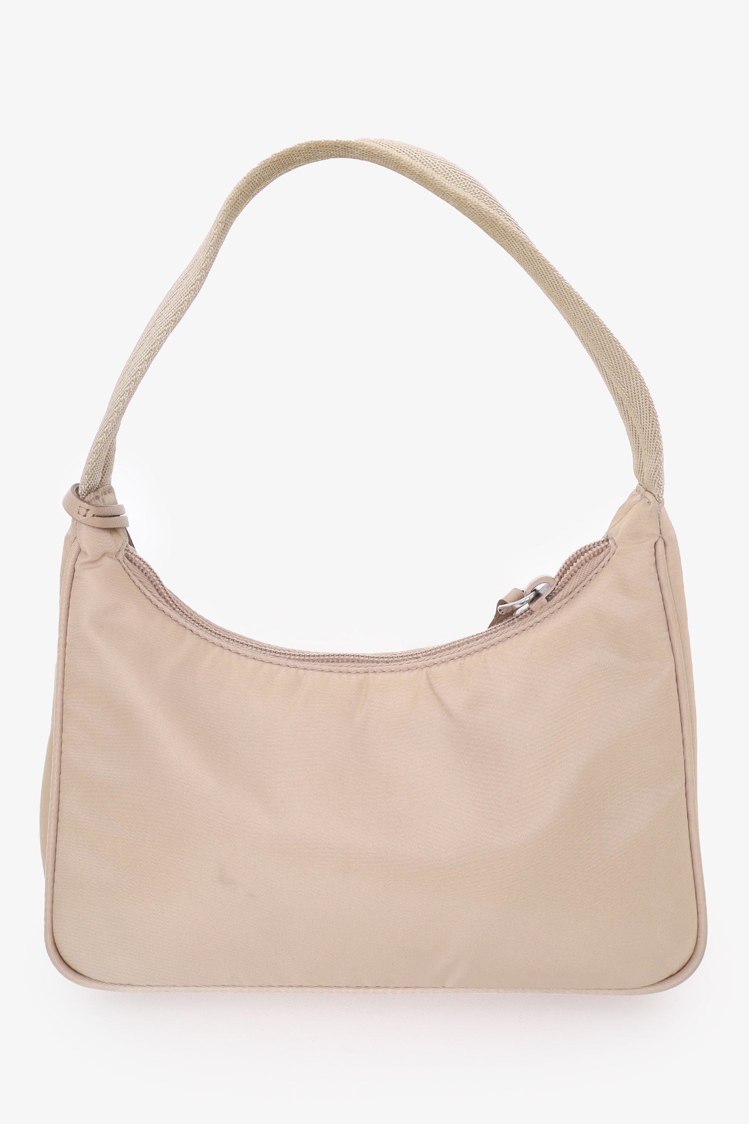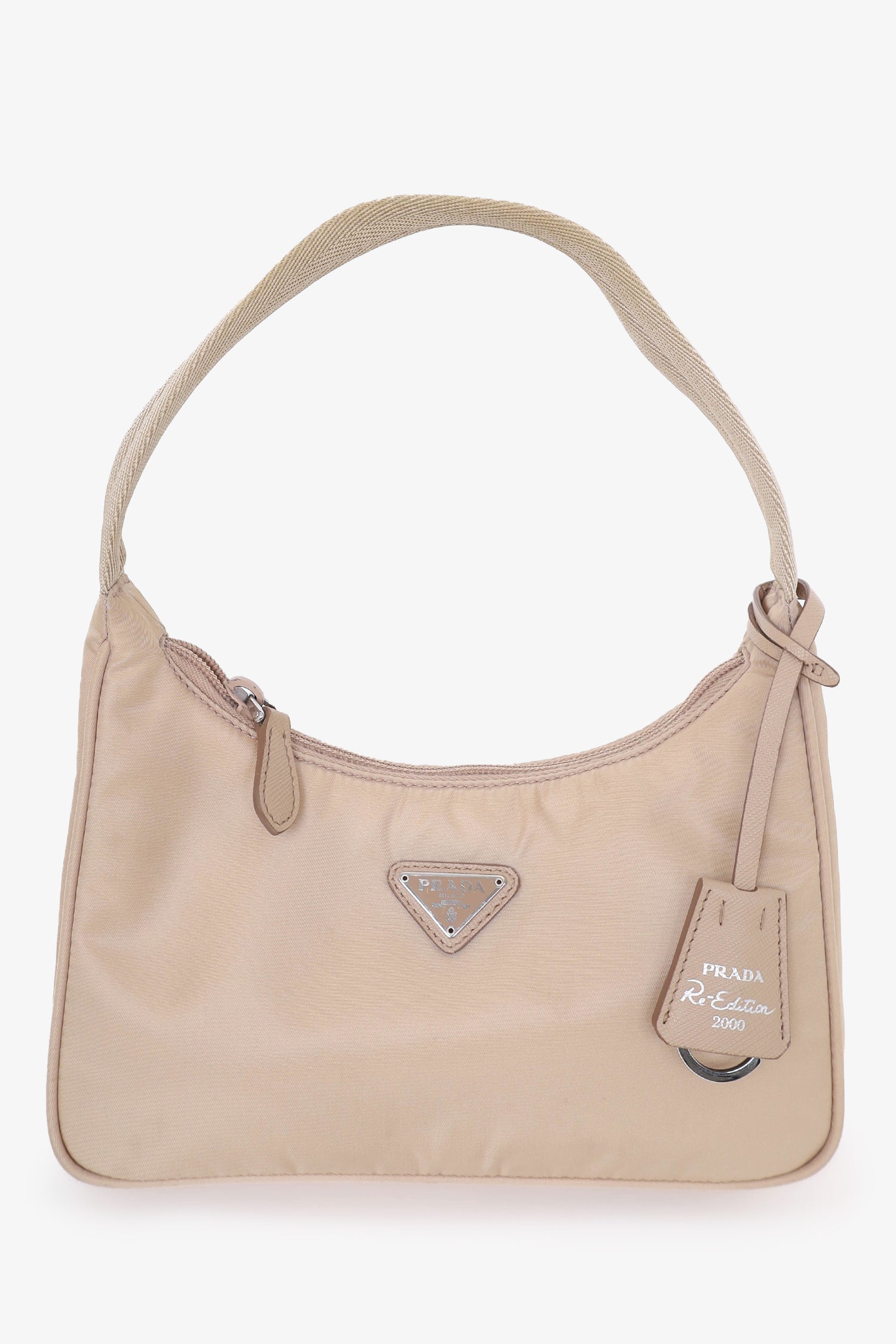 Refresh availabilityPrada Beige Nylon Re-Edition 2000 Shoulder Bag. Top zip closure. Open interior. Removable clochette. Silver-tone hardware. Tonal stitching.