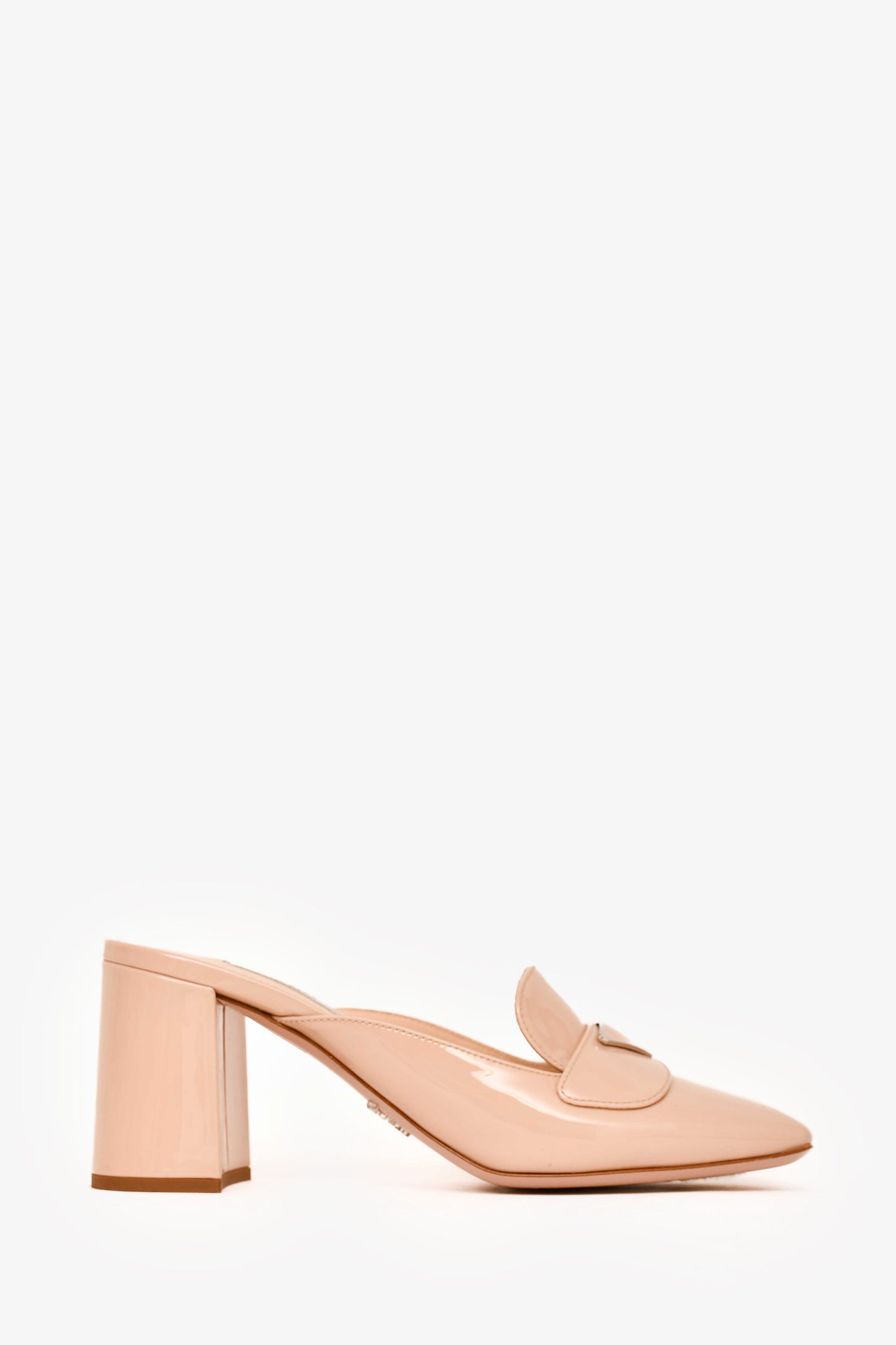 Refresh availabilityPrada Beige Patent Leather Triangle Logo Square Toe Mules. Silver-tone hardware. Slip-on. Tonal stitching.
