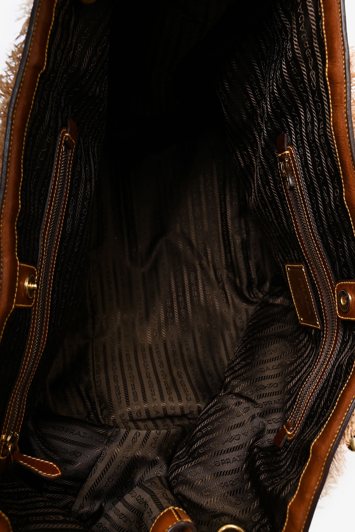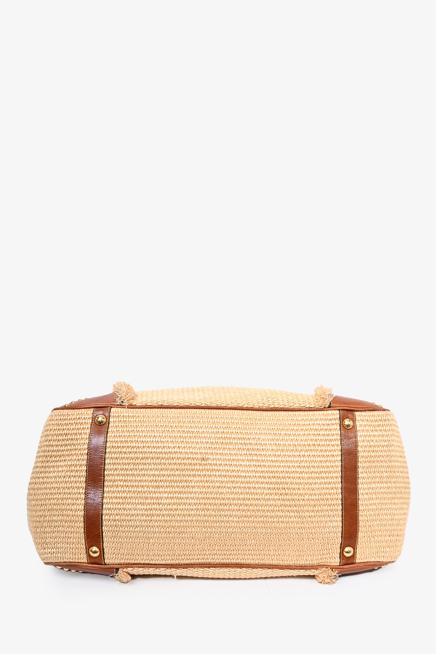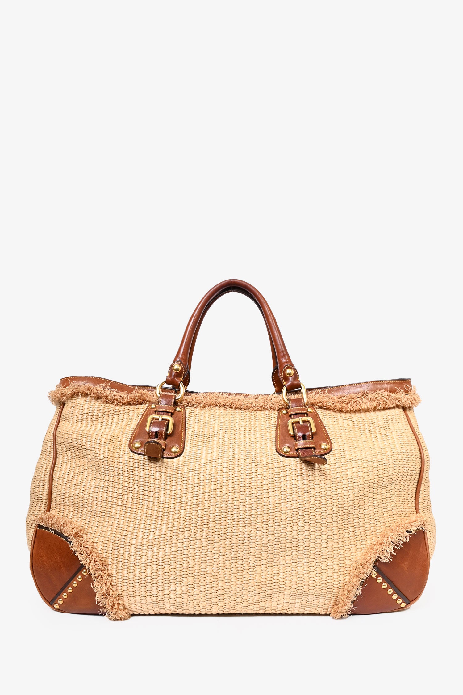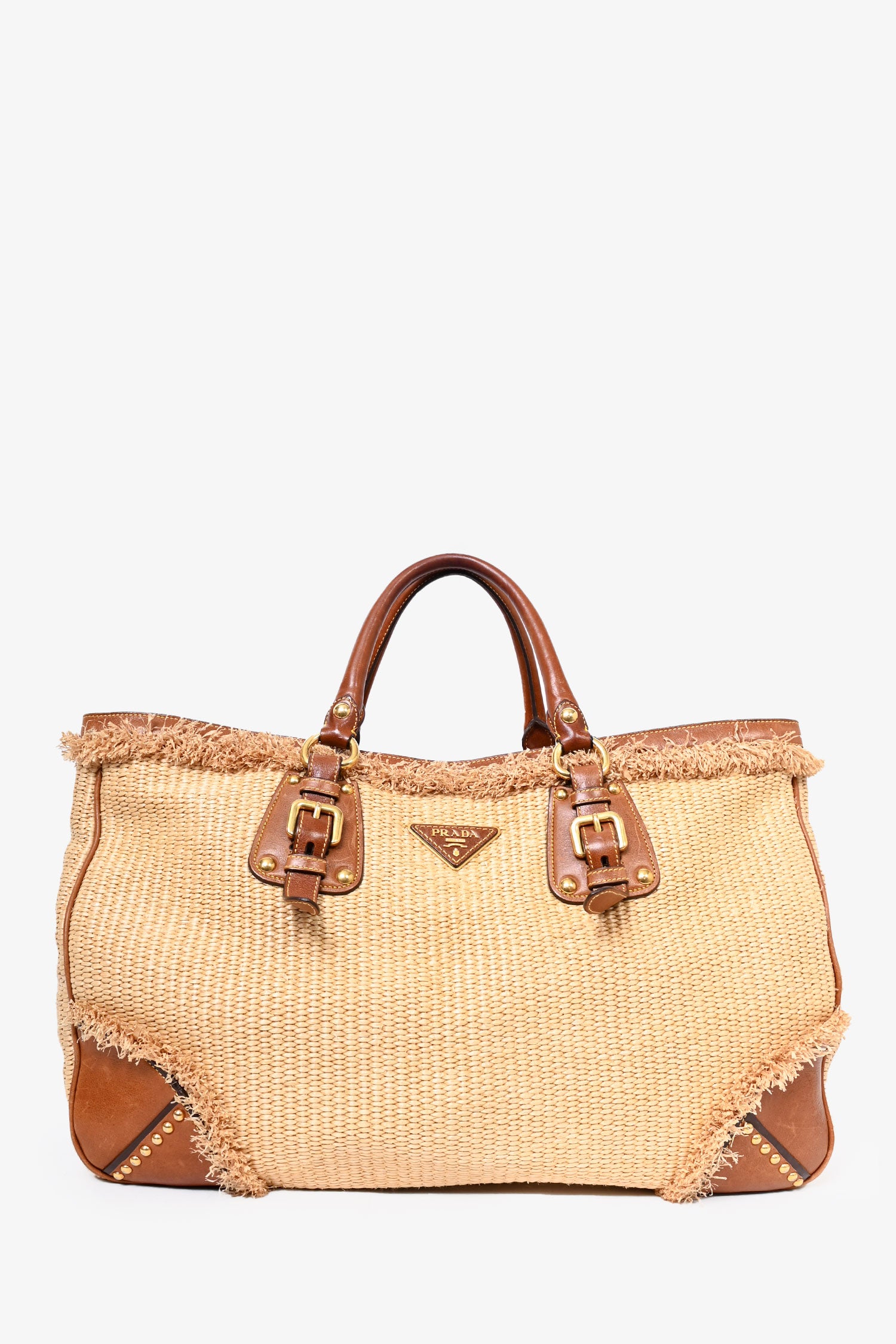 Refresh availabilityPrada Beige Raffia Brown Leather Trim Paglia Large Tote with Canvas Strap. Leather trimming. Gold-tone hardware. Dual handles. Lined interior with two zipped compartments. Studded detail throughout.